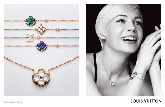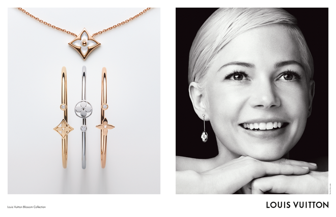 Para além de ser a musa das últimas campanhas Louis Vuitton, Michelle Williams é a nova imagem da campanha publicitária de joalharia da casa francesa. Fototrafada pelo icónico Patrick Demarchelier, a atriz americana personifica, de corpo e alma, a nova coleção de joalharia Color Blossom BB. "Gosto muito desta coleção, divertida e colorida, com o seu encanto e originalidade. É clássica e elegante ao mesmo tempo" revela Michelle, sobre esta linha de joias.