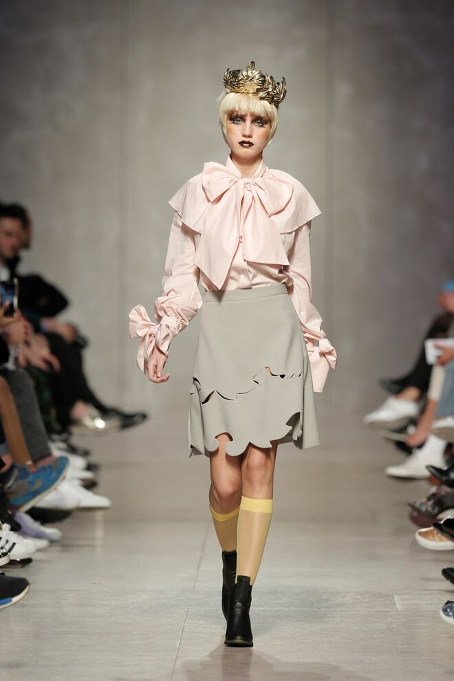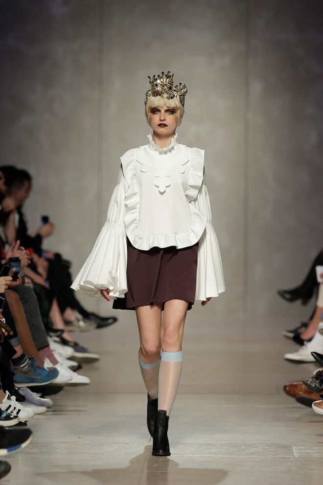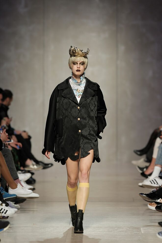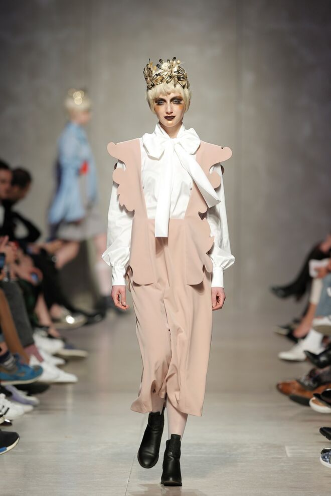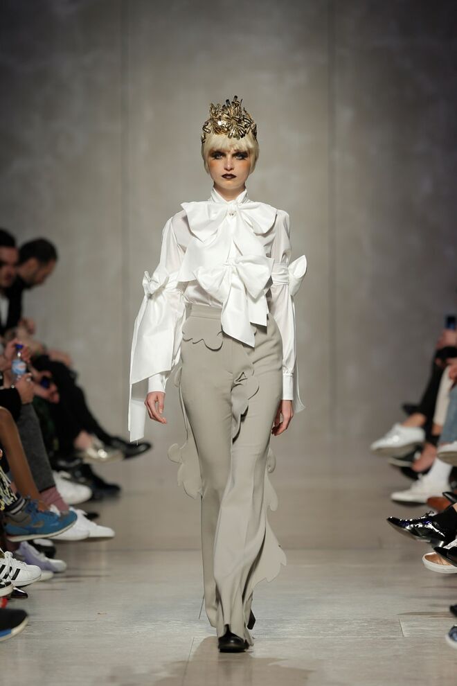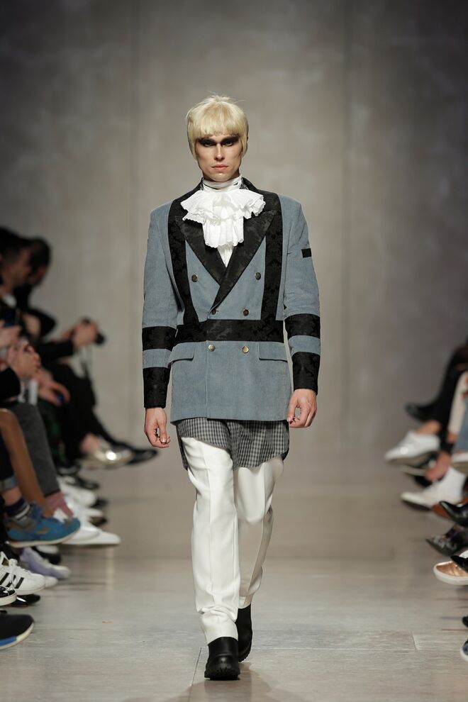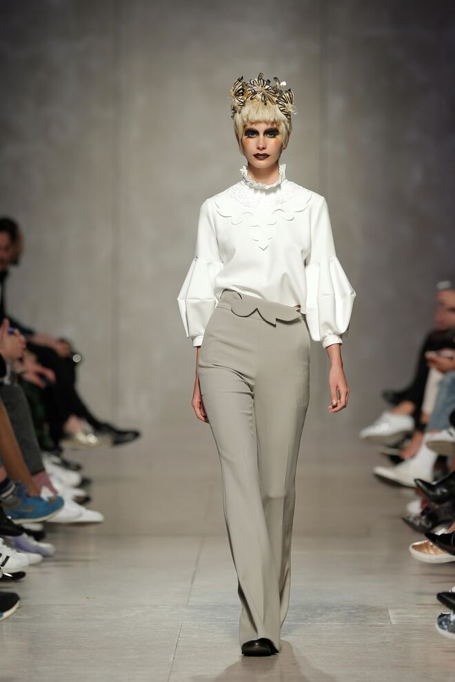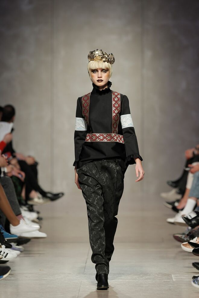 As bainhas recortadas com formas de elementos decorativos barrocos retirados dos interiores de palácios, mobiliário e outras peças decorativas. Sobreposições de painéis com as mesmas formas a criar uma ideia de relevo. Aplicação dos mesmos recortes em palas de bolsos, badanas, encaixes, cós, etc. Detalhes decorativos em pontos manuais macro feitos com fitas de tecidos e furos nas peças e motivos bordados com a mesma técnica. Folhos e franzidos a criar volumes em várias partes das peças, laços faustosos, golas de renda e outros detalhes inspirados no guarda roupa da realeza mas trazidos para a atualidade.