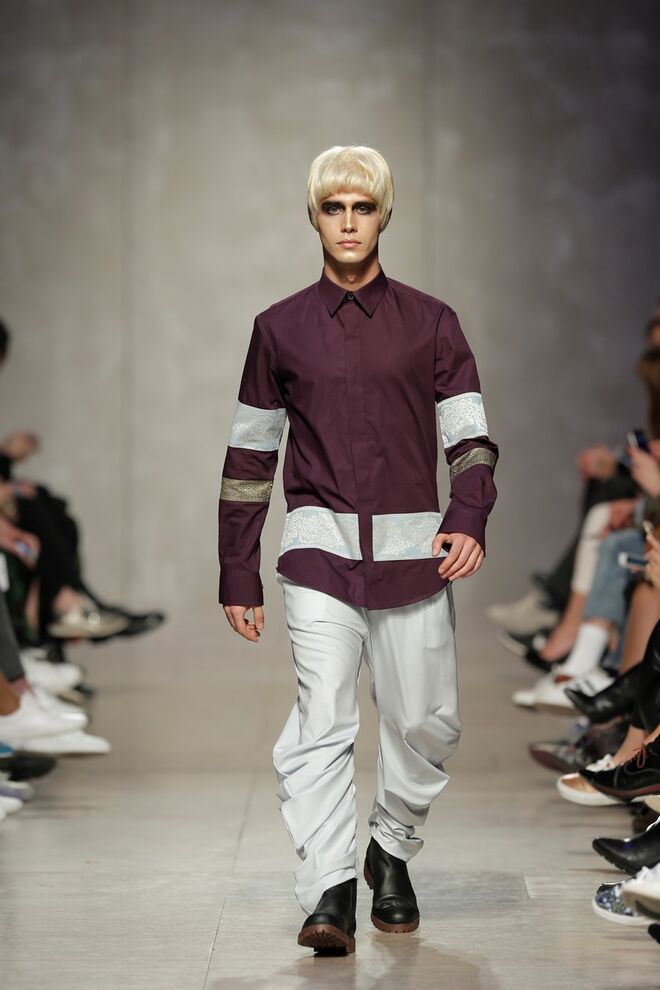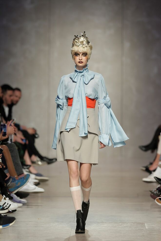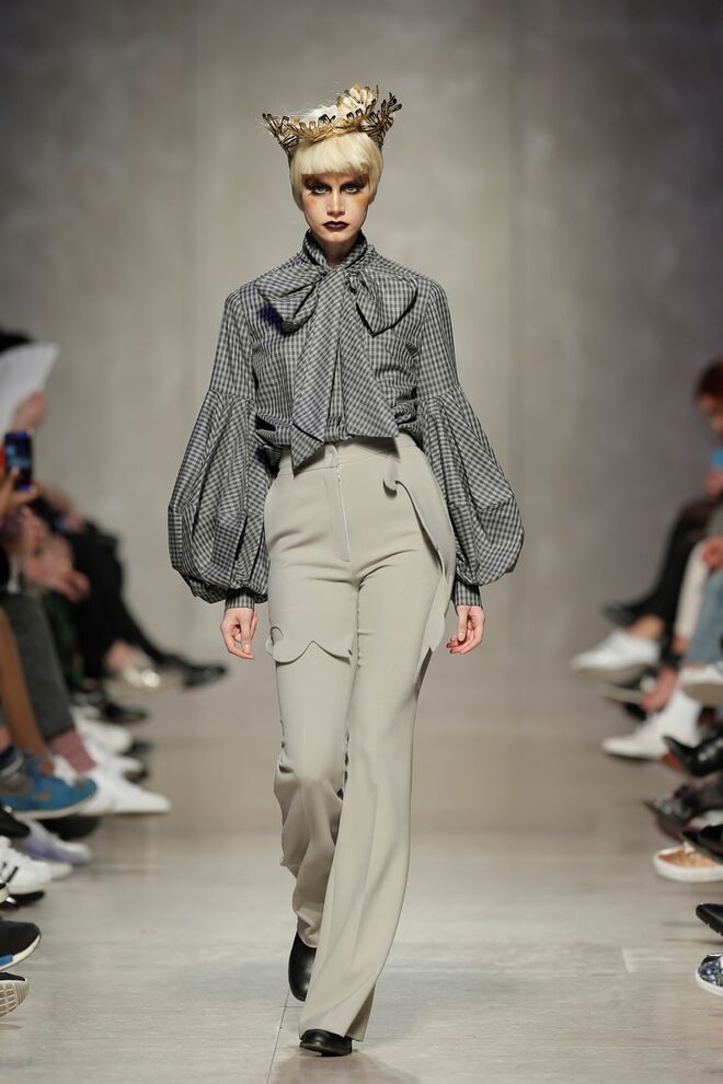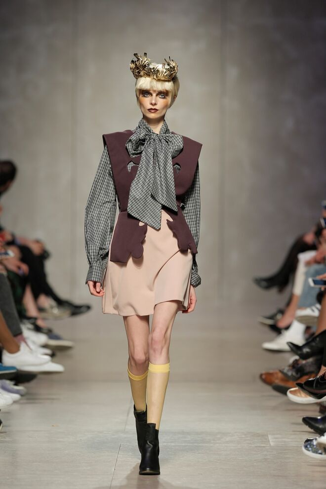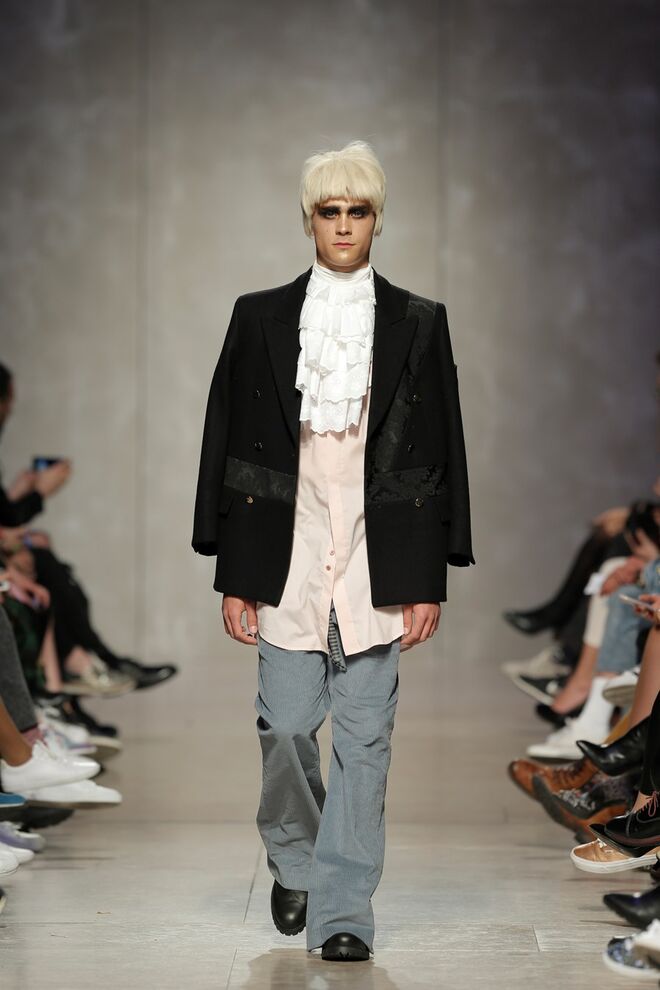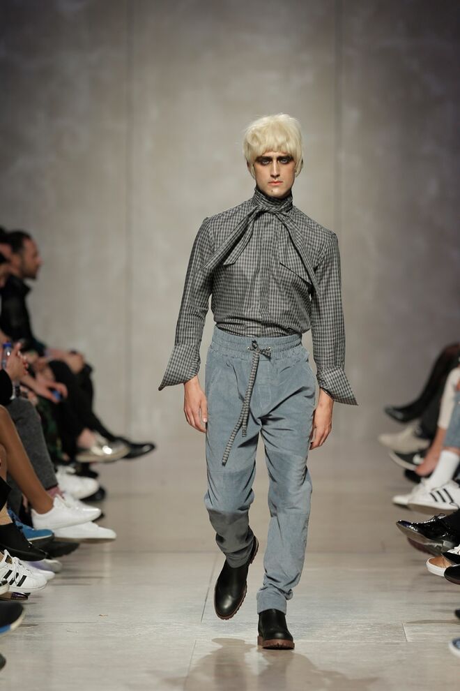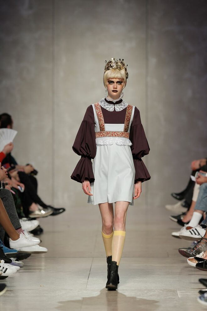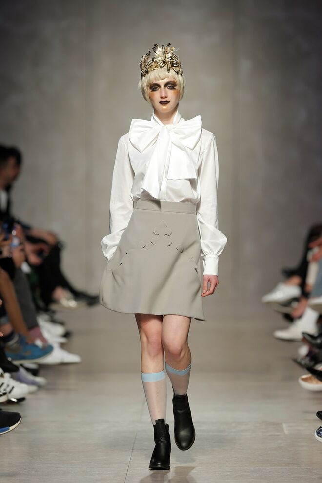 As bainhas recortadas com formas de elementos decorativos barrocos retirados dos interiores de palácios, mobiliário e outras peças decorativas. Sobreposições de painéis com as mesmas formas a criar uma ideia de relevo. Aplicação dos mesmos recortes em palas de bolsos, badanas, encaixes, cós, etc. Detalhes decorativos em pontos manuais macro feitos com fitas de tecidos e furos nas peças e motivos bordados com a mesma técnica. Folhos e franzidos a criar volumes em várias partes das peças, laços faustosos, golas de renda e outros detalhes inspirados no guarda roupa da realeza mas trazidos para a atualidade.