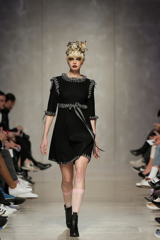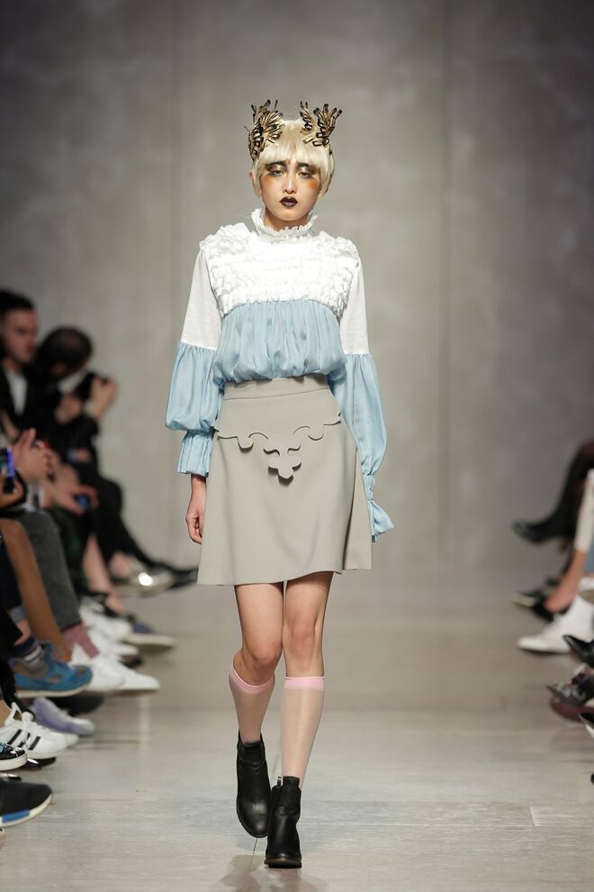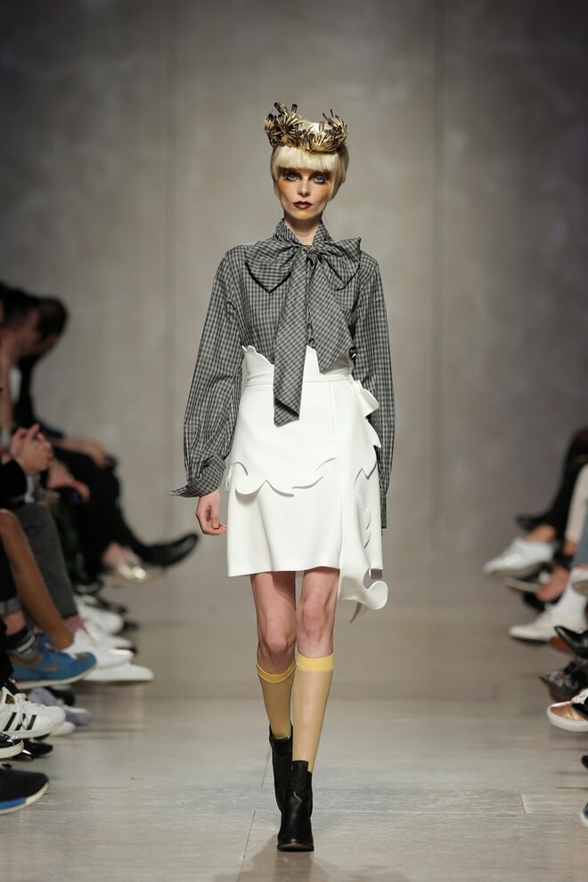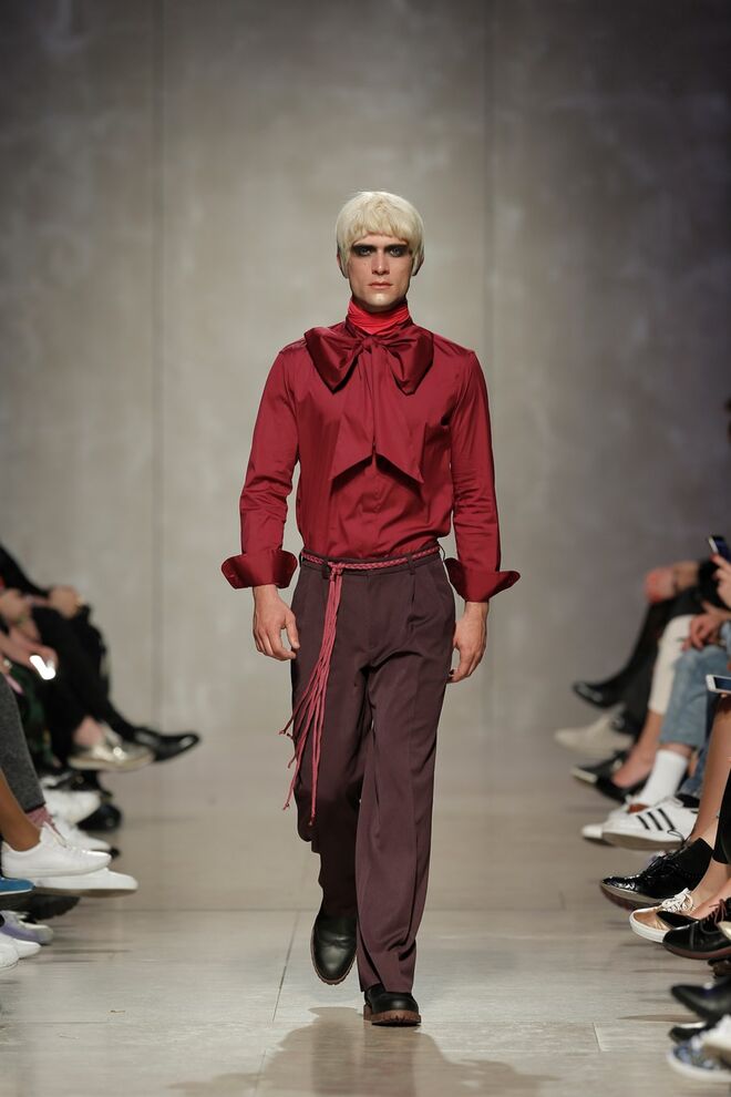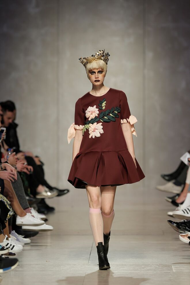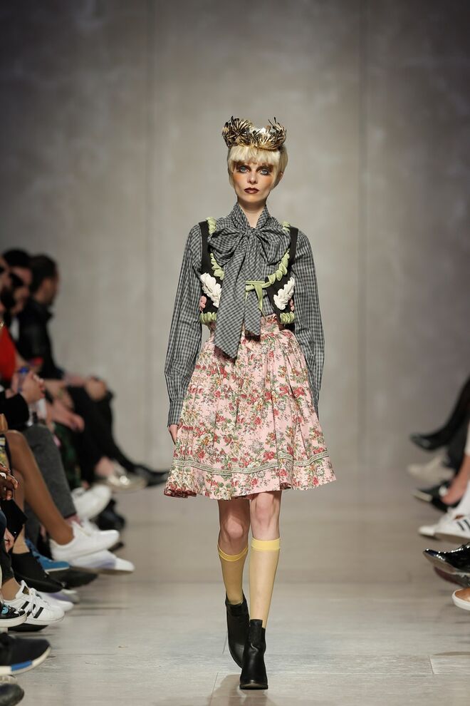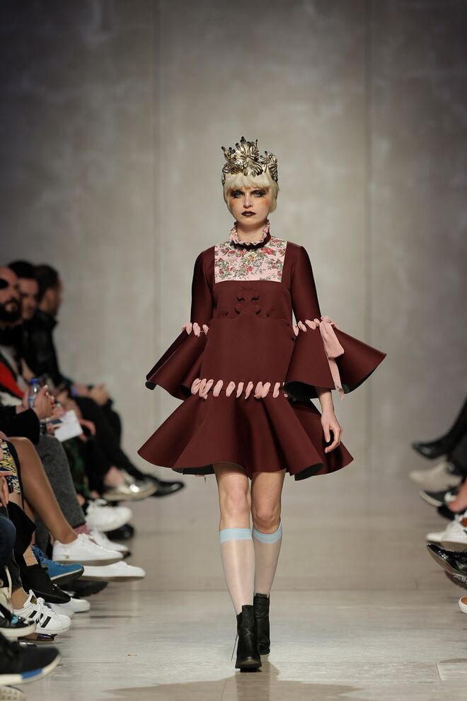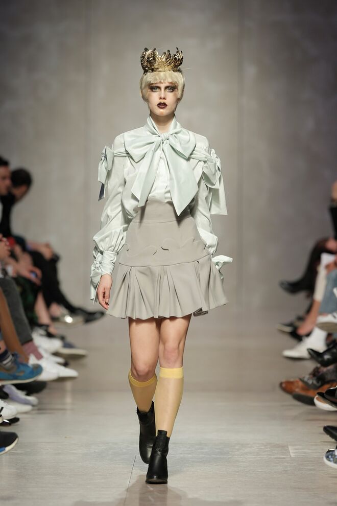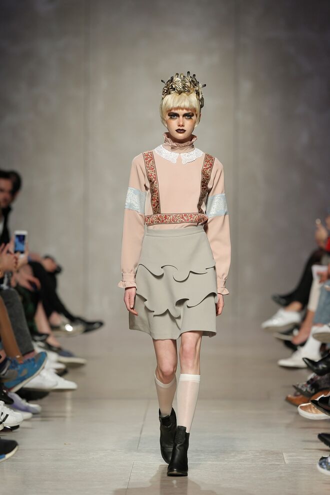 As bainhas recortadas com formas de elementos decorativos barrocos retirados dos interiores de palácios, mobiliário e outras peças decorativas. Sobreposições de painéis com as mesmas formas a criar uma ideia de relevo. Aplicação dos mesmos recortes em palas de bolsos, badanas, encaixes, cós, etc. Detalhes decorativos em pontos manuais macro feitos com fitas de tecidos e furos nas peças e motivos bordados com a mesma técnica. Folhos e franzidos a criar volumes em várias partes das peças, laços faustosos, golas de renda e outros detalhes inspirados no guarda roupa da realeza mas trazidos para a atualidade.