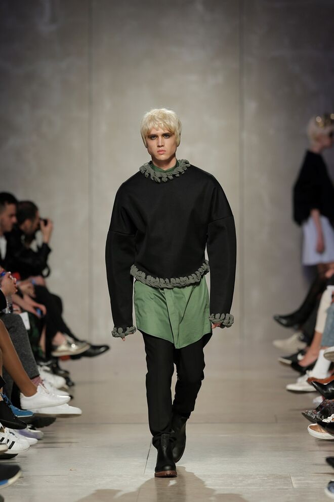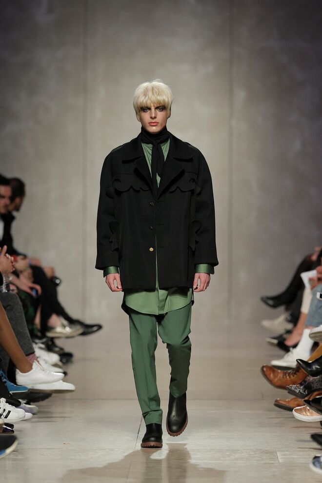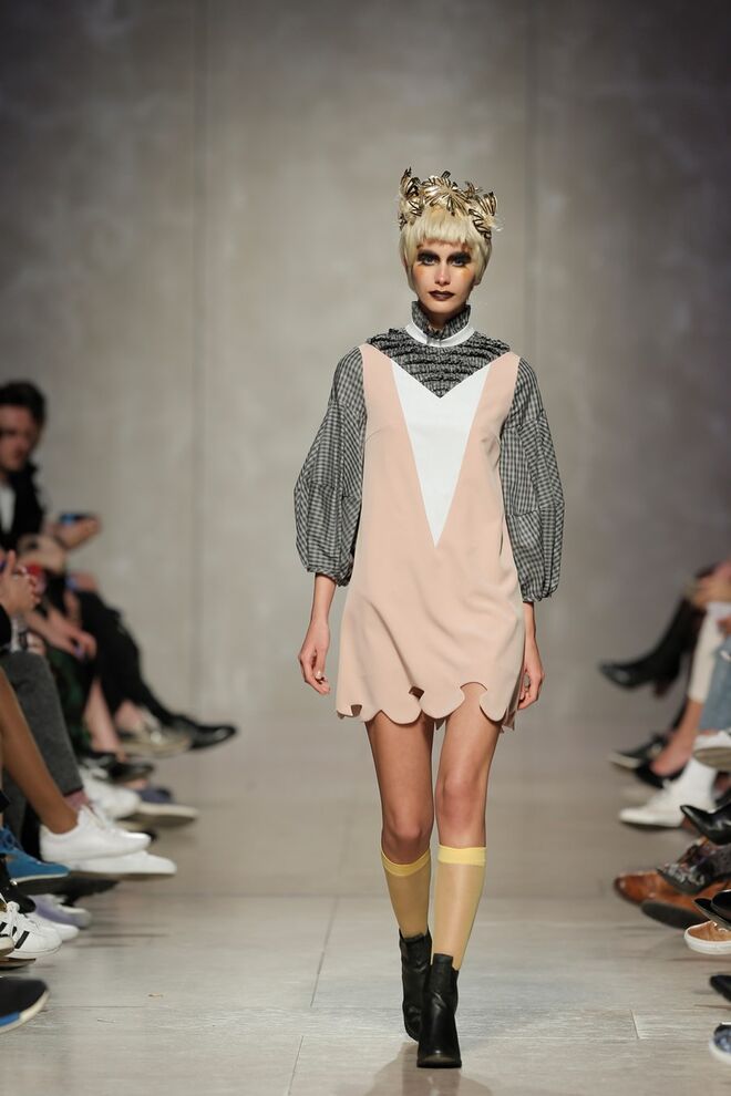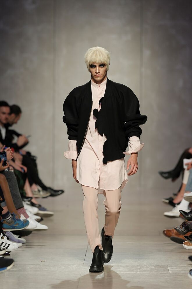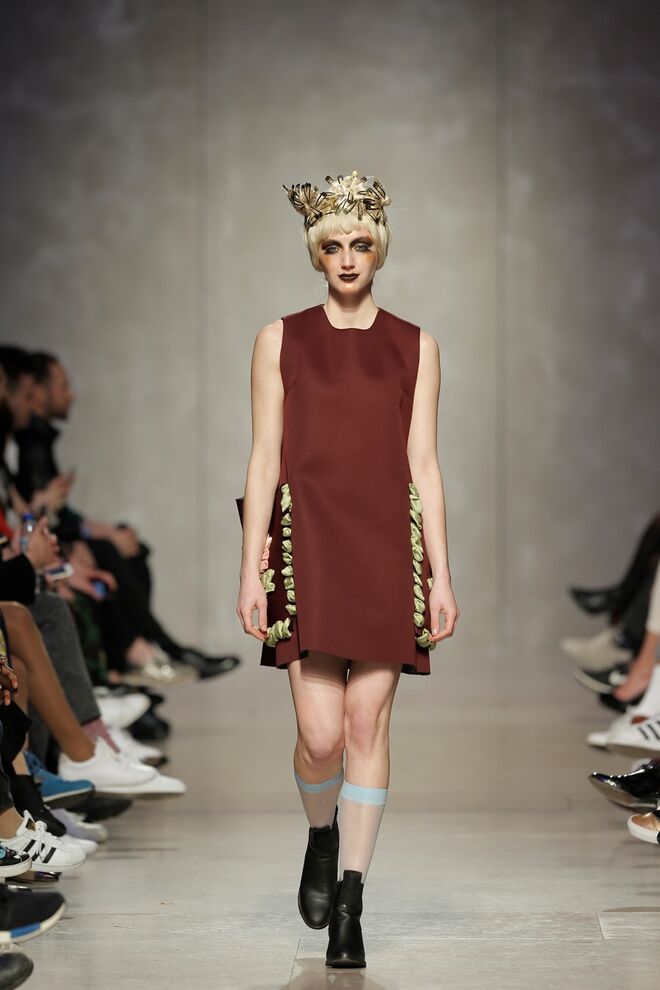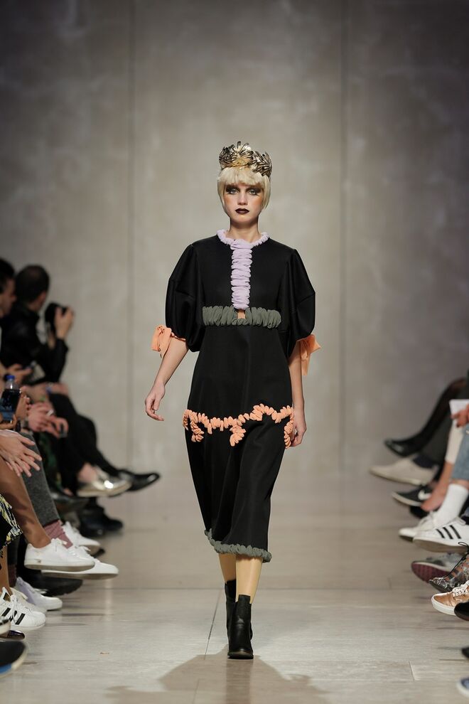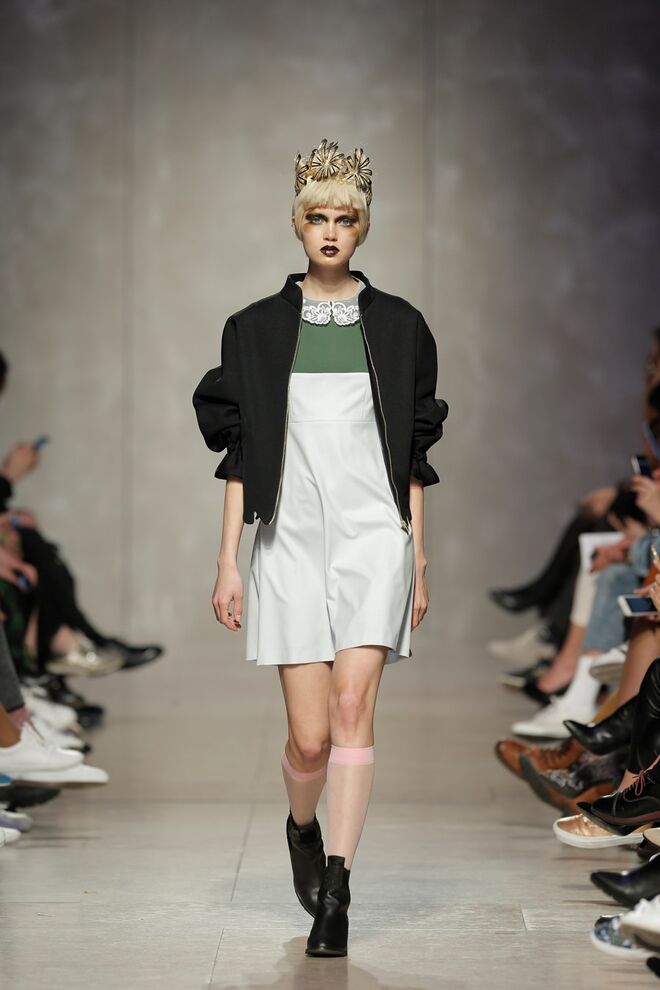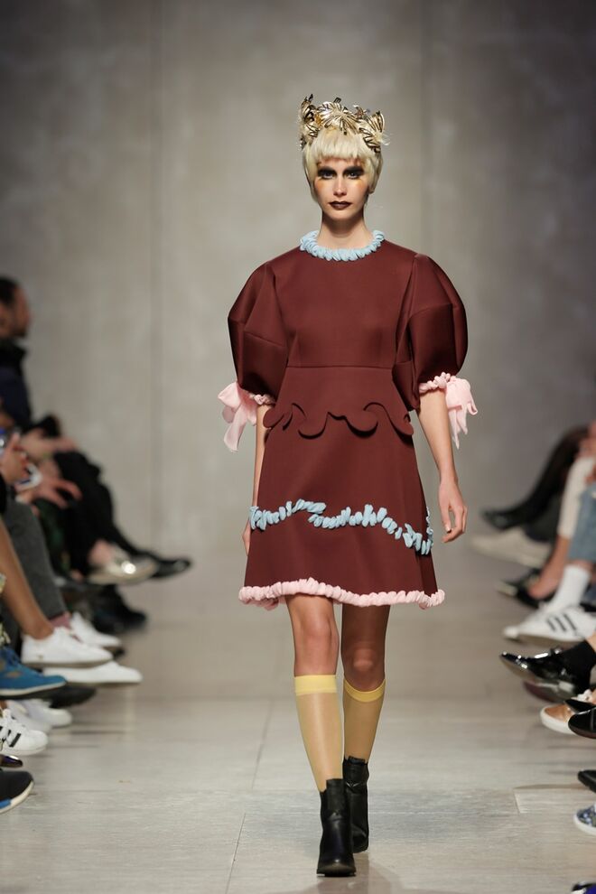 As bainhas recortadas com formas de elementos decorativos barrocos retirados dos interiores de palácios, mobiliário e outras peças decorativas. Sobreposições de painéis com as mesmas formas a criar uma ideia de relevo. Aplicação dos mesmos recortes em palas de bolsos, badanas, encaixes, cós, etc. Detalhes decorativos em pontos manuais macro feitos com fitas de tecidos e furos nas peças e motivos bordados com a mesma técnica. Folhos e franzidos a criar volumes em várias partes das peças, laços faustosos, golas de renda e outros detalhes inspirados no guarda roupa da realeza mas trazidos para a atualidade.