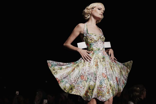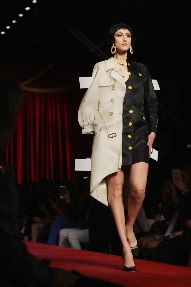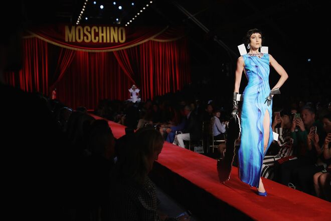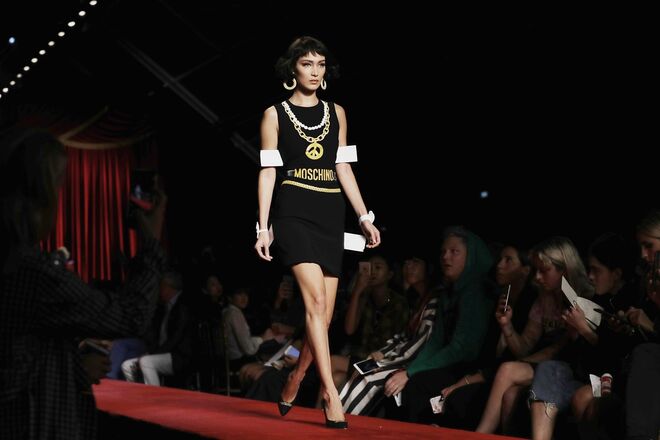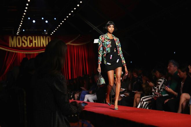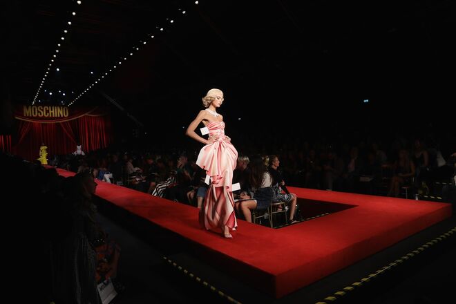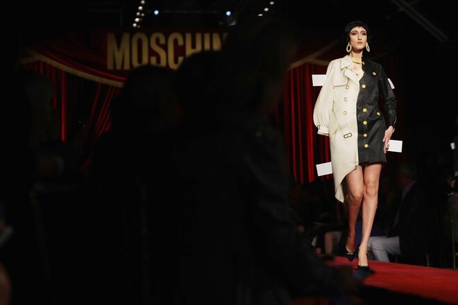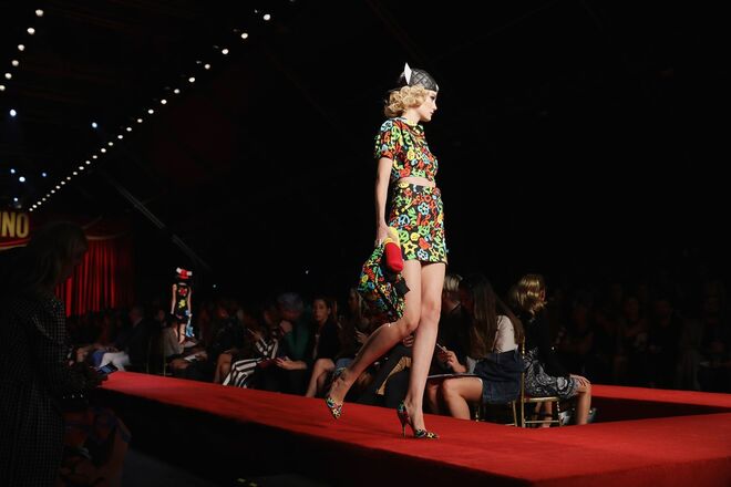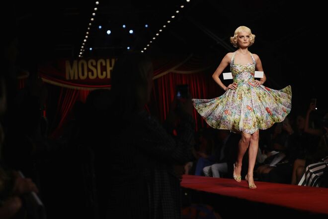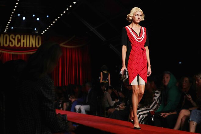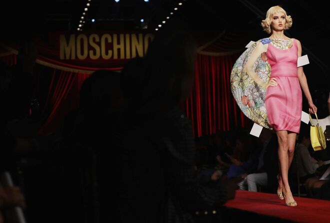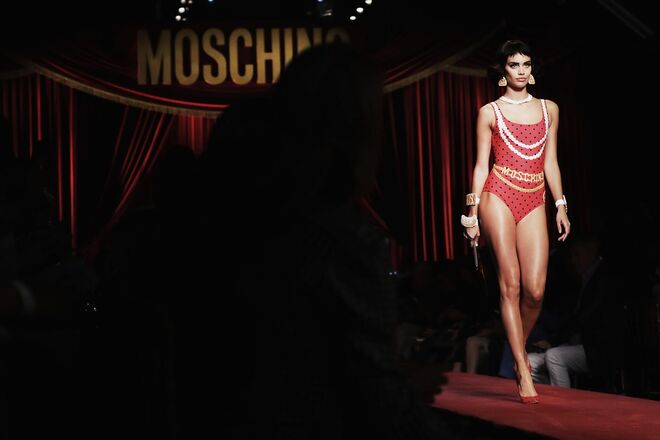 Inspirado no cenário rocambolesco de cabaret dos anos de Moulin Rouge, Jeremy Scott apresentou uma coleção sedutora, com algumas formas dos anos 60, como as saias rodadas e dos anos 60, como os polka dots, em Milão. O lettering original mantém-se, dos fatos de banho aos conjuntos, com frases icónicas como "This is not a Moschino toy".