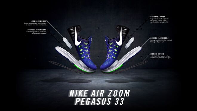 O legado de performance da marca faz com que os designers da Nike continuem a tentar evoluir as principais características deste modelo, utilizando as tecnologias em constante evolução. A mais recente versão deste ícone são os Nike Air Zoom Pegasus 33, cuja principal característica é a existência do amortecimento Nike Air Zoom na parte dianteira da sola deste modelo. Combinado com a já existente camada na zona do calcanhar, oferece uma capacidade de resposta ainda maior e uma corrida ainda mais rápida em longas distâncias.