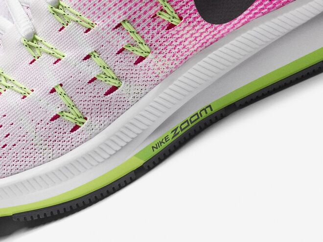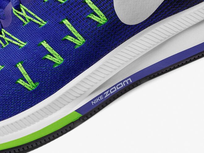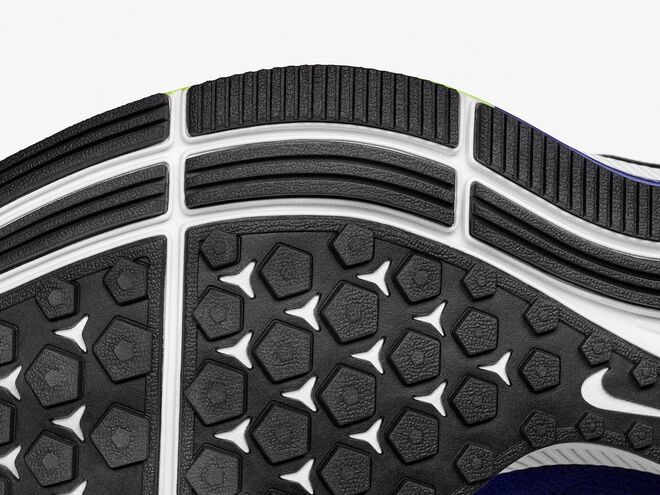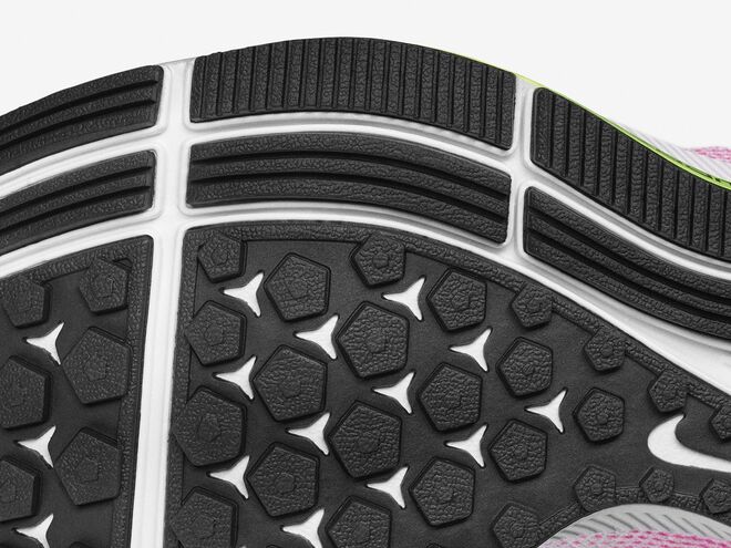 A sola intermédia Air Zoom, de espuma Cushlon, é conjugada com uma sola exterior de borracha. Combinando pistões flexíveis, que absorvem o impacto e preservam a liberdade de movimento com ranhuras que oferecem tracção e amortecimento, este modelo garante uma corrida suave.