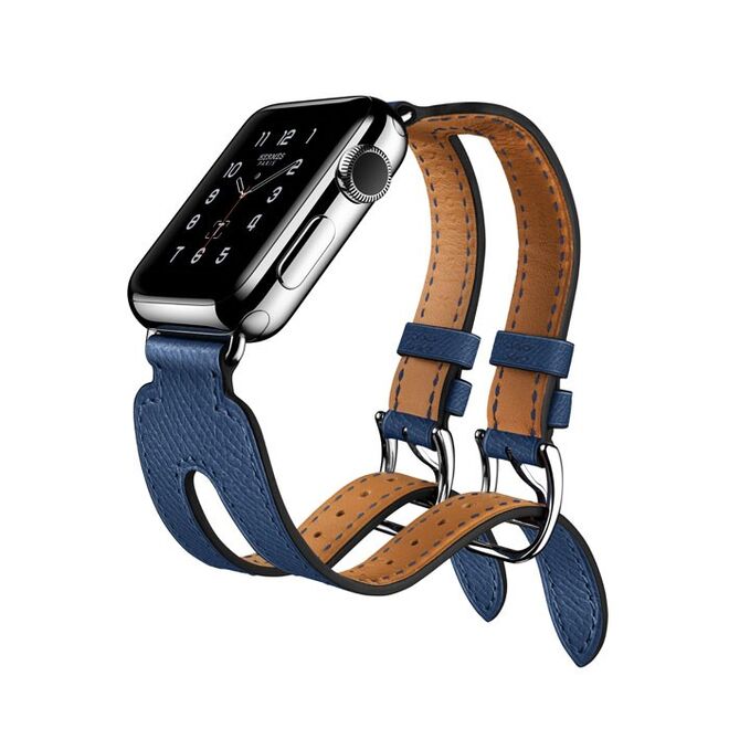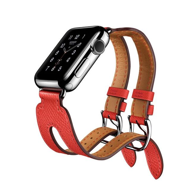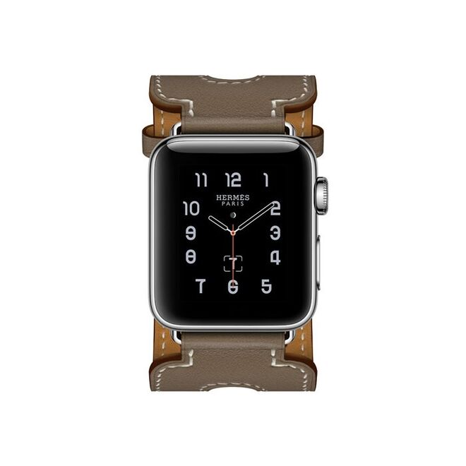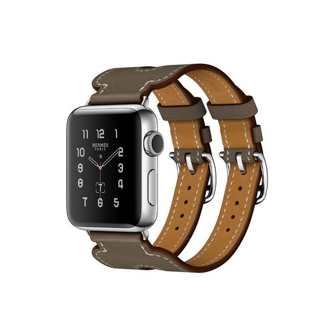 Esta expansão da coleção Apple Watch Hermès inclui um novo estilo – a dupla fivela Cuff em couro e pele de bezerro, inspirado nos desenhos de sandálias de Pierre Hardy, diretor criativo de sapatos e jóias Hermès, enquandrando elegantemente o punho em novas cores como Rosa Jaipur, Étoupe e Azul Àgata.