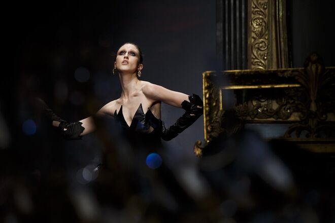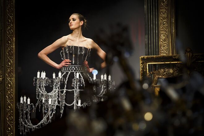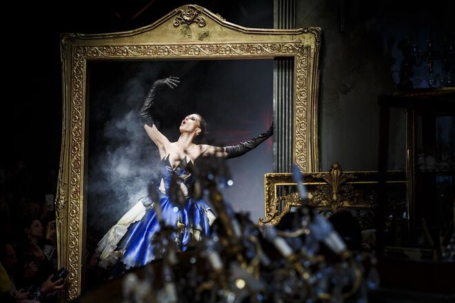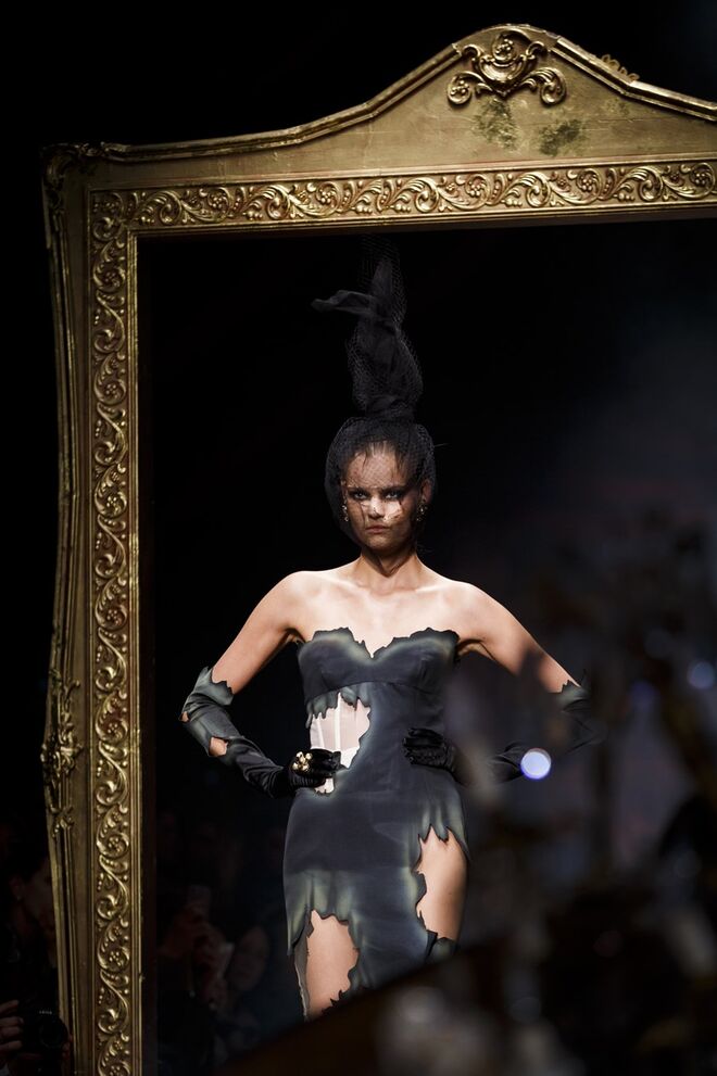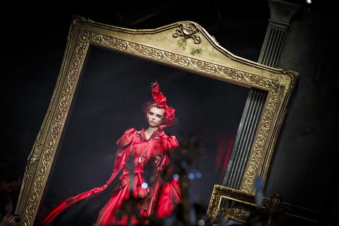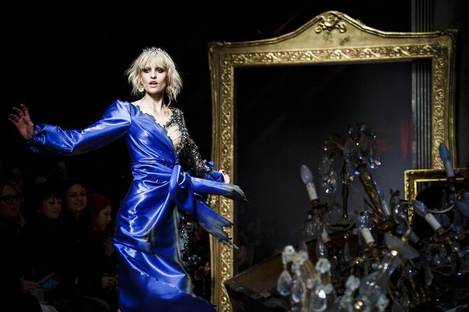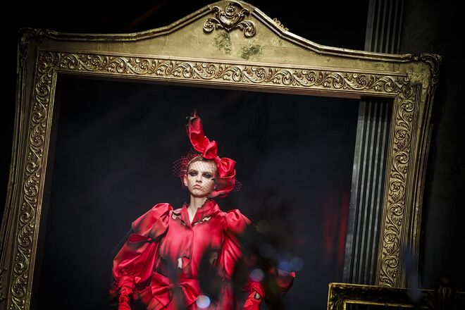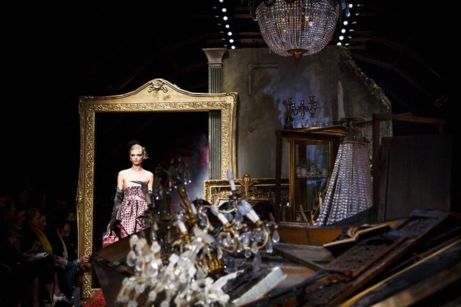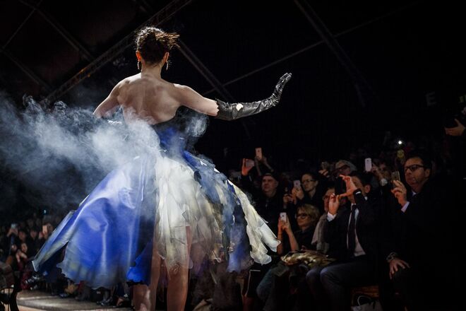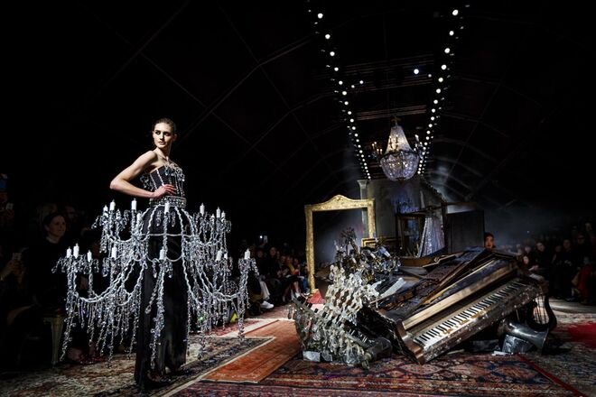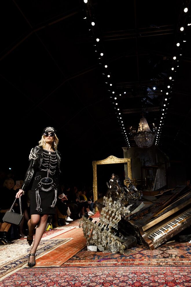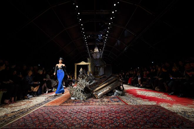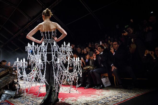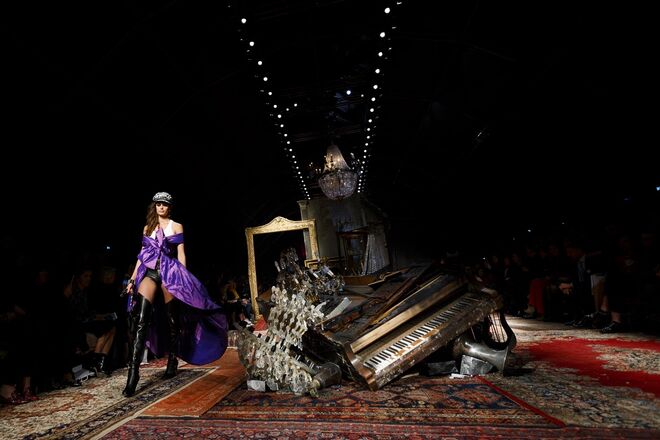 Um incêndio, em pleno desfile da nova coleção outono/inverno 2016-2017 apresentada por Jeremy Scott para a Moschino. Os vestidos em chamas, com fumo a sair em redor, num ambiente que nos remete para uma época vitoriana - seja nos tons roxos e vermelhos que preenchem a coleção, como na decoração (veja-se o piano partido no meio da passerelle ou nos espelhos dourados) ou até mesmo nos detalhes, como os candelabros incorporados nos vestidos.
