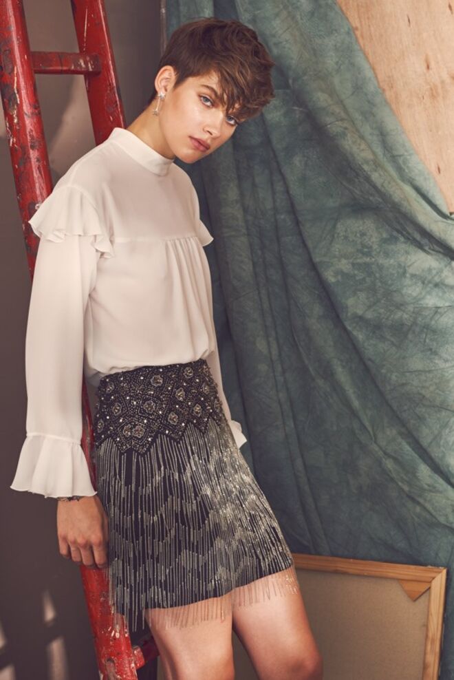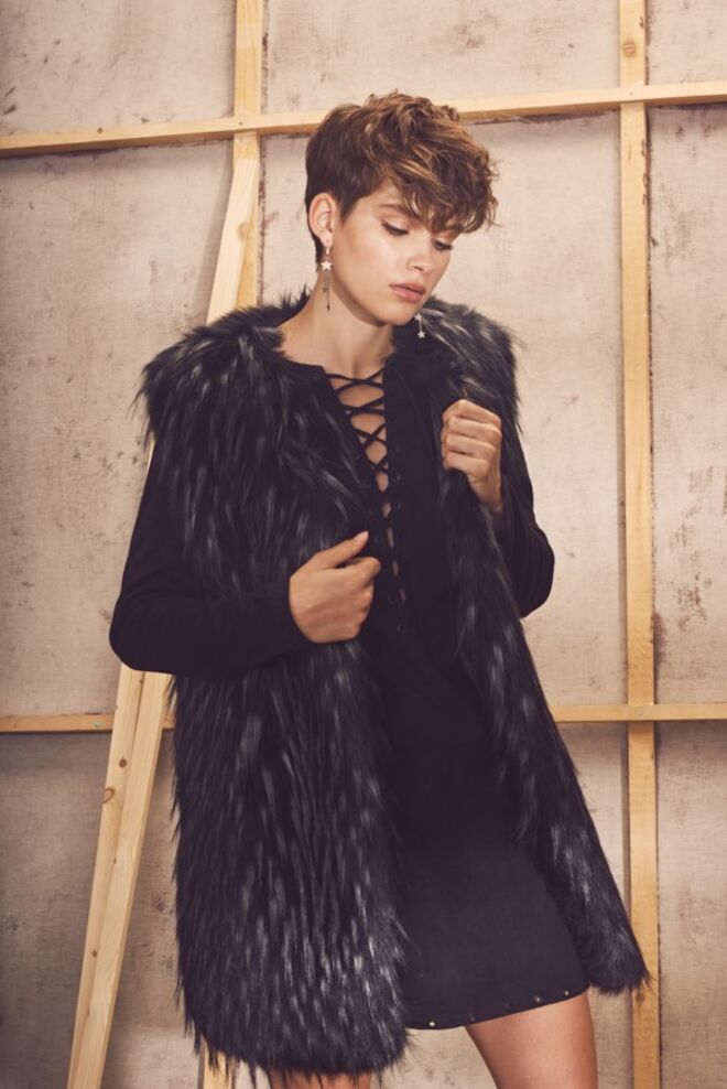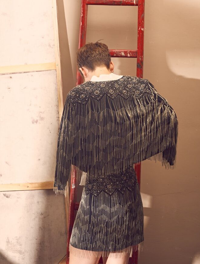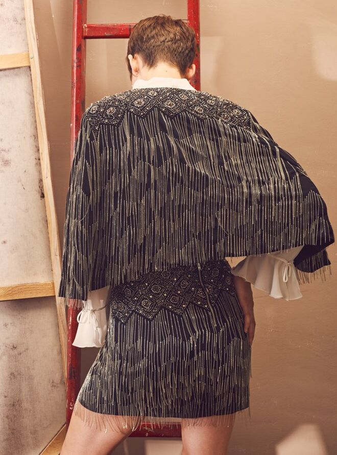Os coletes de pelo regressam com todo o protagonismo, assim como as peças com lantejoulas e aplicações - como é o caso de um dos conjuntos principais da coleção: uma saia e um casaco cravejados com estes elementos.