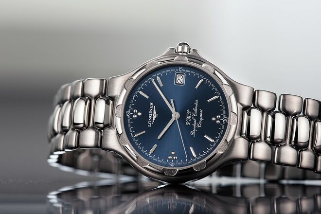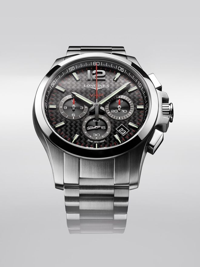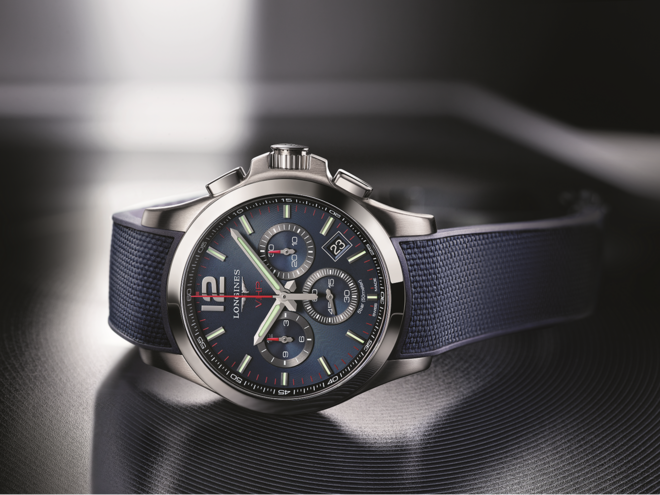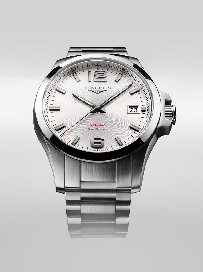 Em azul, carbono, prateado ou preto, o Conquest V.H.P. está disponível nas versões três ponteiros/calendário ou cronógrafo. Este último exibe as horas, minutos e segundos, um contador de 30 minutos às 3 horas, um contador de 12 horas às 9 horas e um contador de 60 segundos no centro.