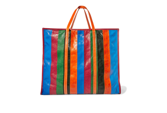 À primeira vista, faz lembrar aqueles sacos que são vendidos nos supermercados para levar as compras e a ironia de Demna Gvasalia, diretor criativo da marca, é mesmo essa. O novo saco de praia Balenciaga Bazar é feito em pele, às riscas verdes, azuis, pretas, laranjas e vermelhas.