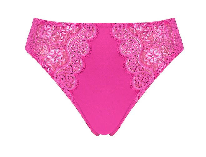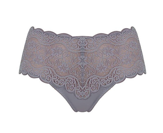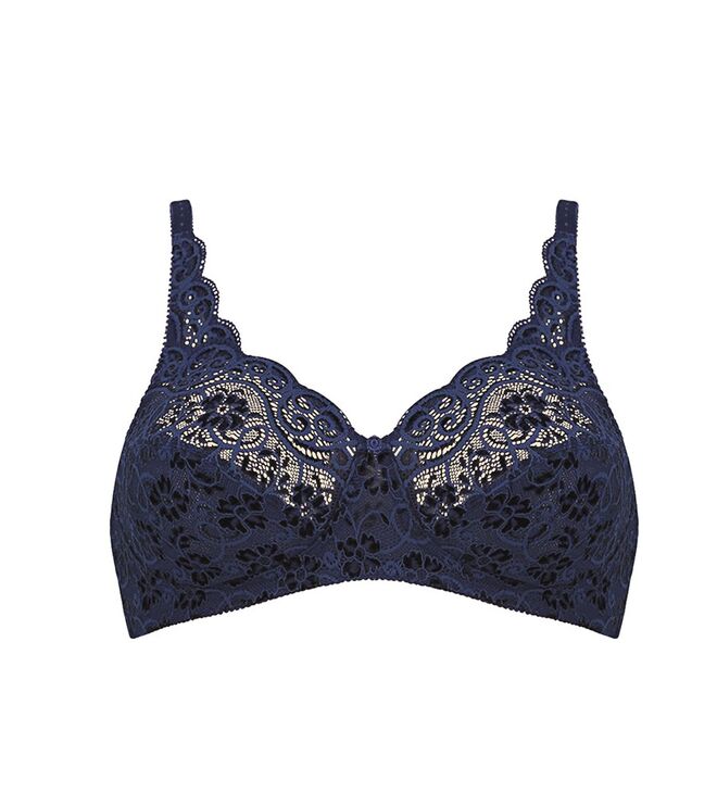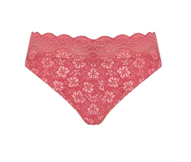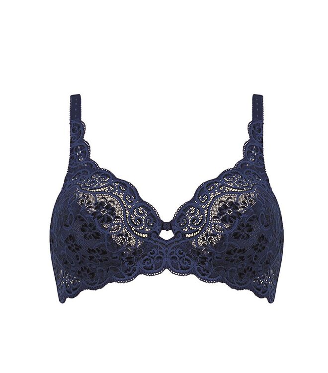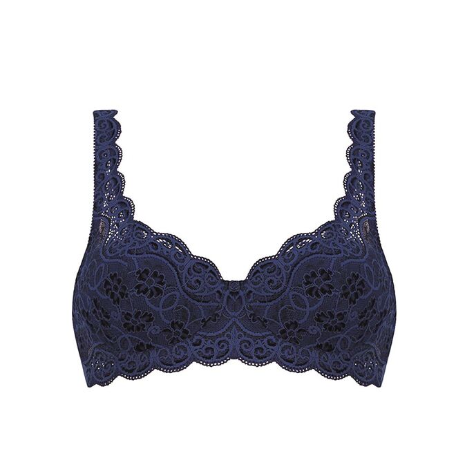 Todo trabalhado em renda, o Amourette 300 W é feminino e um dos favoritos da Triumph por mulheres de todas as gerações. Cria uma silhueta redonda, oferece total suporte e um elevar subtil do peito sem enchimento extra. O modelo clássico está disponível em azul, roxo claro e cor-de-rosa. A Tai e a Maxi a combinar completam um look rendado perfeito.