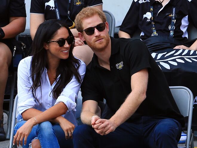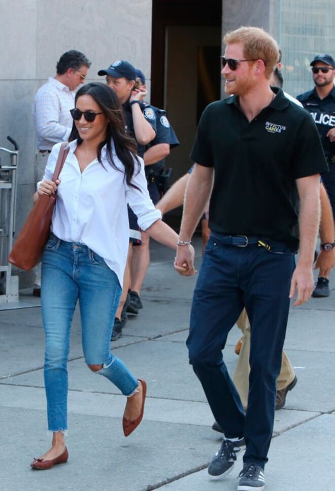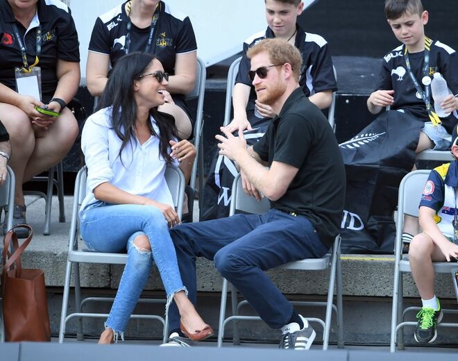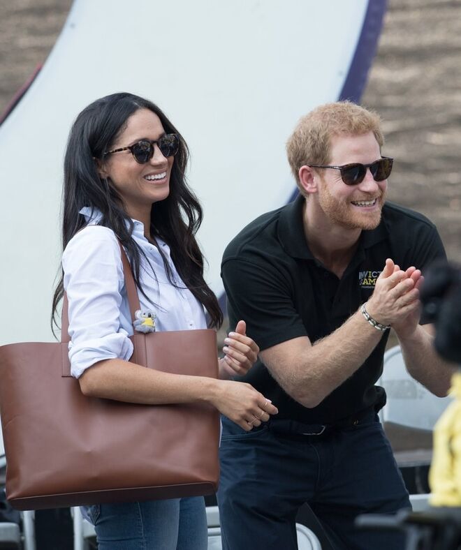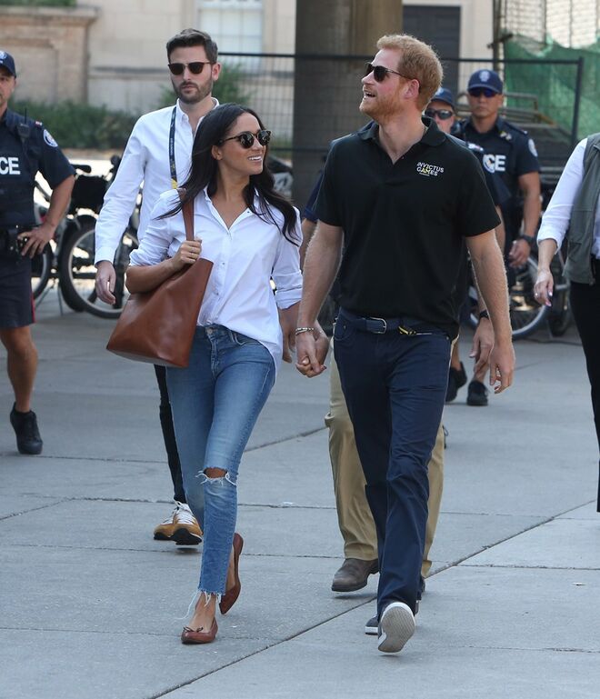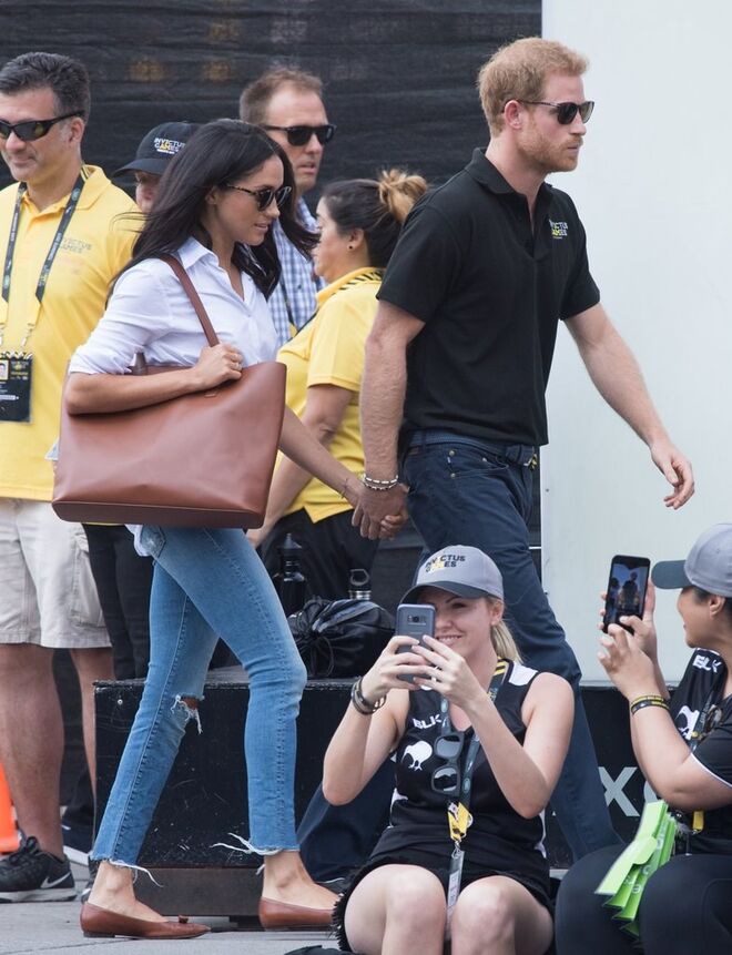 Meghan Markle escolheu um vestido da marca Aritzia, com a parte da saia em chiffon, e um blusão de cabedal a condizer da marca Mackage. Consta que o vestido esgotou rapidamente nas lojas, restando a opção de o comprar noutra cor que não a usada por Markle. O blusão ainda está disponível. Mais recentemente, surgiram uma série de imagens com o casal de mãos dadas enquanto assistiam a um dos jogos. Para a ocasião, Meghan Markle optou por um look casual: uns jeans e uma camisa branca. Acontece que a escolha não foi de todo inocente... A camisa branca, que entretanto já esgotou, é da marca de uma amiga de Markle, Misha Nonoo, e tem o nome de 'The Husband'.