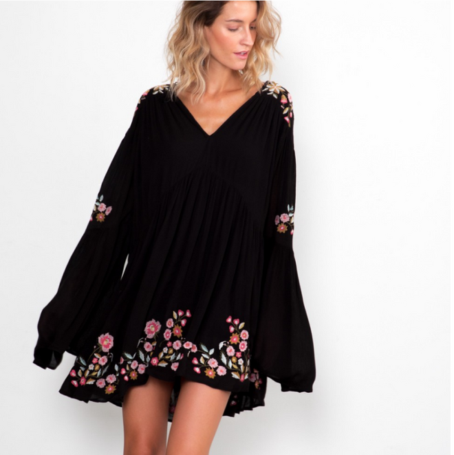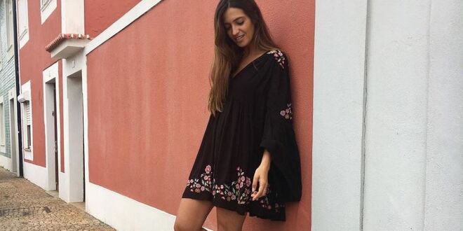 Trata-se de um mini vestido preto, de estilo boho-chic, com mangas compridas e umas flores bordadas. Rapidamente esta peça se transformou em objeto de desejo e numa das grandes inspirações para a meia estação.
