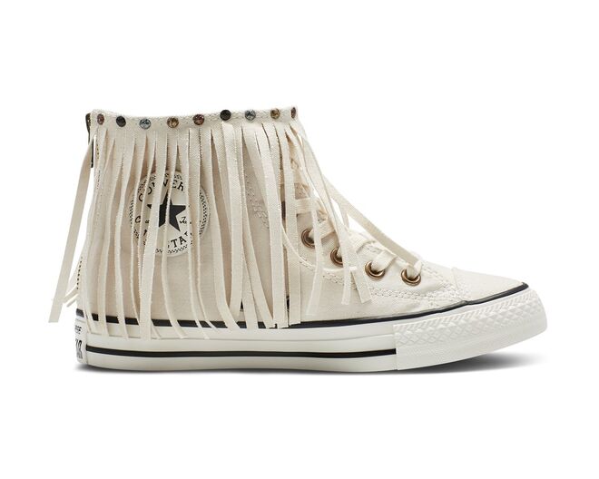 Estão também disponíveis as novas Converse Chuck Taylor All Star Fringe, que levam a moda dos festivais de música de verão a outro nível. Com franjas a 360 graus, tachas cravejadas ao longo do rebordo da sapatilha e um fecho de correr que facilita o calçar e descalçar, este estilo é um must have desta estação. Disponível em Pergaminho e Preto.
