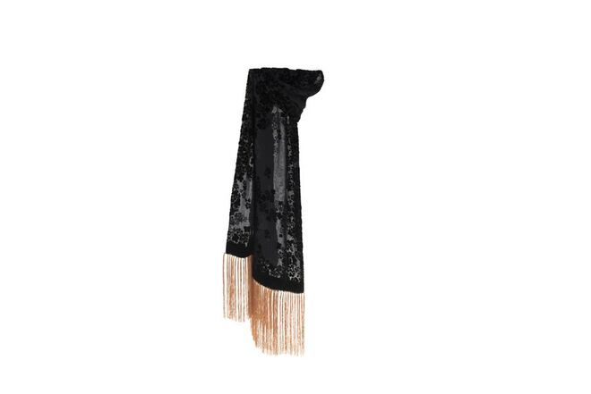 A coleção fica completa com lenços devoré em veludo preto e carteiras em formato envelope com aplicações de pedras brilhantes.