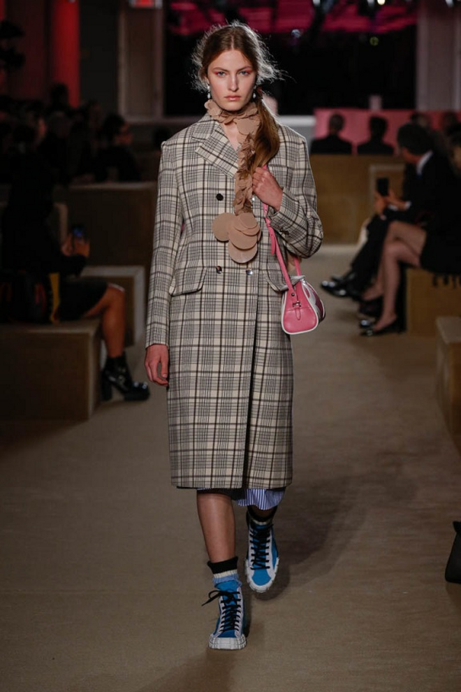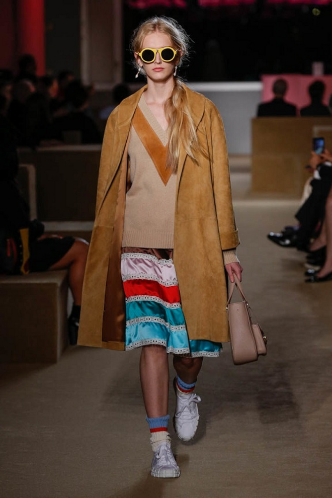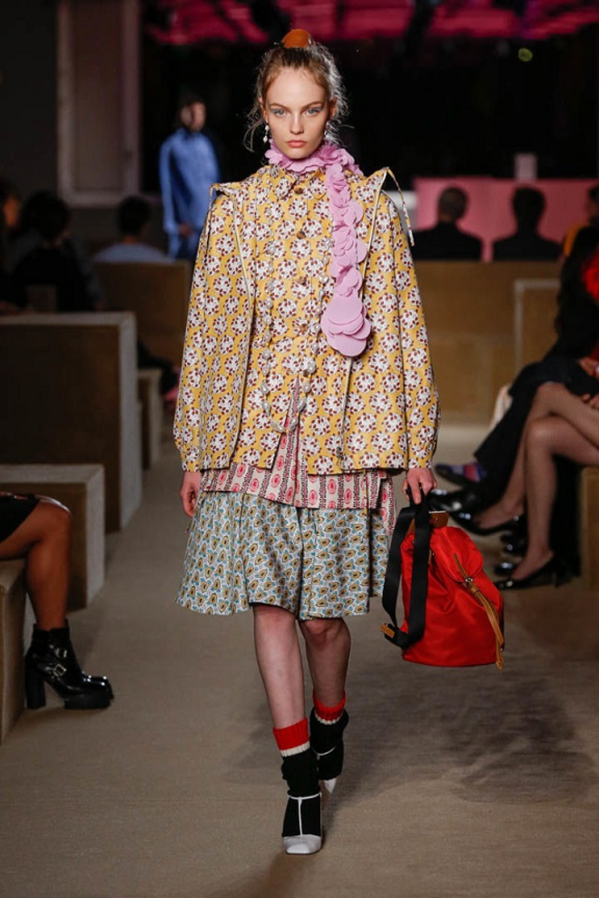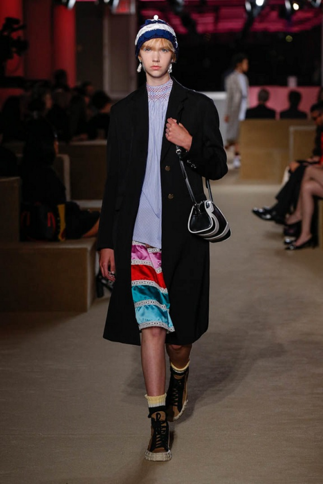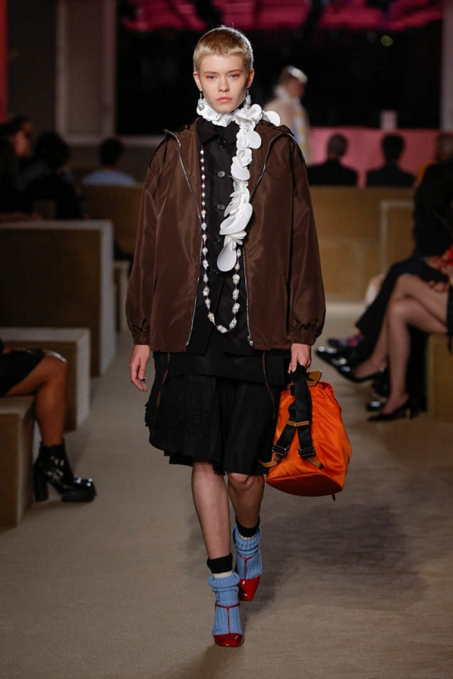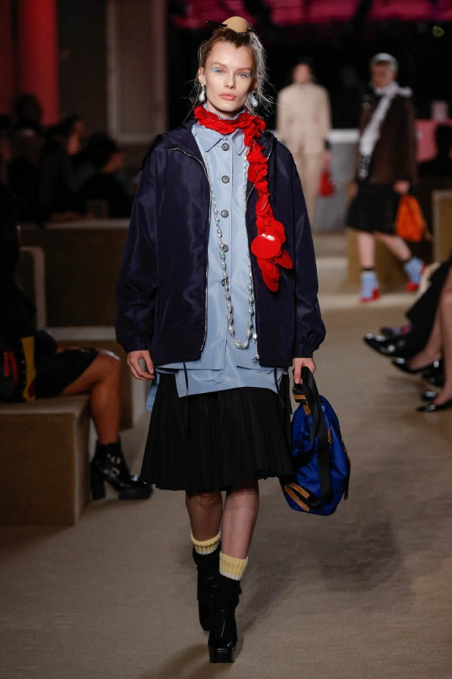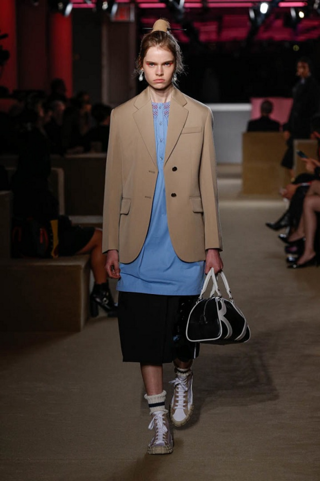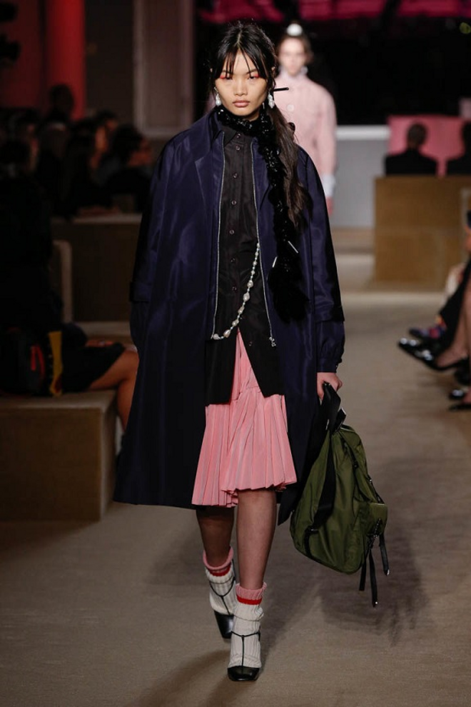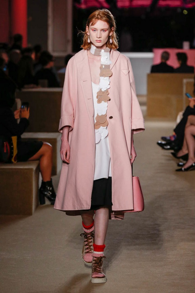 Um desfile que quis ser o oposto do pretensioso, como explicou Miuccia Prada ao site da Vogue norte-americana, e onde vimos casacos compridos, blazers longos e direitos, t-shirts simples ou com riscas, peças de malha grossa que contrastaram com cortes direitos, peças compridas e coloridas. Um espectáculo onde sobressaiu a cor, alternando-se entre o pastel e os tons mais sóbrios e os longos e multicoloridos cachecóis. Desfilou ainda a reinvenção da mala Bowling, um êxito da marca italiana do início dos anos 2000.