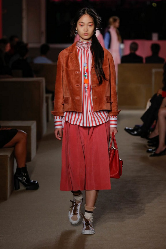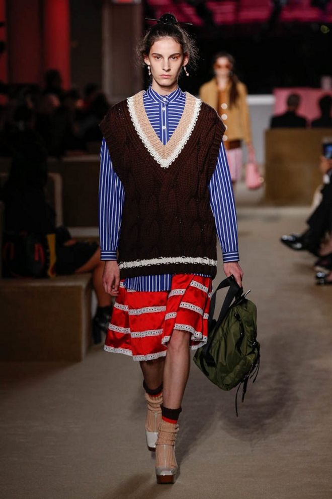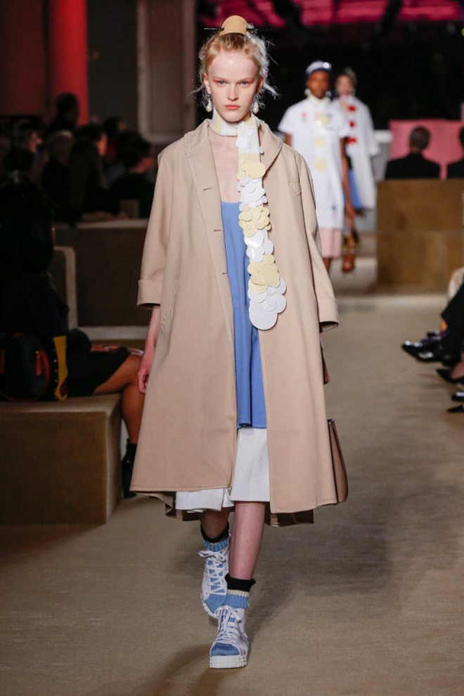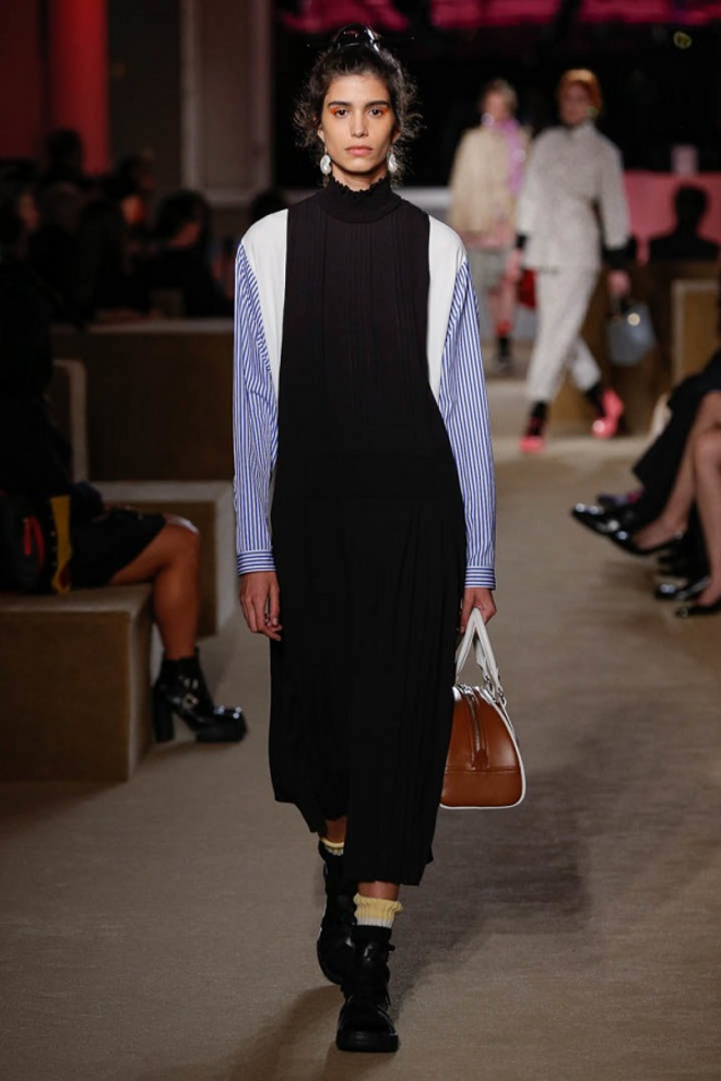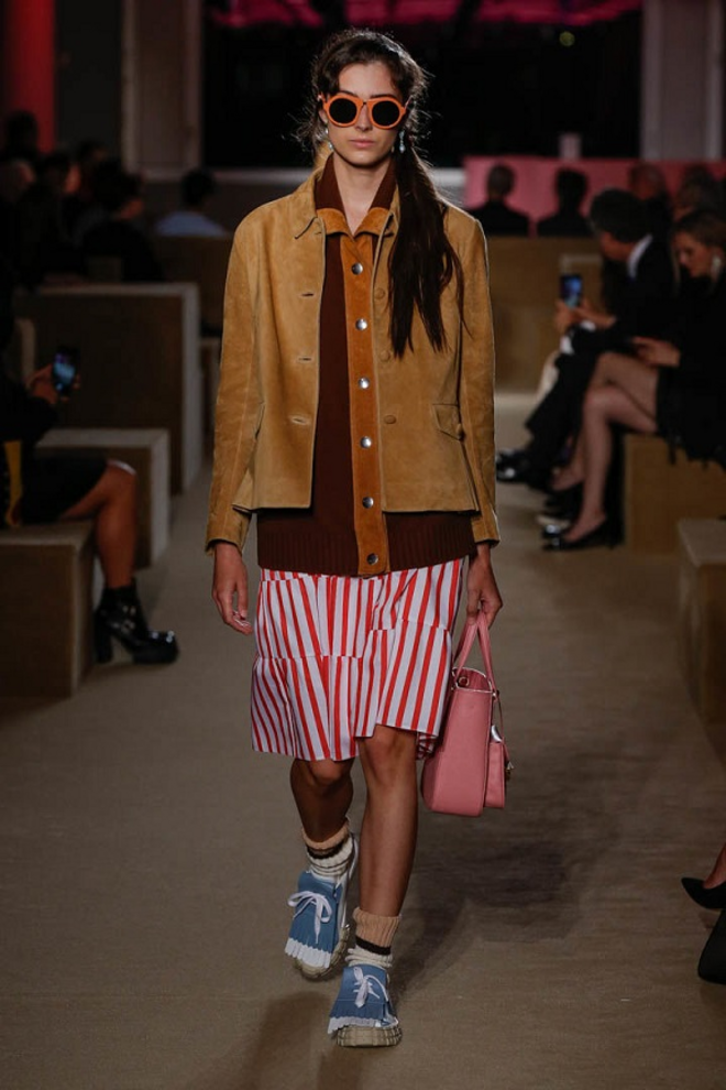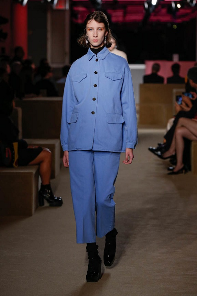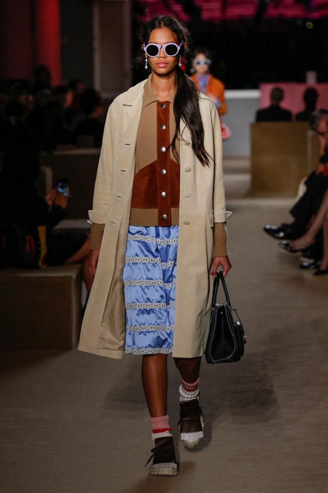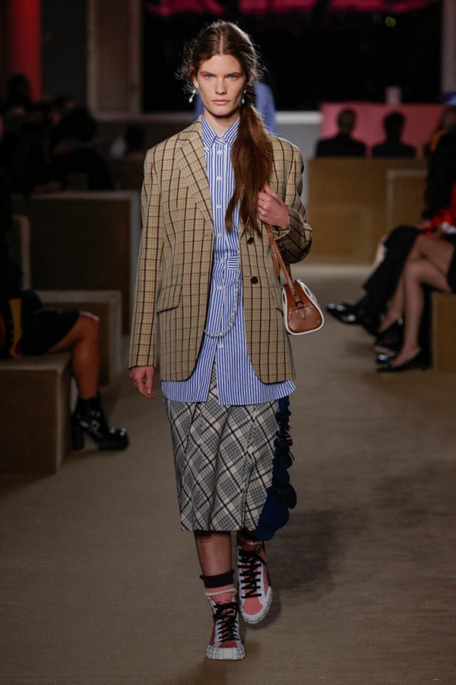 Um desfile que quis ser o oposto do pretensioso, como explicou Miuccia Prada ao site da Vogue norte-americana, e onde vimos casacos compridos, blazers longos e direitos, t-shirts simples ou com riscas, peças de malha grossa que contrastaram com cortes direitos, peças compridas e coloridas. Um espectáculo onde sobressaiu a cor, alternando-se entre o pastel e os tons mais sóbrios e os longos e multicoloridos cachecóis. Desfilou ainda a reinvenção da mala Bowling, um êxito da marca italiana do início dos anos 2000.