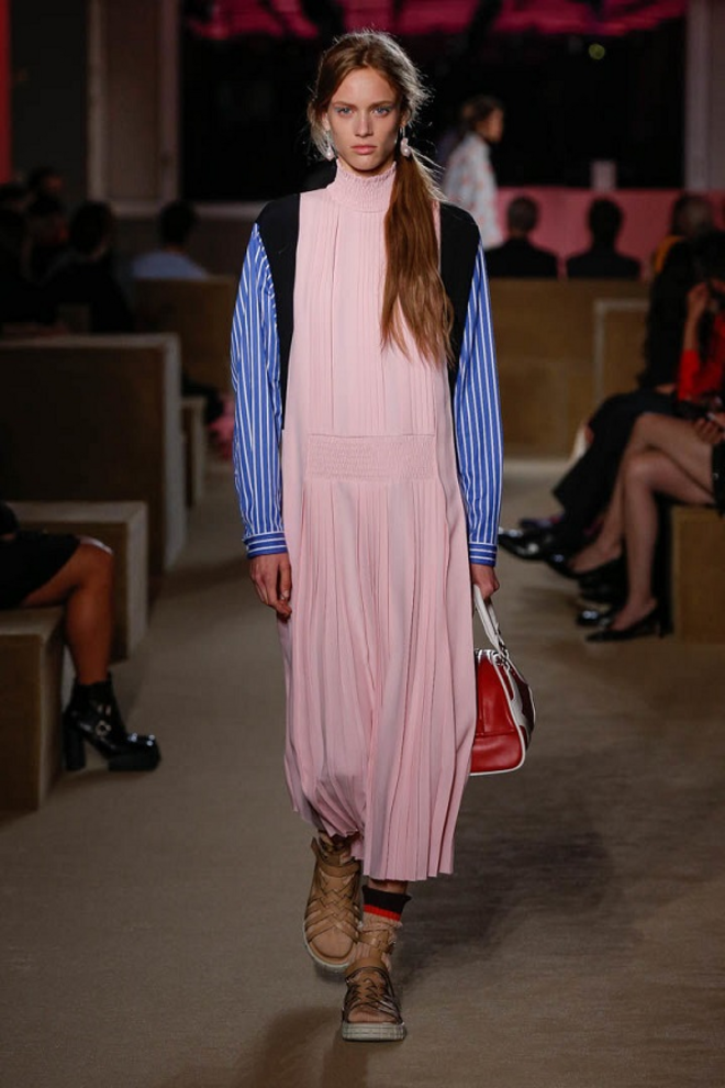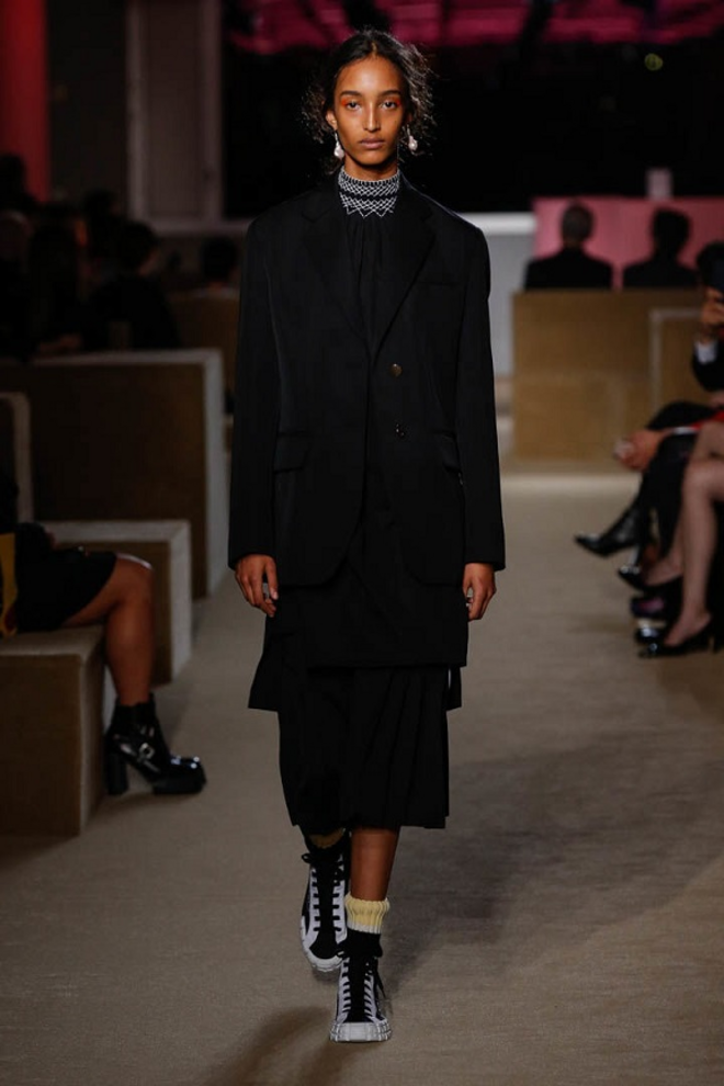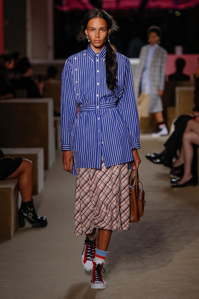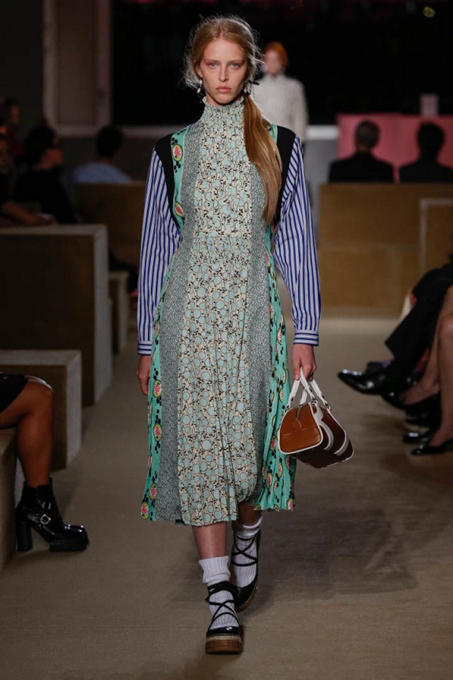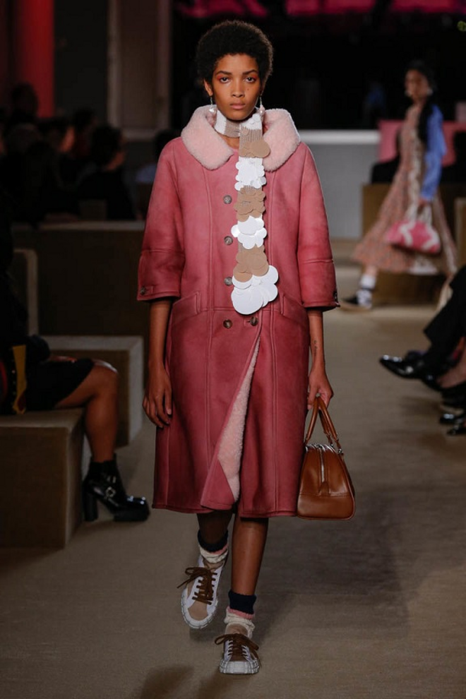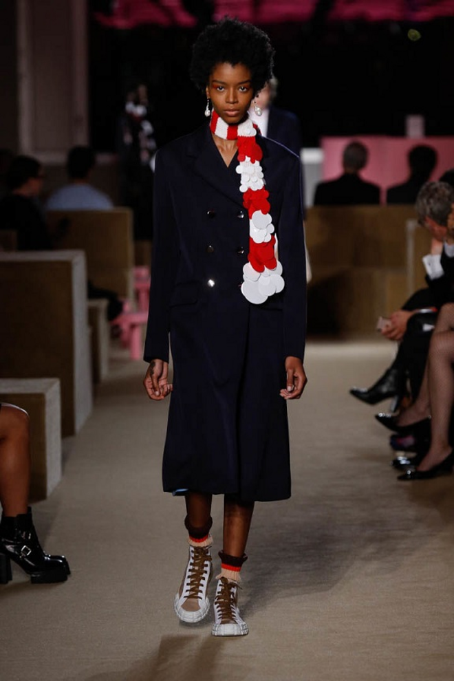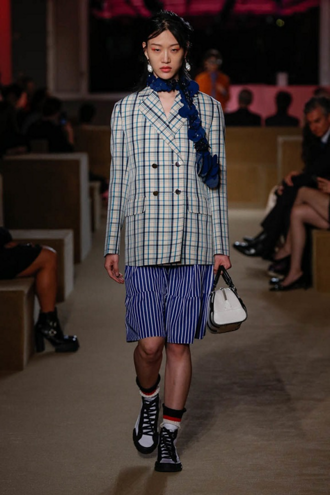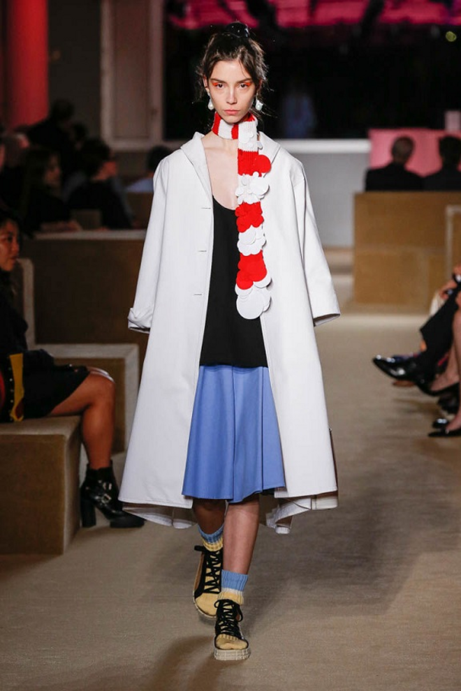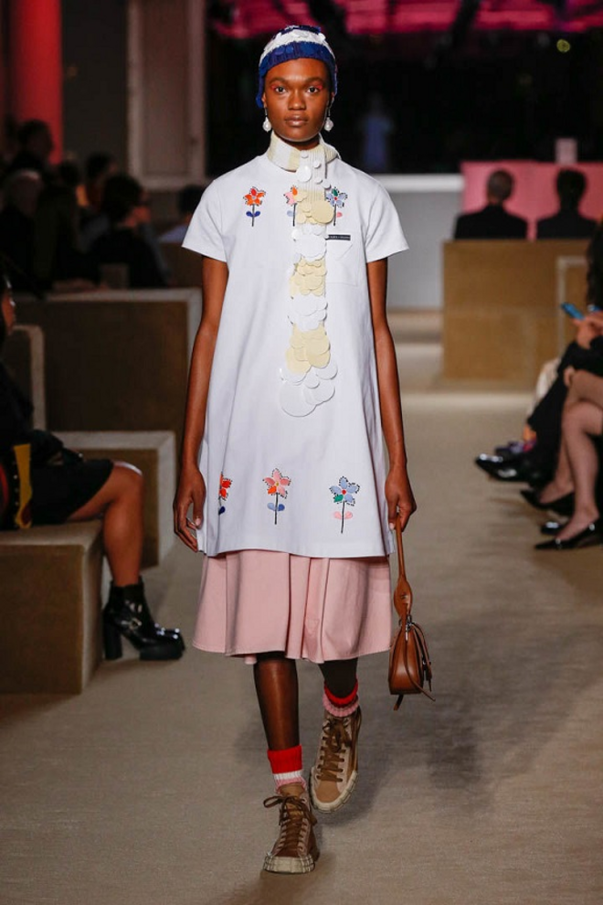 Um desfile que quis ser o oposto do pretensioso, como explicou Miuccia Prada ao site da Vogue norte-americana, e onde vimos casacos compridos, blazers longos e direitos, t-shirts simples ou com riscas, peças de malha grossa que contrastaram com cortes direitos, peças compridas e coloridas. Um espectáculo onde sobressaiu a cor, alternando-se entre o pastel e os tons mais sóbrios e os longos e multicoloridos cachecóis. Desfilou ainda a reinvenção da mala Bowling, um êxito da marca italiana do início dos anos 2000.