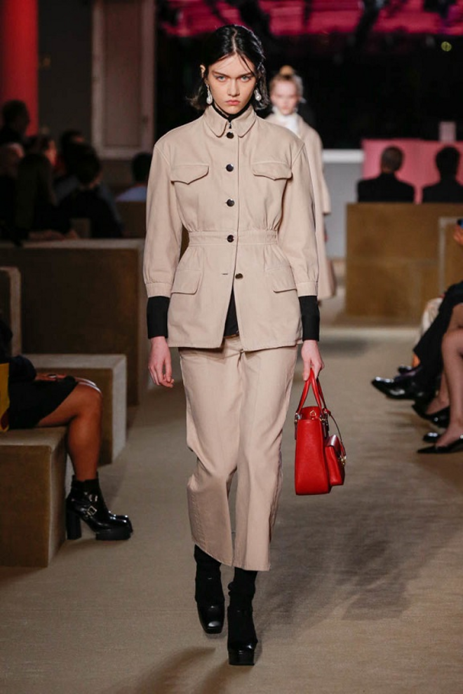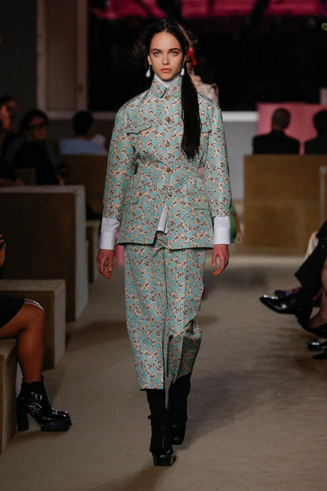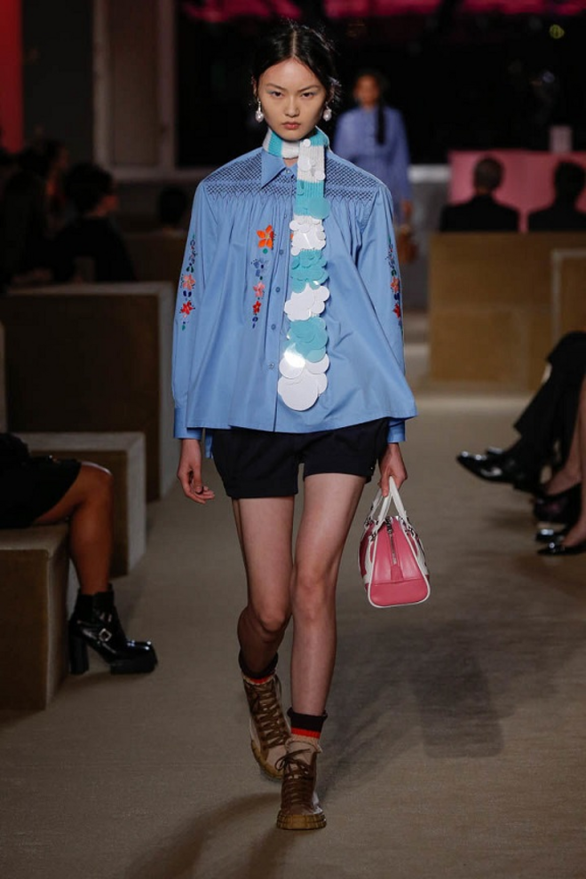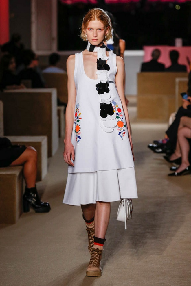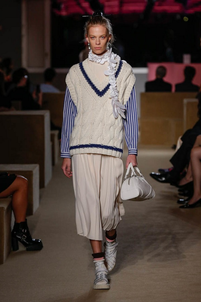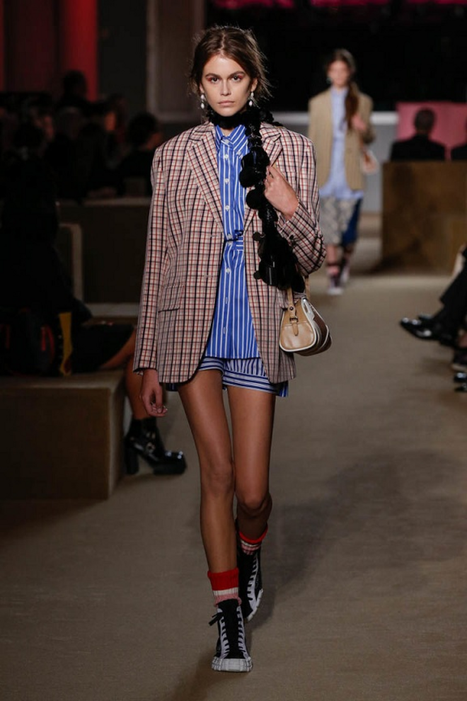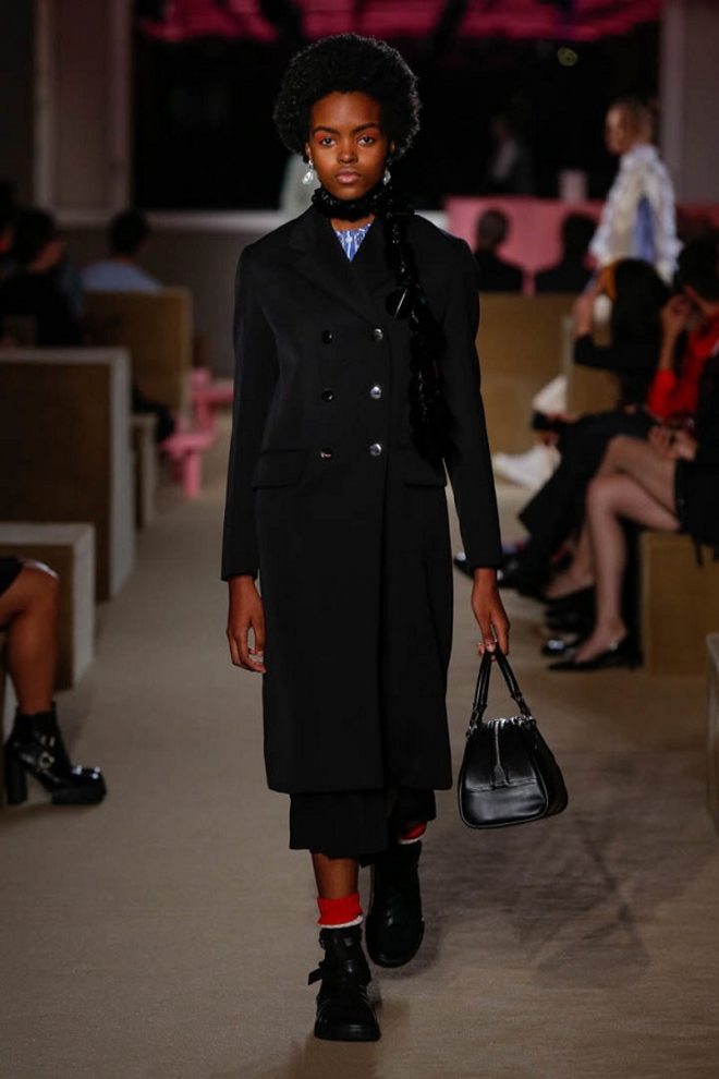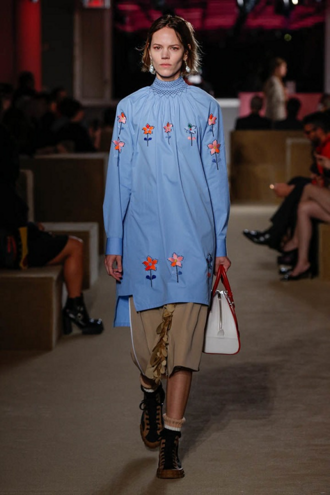 Um desfile que quis ser o oposto do pretensioso, como explicou Miuccia Prada ao site da Vogue norte-americana, e onde vimos casacos compridos, blazers longos e direitos, t-shirts simples ou com riscas, peças de malha grossa que contrastaram com cortes direitos, peças compridas e coloridas. Um espectáculo onde sobressaiu a cor, alternando-se entre o pastel e os tons mais sóbrios e os longos e multicoloridos cachecóis. Desfilou ainda a reinvenção da mala Bowling, um êxito da marca italiana do início dos anos 2000.