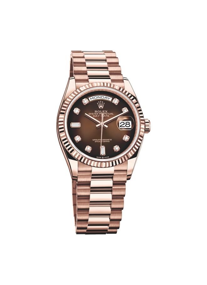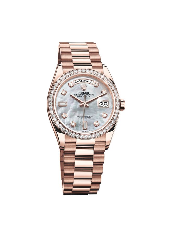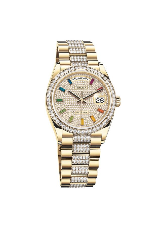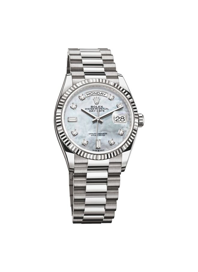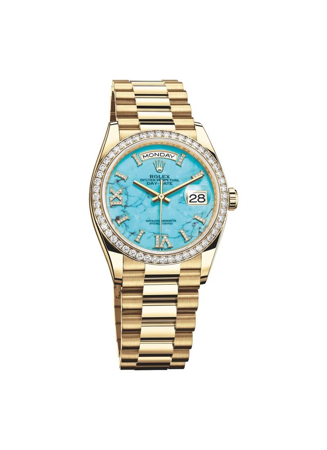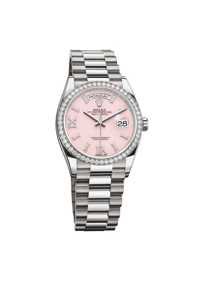 A pioneira linha Oyster Perpetual Day-Date, lançada em 1956 ganhou uma nova e modernizada versão com mostradores ainda mais refinados. Feito em ouro e platina, este novo design tem um diâmetro de 36 mm e está envolto por uma moldura de 52 diamantes. O modelo mantém a emblemática pulseira presidente, cujo nome evoca os diferentes presidentes norte-americanos que utilizaram este modelo, como Lyndon B. Johnson e John F. Kennedy.