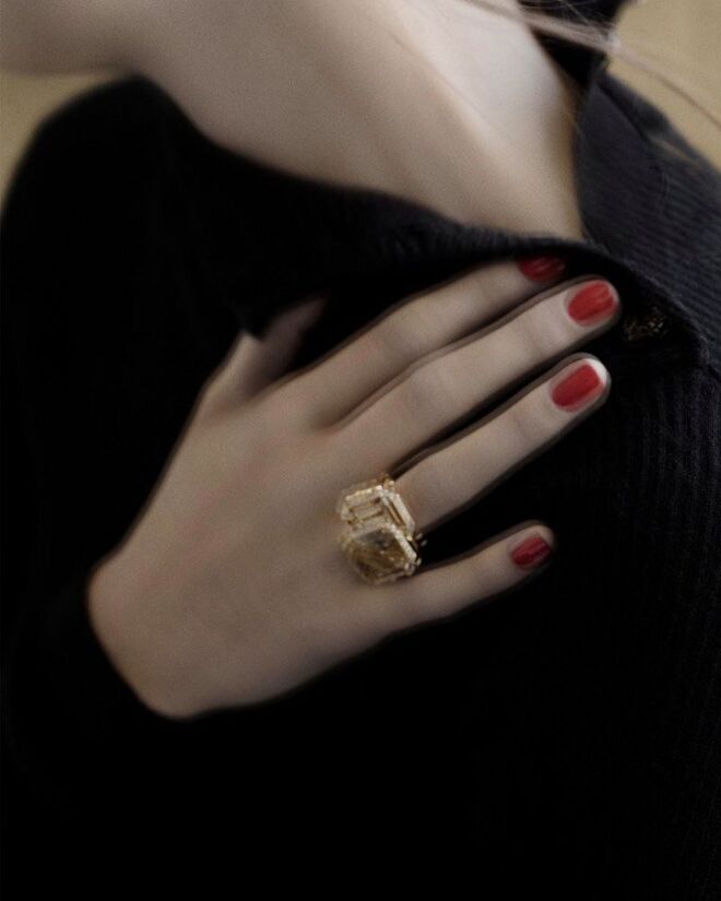 Composta por 12 peças em ouro e diamantes, com detalhes coloridos em verde ou vermelho, a coleção apresenta uma seleção de joias estruturadas e simétricas que nos remetem para a joalharia vintage que a própria Coco Chanel criou para a marca.