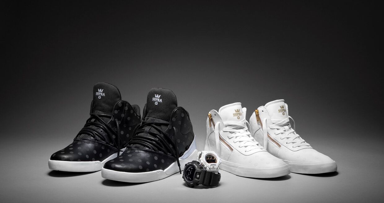 A inspiração para os ténis pretos G-Shock x SUPRA vem do modelo de assinatura Estaban SUPRA do skateboarder profissional Stevie Williams. Os ténis fabricados a partir de uma combinação de pele preta com "polka dots", em pele cinzenta metalizada, e lona preta oferecem conforto excecional devido a um interior de malha preta amplamente almofadado e uma entressola branca construída a partir de SUPRAFOAM extraleve.
