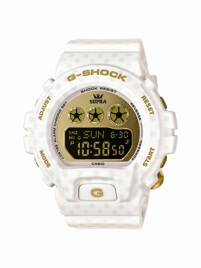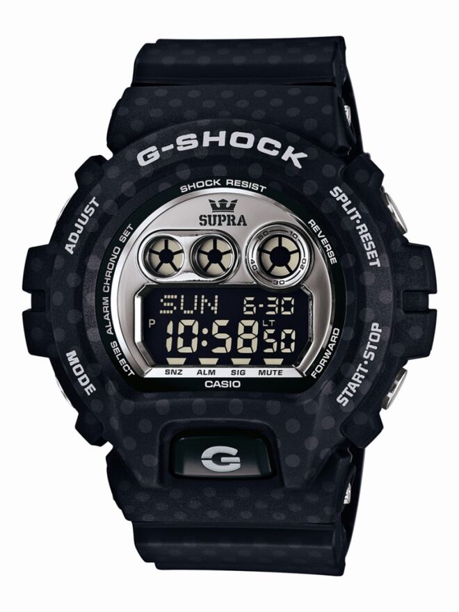 A edição limitada G-Shock x SUPRA GDX6900SP-1 inclui um design com padrão "360 polka dot" no bisel preto e apresenta resistência ao choque, resistência à água até 200 metros, cronómetro 1/100, Formatos 12/24, Opção Mute e Hora Mundial. Este modelo inclui ainda Multi-Home Time de 4 opções, Auto LED Super Illuminator e pilha com duração de 10 anos tudo envolto numa fantástica caixa de 53.9mm.