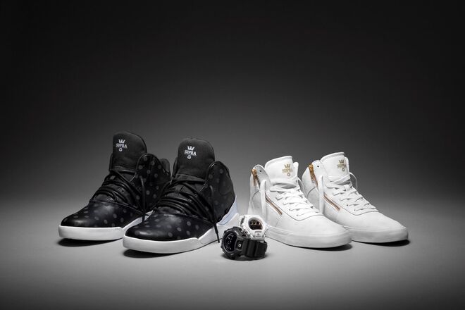 A Casio G-Shock e a marca de street wear SUPRA desenharam dois relógios personalizados e modelos de ténis high top.