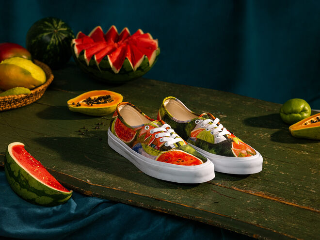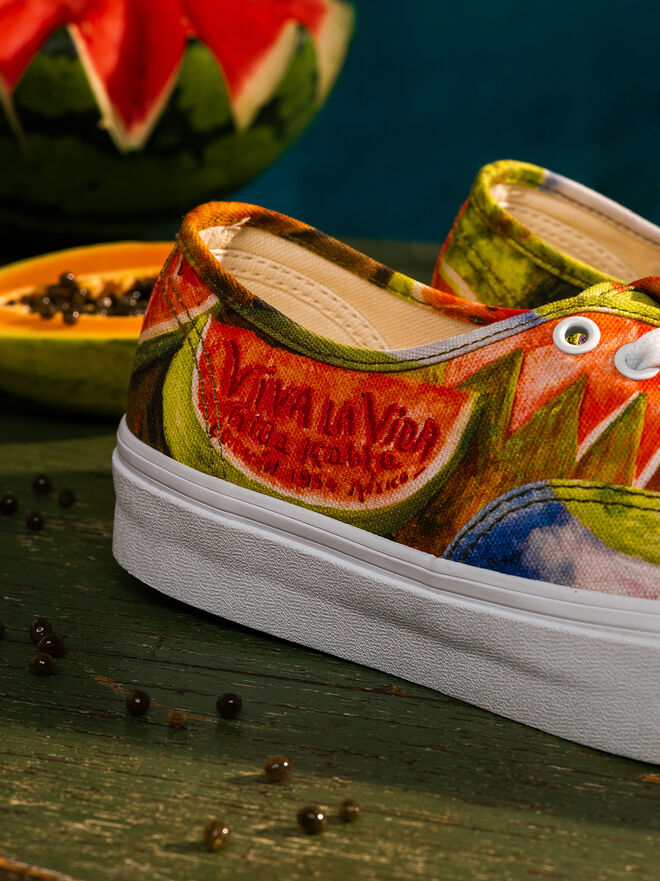 A coleção Vault by Vans x Frida Kahlo traz, assim, uma amostra da obra da pintora, a começar pelo seu autorretrato impresso no modelo OG Sk8-Hi LX. Já o OG Authentic LX conta agora com um padrão total em melancia e novos detalhes aplicados e o OG Slip-On LX ganhou as linhas e as cores principais do quadro ‘Autorretrato com Colar de Espinhos e Beija-flor’ de 1940. Os ténis estarão disponíveis nas lojas a partir de 29 de junho.