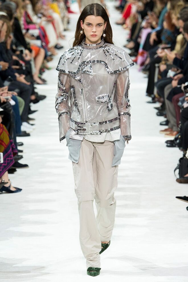 Uma coleção futurista, onde se destacou o plástico transparente, os tops em lantejoulas coloridas e os casacos oversized repletos de bolsos, que fizeram lembrar uma versão feminina e glamourosa dos fatos de astronautas.
