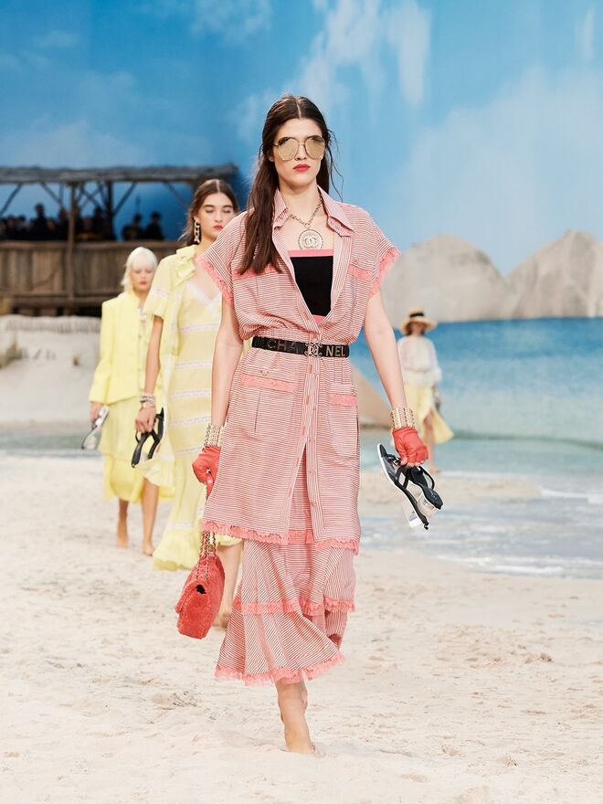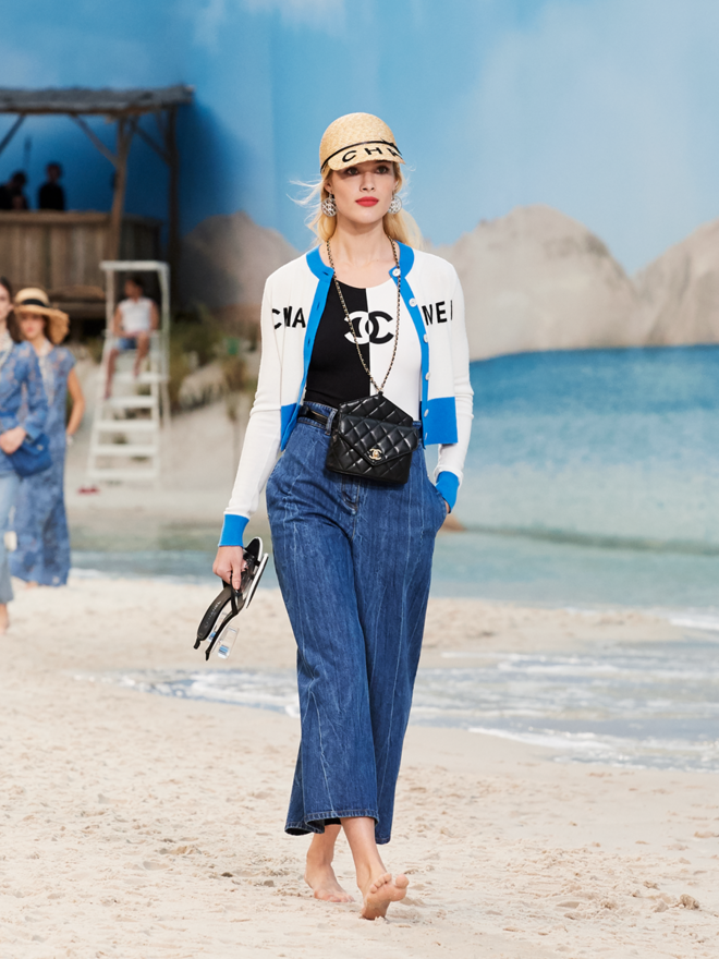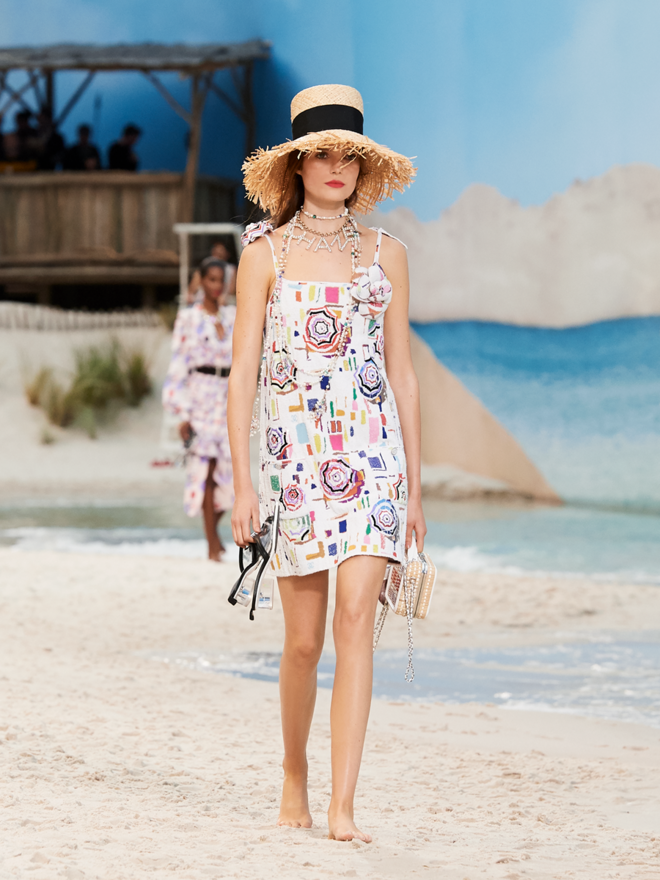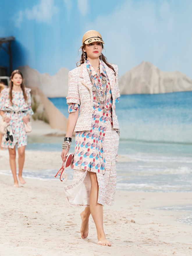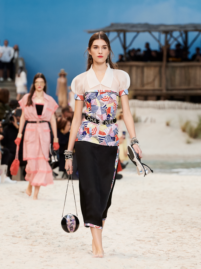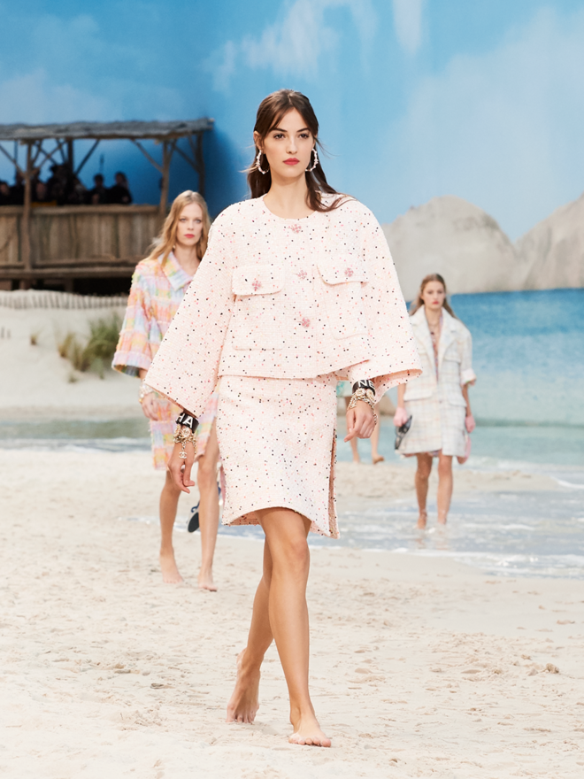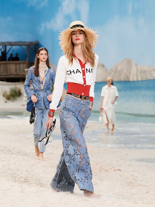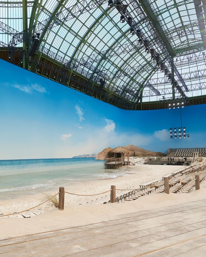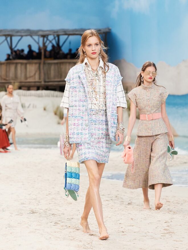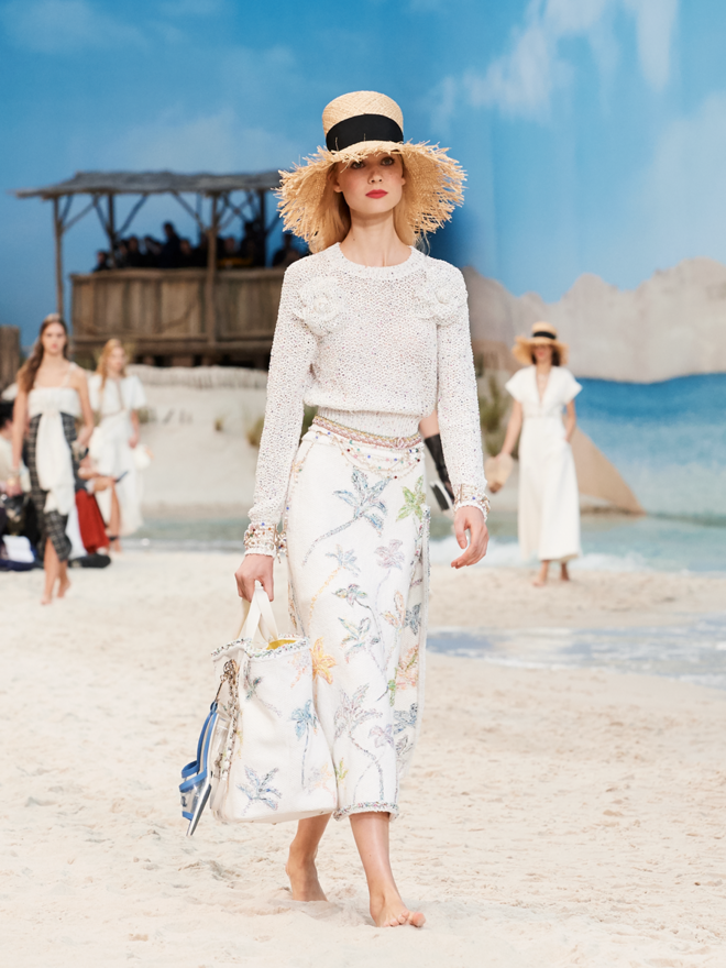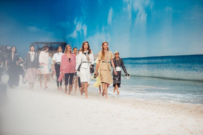 Céu azul, areia branca, ondas do mar. Poderia ser uma praia no sul da França, mas foi o cenário que Karl Lagerfeld, diretor criativo da Chanel, criou no Grand Palais, em Paris, para o desfile da coleção primavera/verão 2019 da maison.