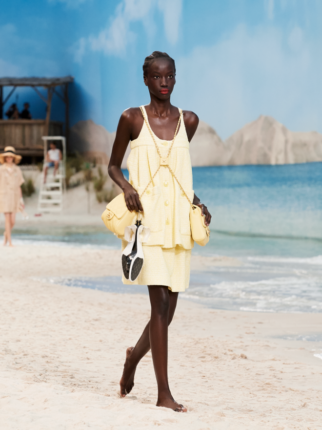 As carteiras em tweed e tranças, ou com bordados, foram transportadas em duo. Já as malas de praia grandes surgiram em ganga e palha, enquanto os sacos de rede multicolor completam a coleção. Finalmente, os minaudières assumiram a forma de conchas ou pequenas bolas de praia.