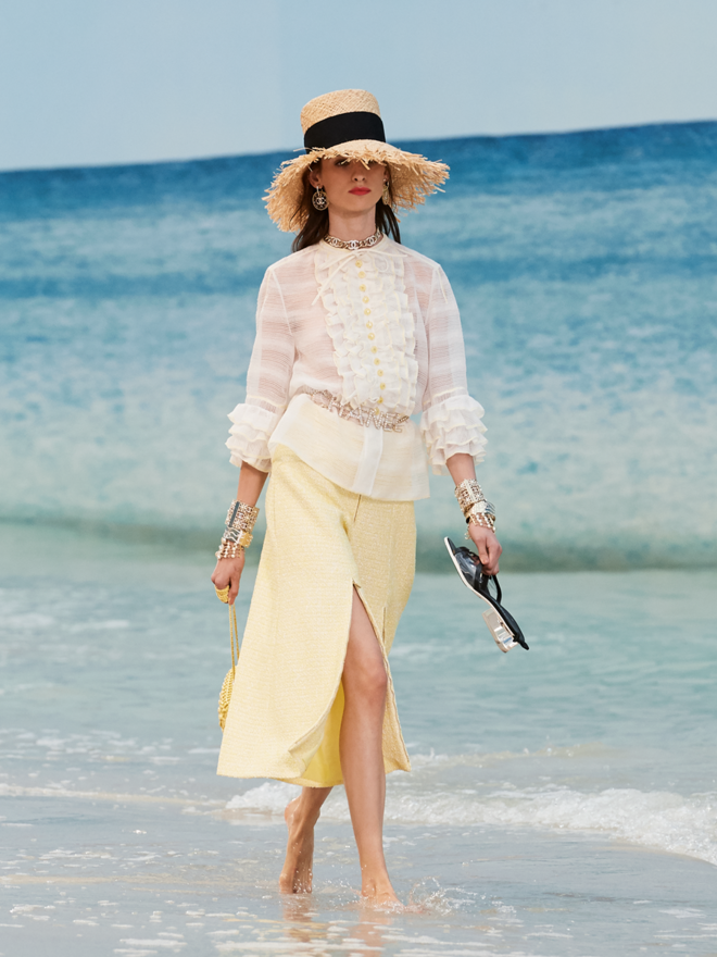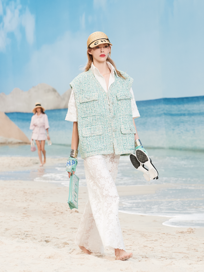 Nos acessórios, vimos o lettering da Chanel ser dividido em duas sílabas para adornar cintos, brincos e colares. Destaque ainda para os visores de pala dupla, os chapéus de abas largas em palha com franjas e as braceletes XXL. Os mules acrescentaram elegância à passerelle, com pequenos saltos em plexiglass e detalhes em cortiça.