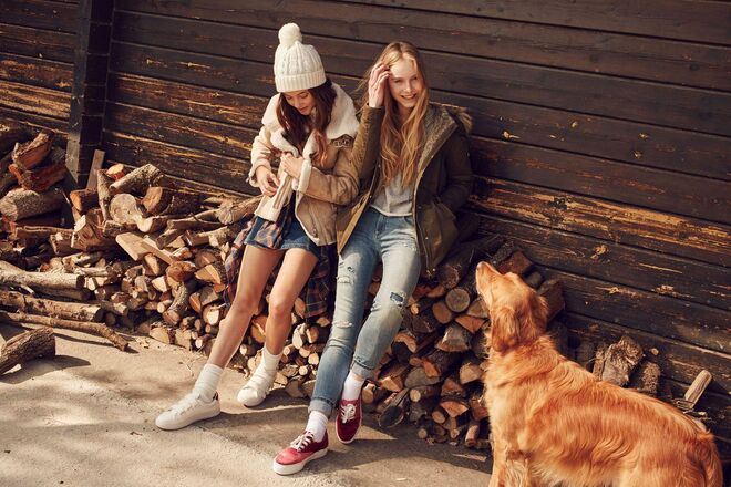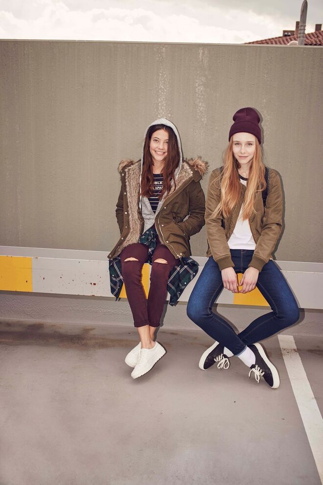 Destacam-se as parkas e os casacos tipo bomber, que combinam com t-shirts de inspiração retro e camisas de quadros com um toque de grunge.