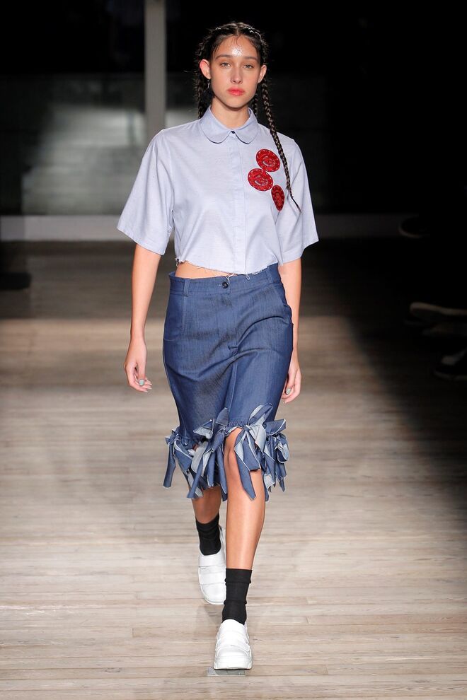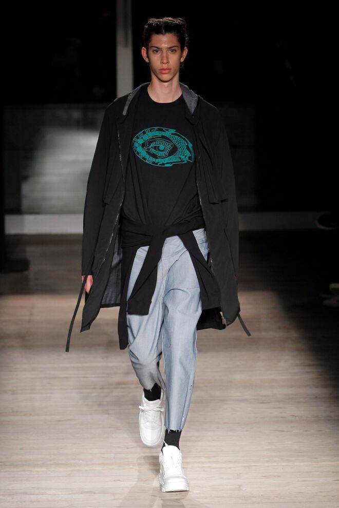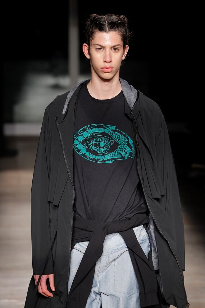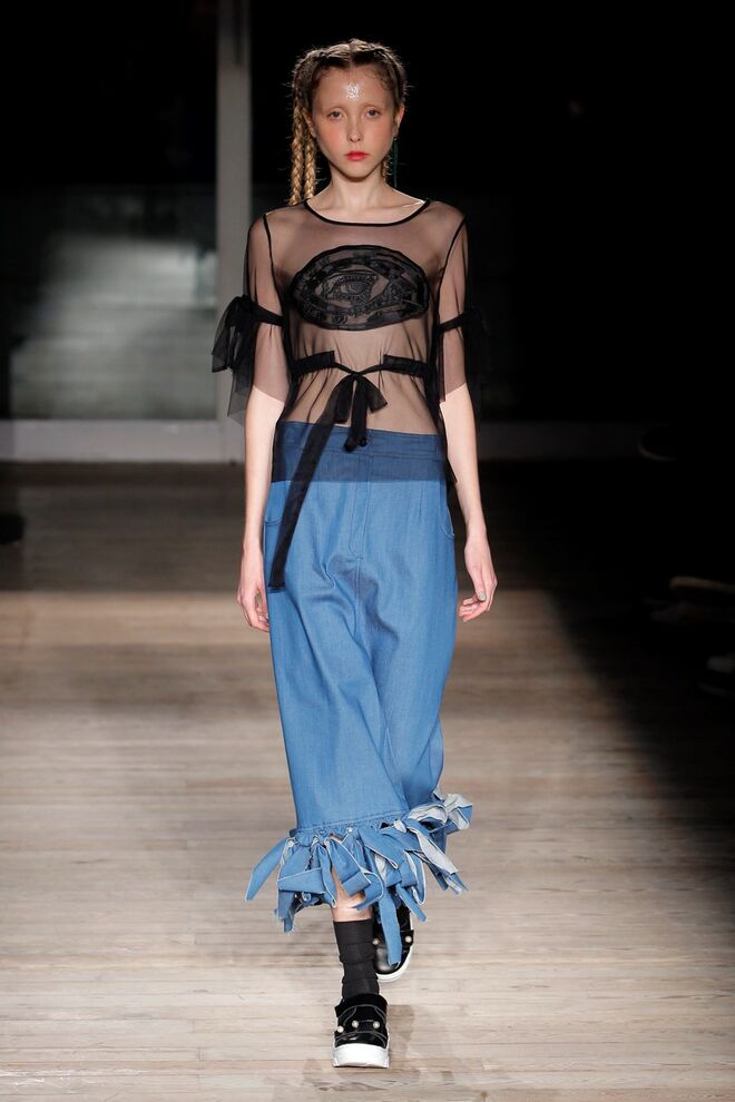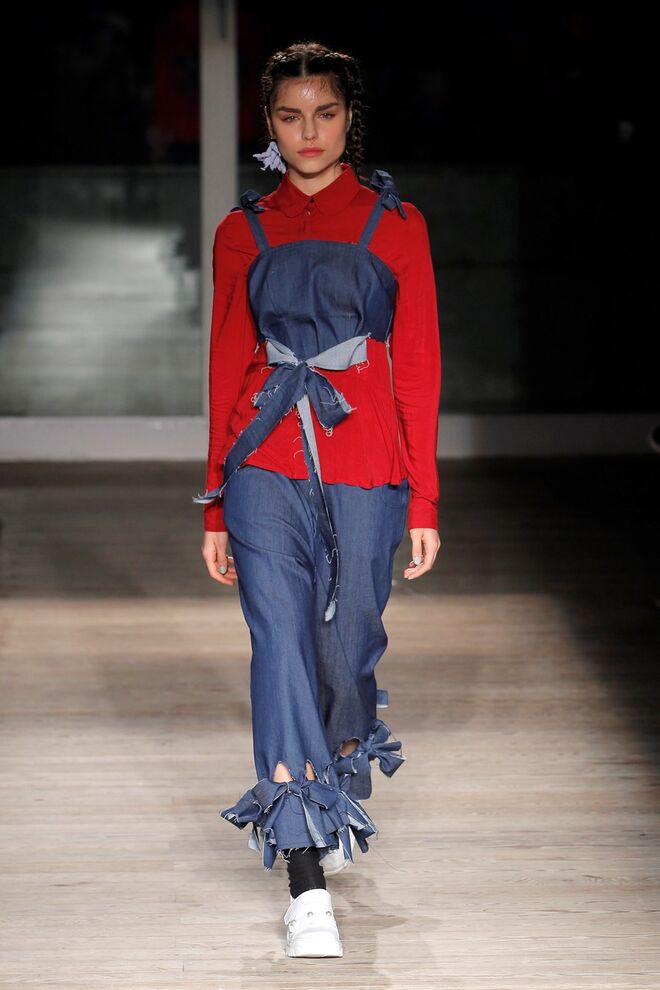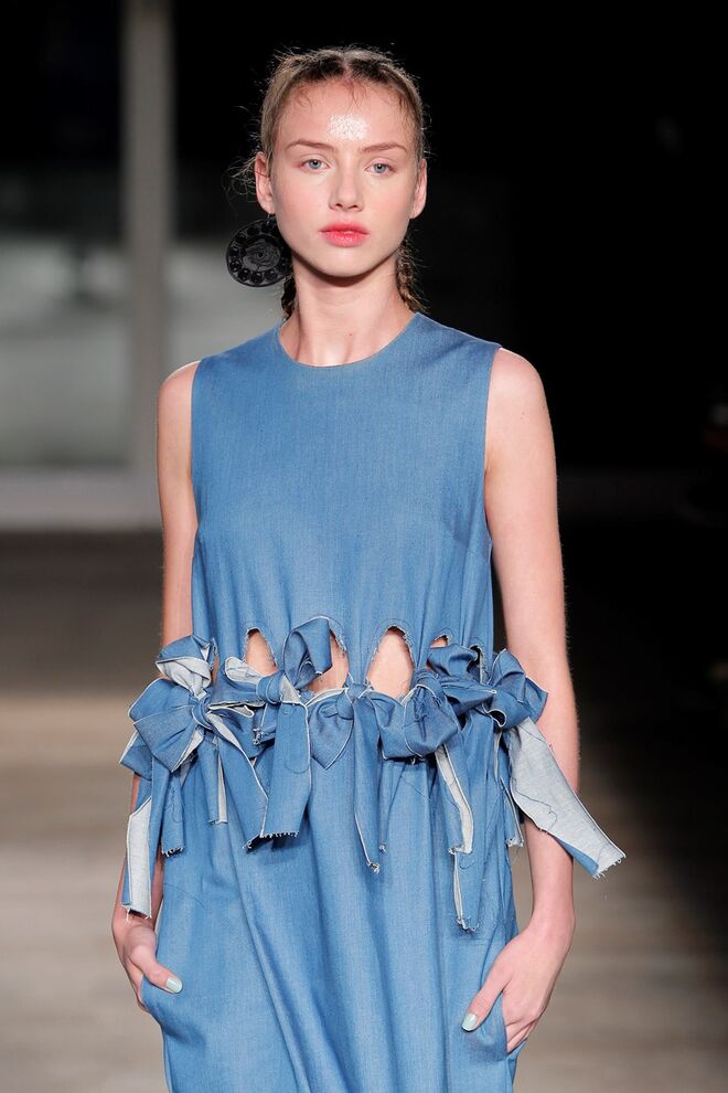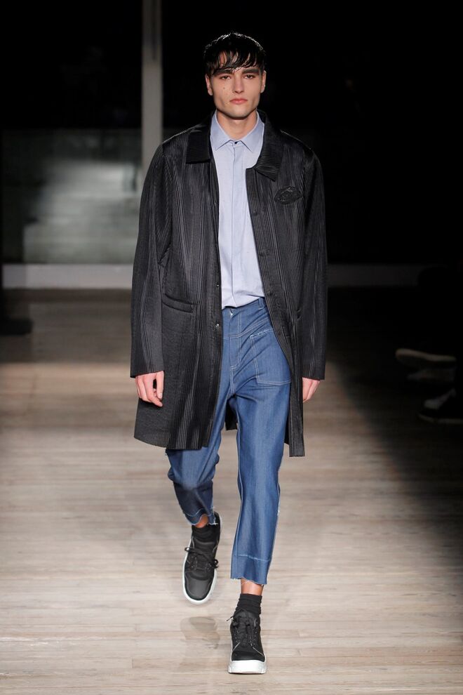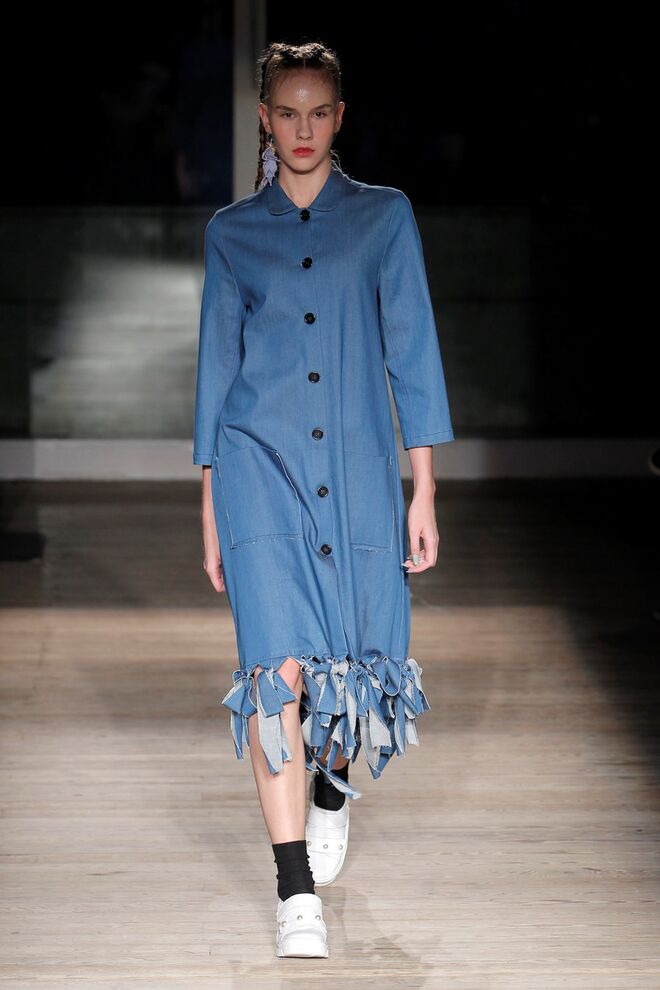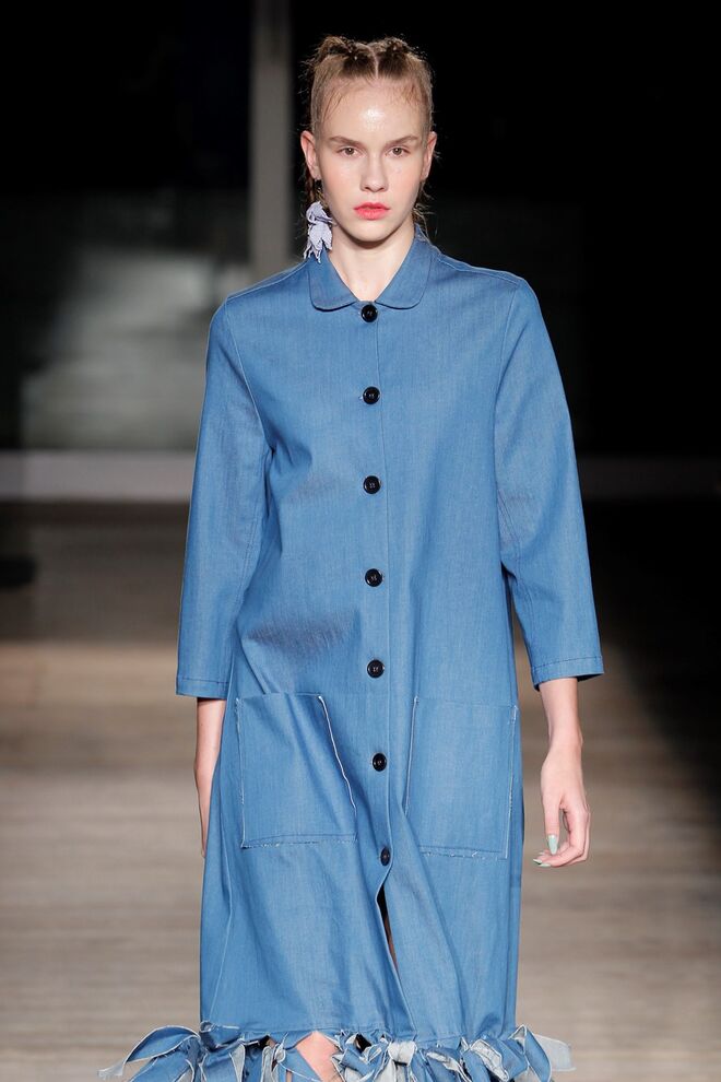 Dos tons claros do azul denim e das diferentes tonalidades de preto, que é um musthave em cada coleção, emergem o vibrante verde esmeralda e o lavanda a par de um padrão jacquard com motivos florais. Ao longo da coleção, são percetíveis pedaços de denim danificados e desfiados, evidenciando os destroços de um passado desconhecido.