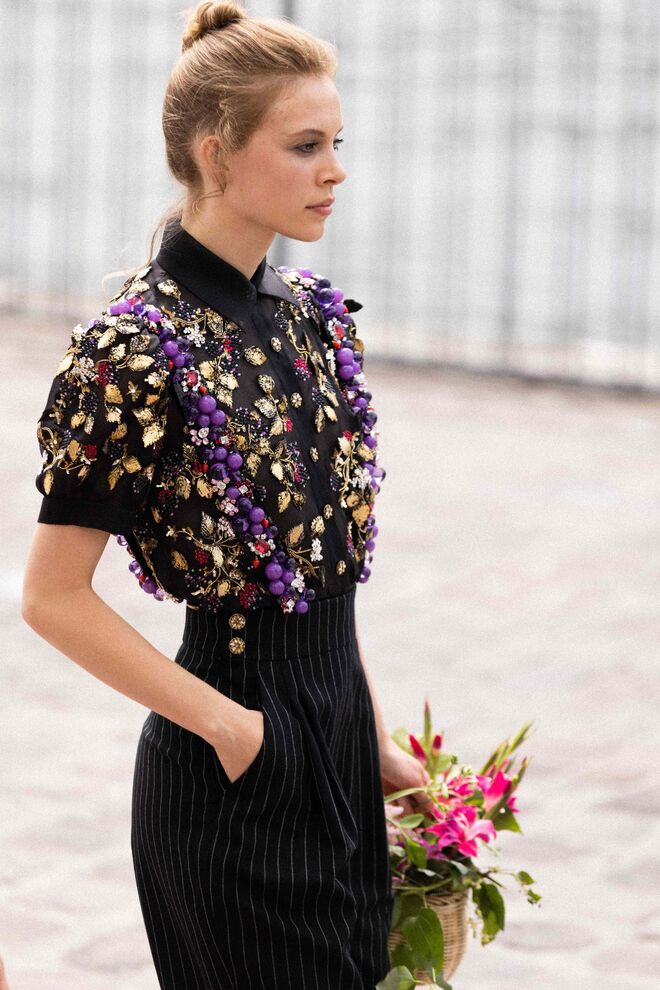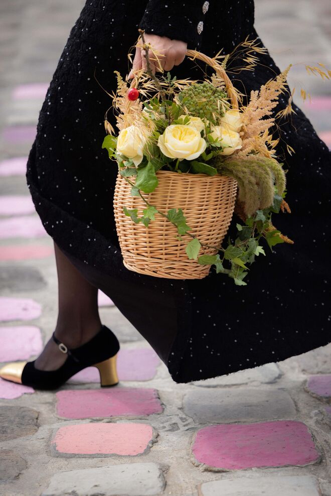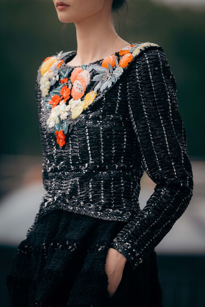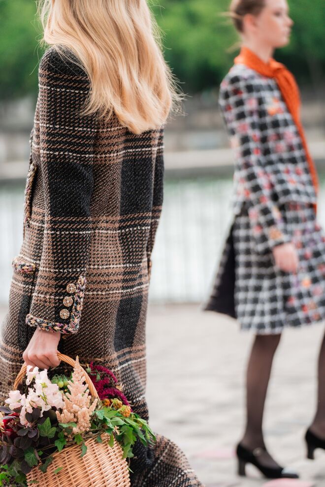 Foi Caroline de Maigret, modelo e autora de Como Ser Uma Parisiense Em Qualquer Lugar, que abriu o desfile, vestida com um longo casaco tweed azul-escuro, uma peça clássica Chanel, seguida das restantes modelos, que ora passeavam o cão, ora carregavam uma cesta com flores. Dos designs brotam bordados com frutas e flores - a camélia é um dos símbolos da Chanel -, que fazem lembrar as obras de natureza-morta, evidenciados nos fatos de tweed e sobretudos de inspiração masculina. Por outro lado, experienciamos um estado de leveza e calma através do uso de chiffon de seda, organza, renda e laços em vestidos e blusas. Destaque ainda para o look de noiva, coberto de elementos delicados, que por tradição fecha o desfile.