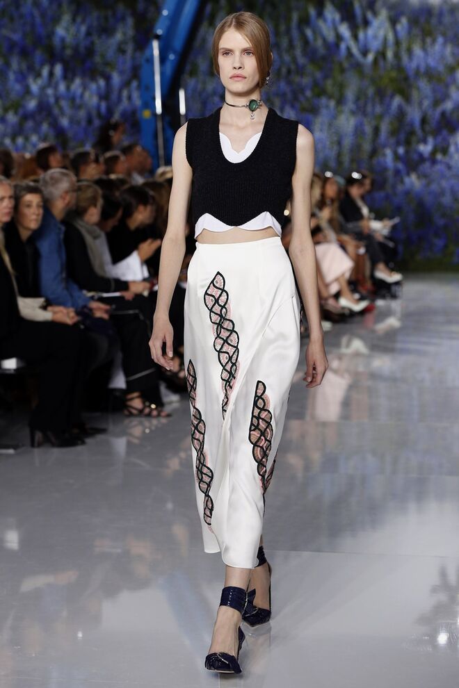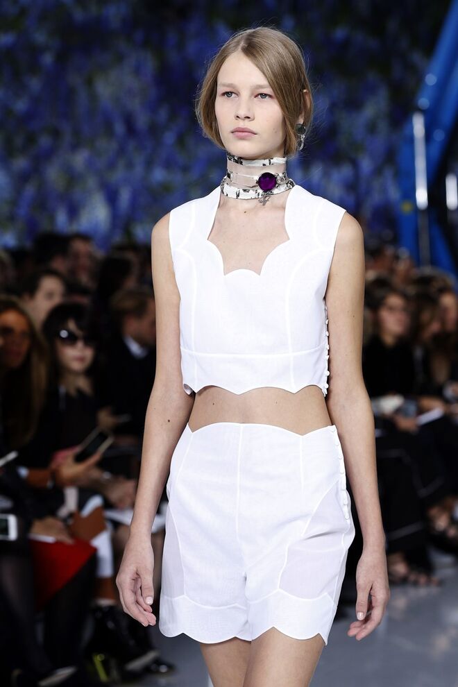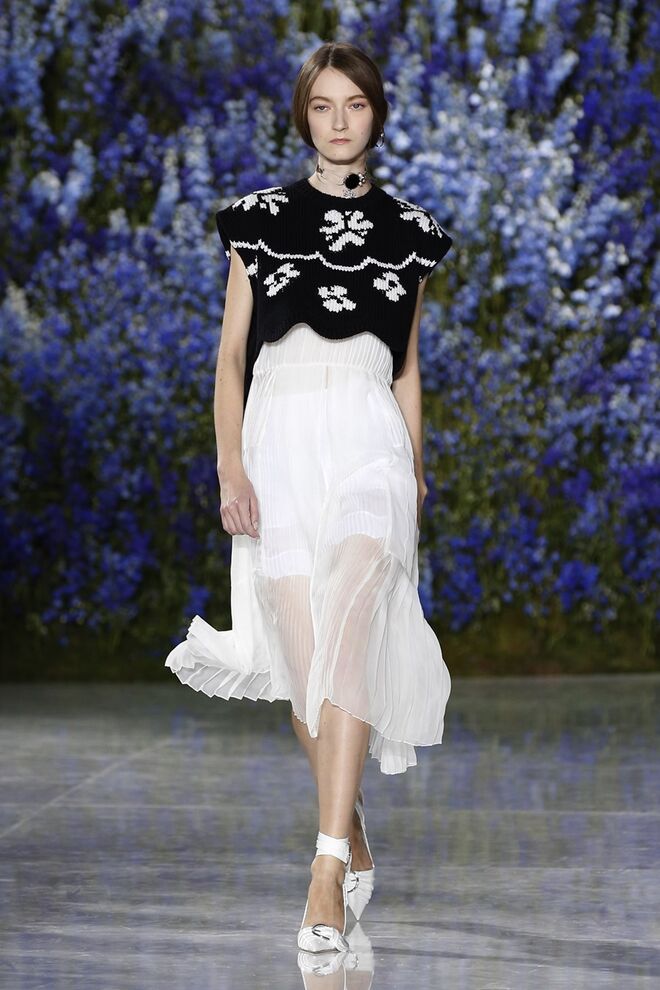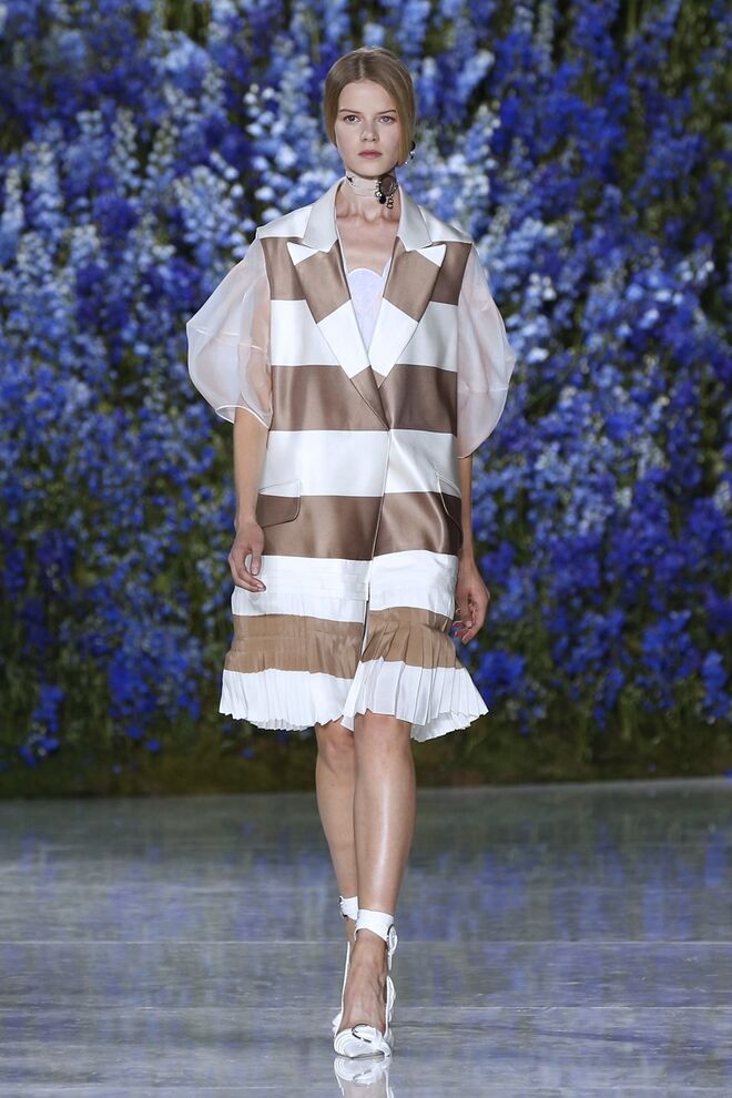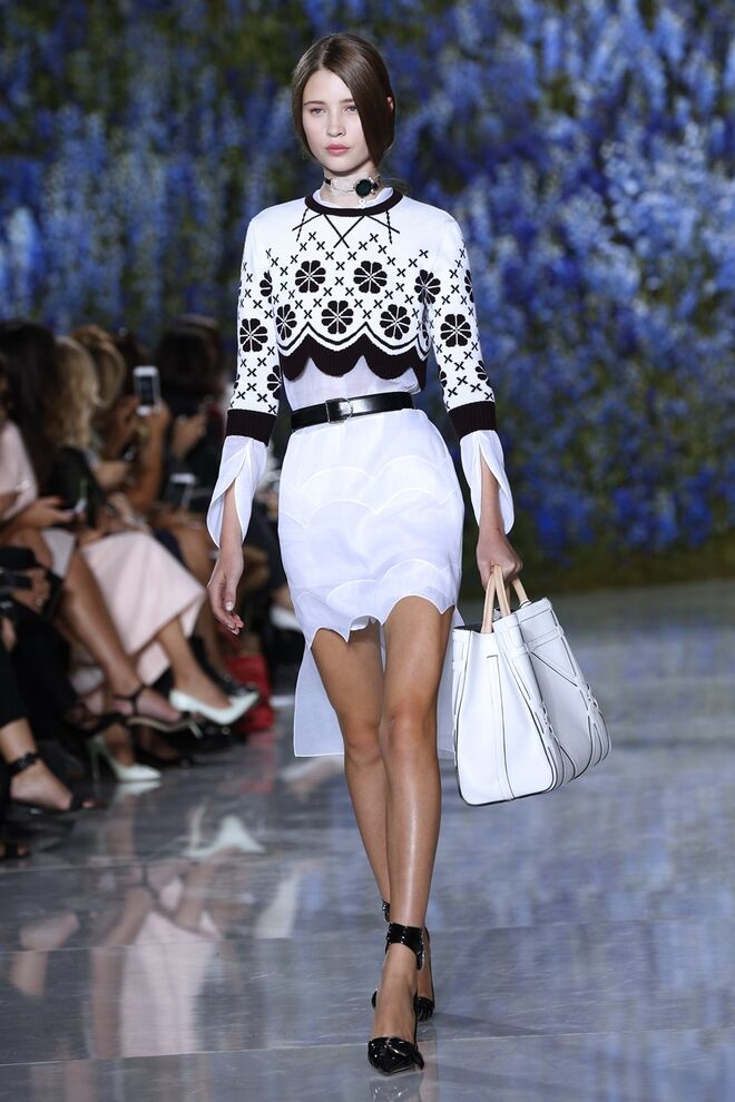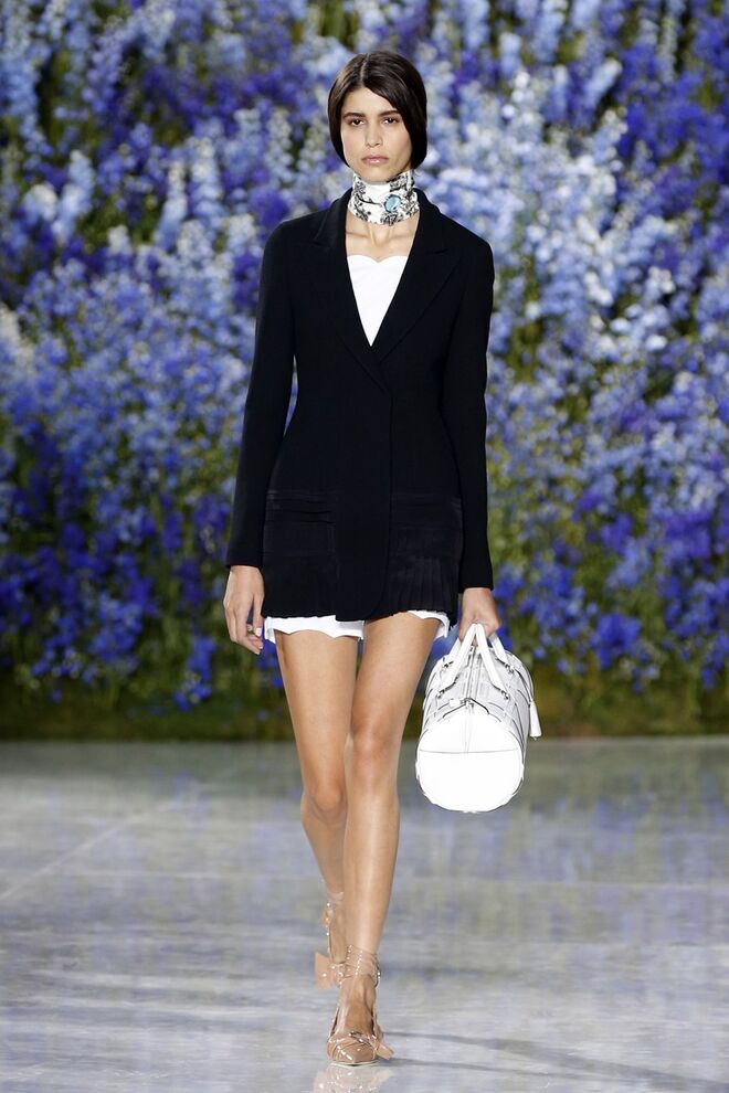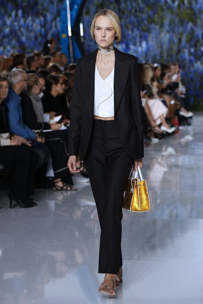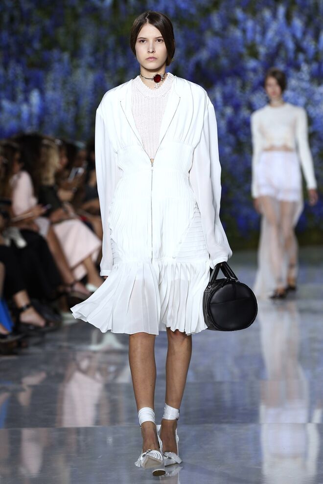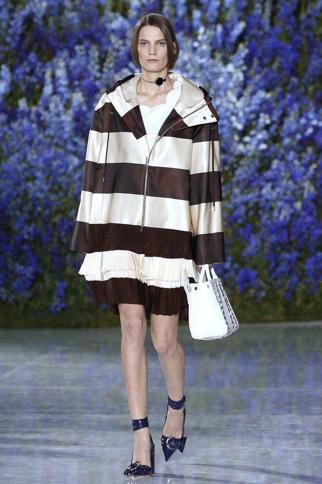 O branco e o preto andam lado a lado com as riscas e os tecidos recortados na nova coleção Dior. Destacam-se os acessórios em dourado e branco.