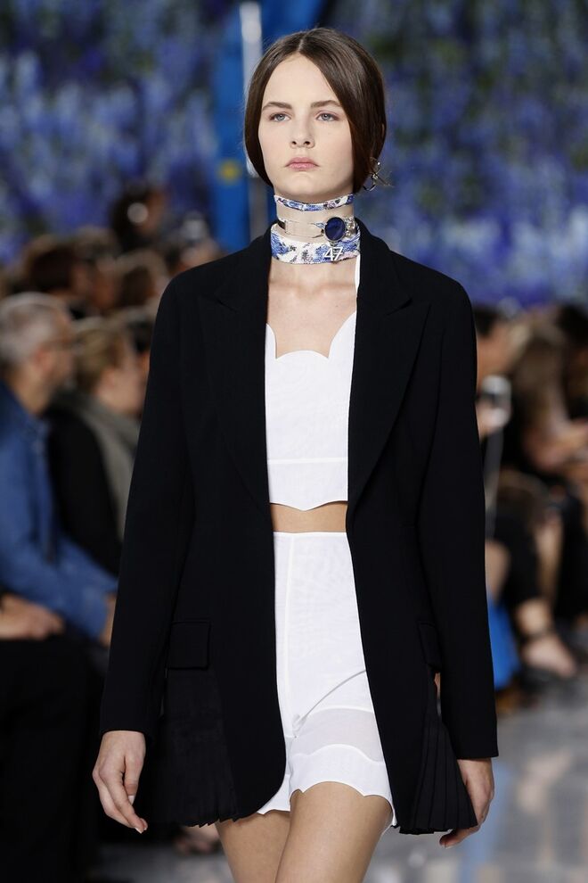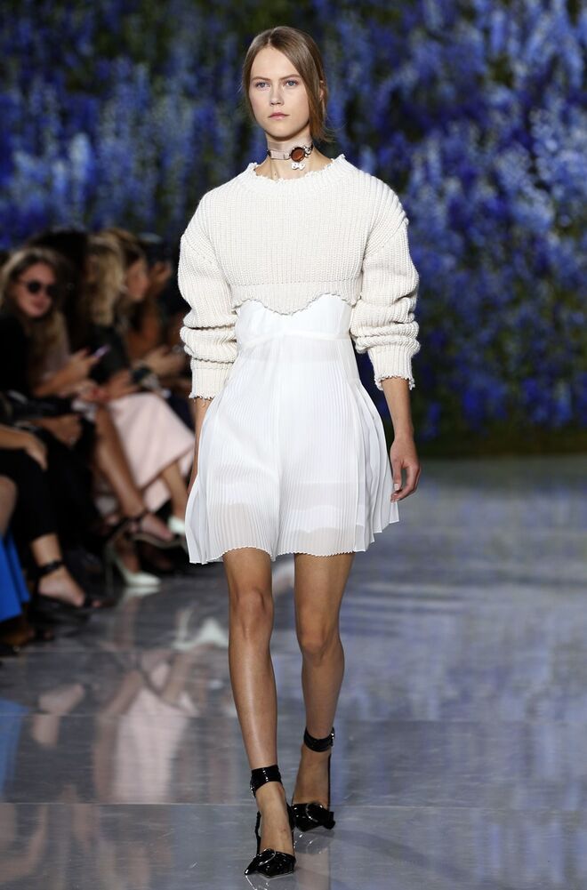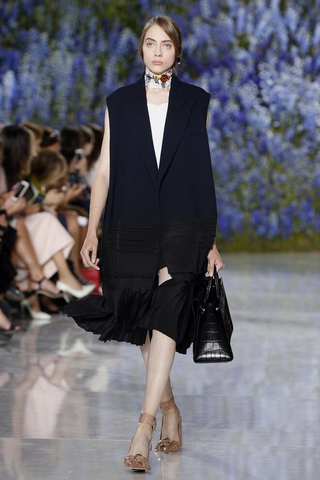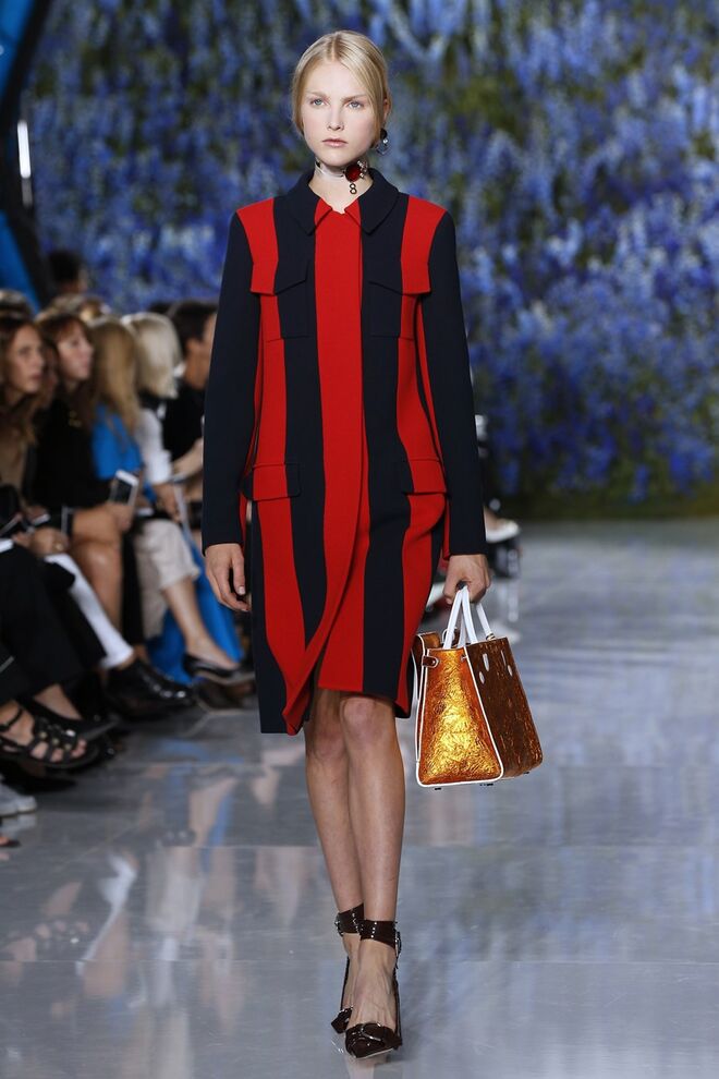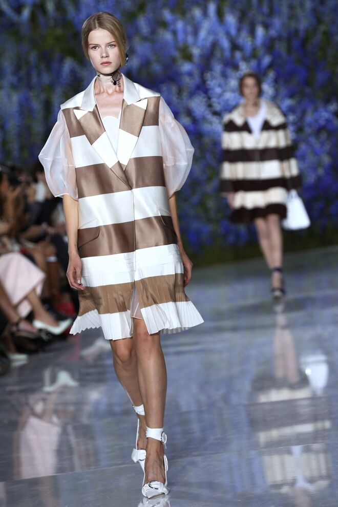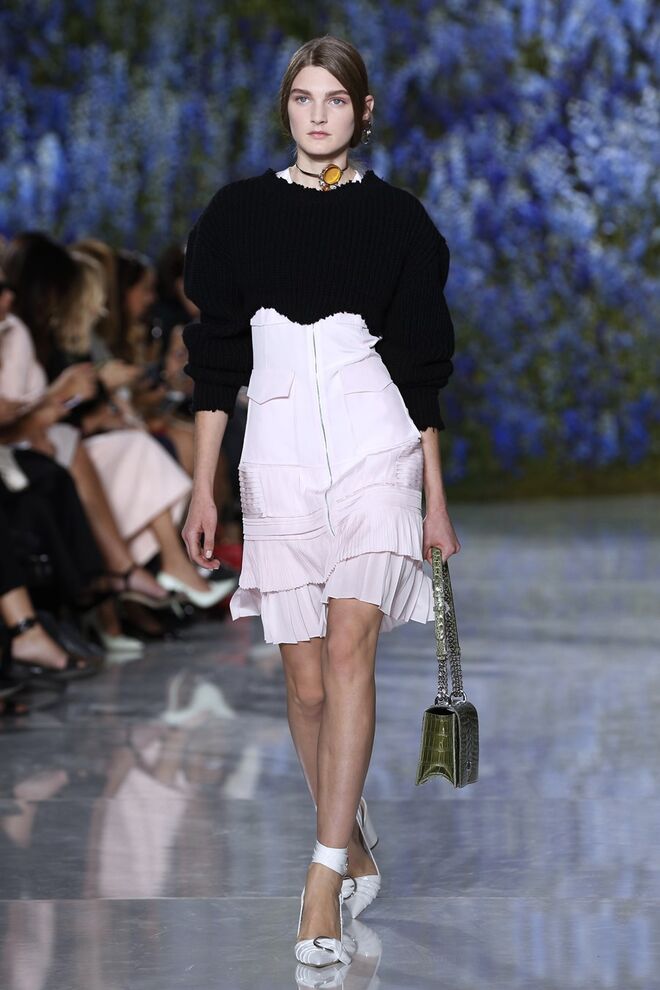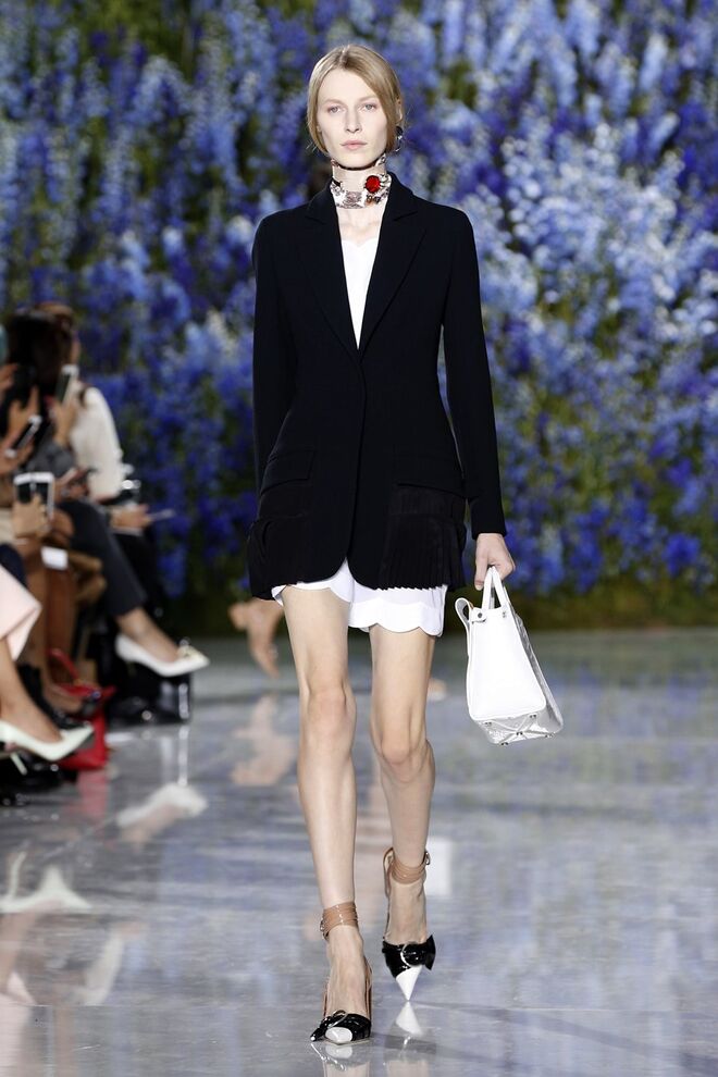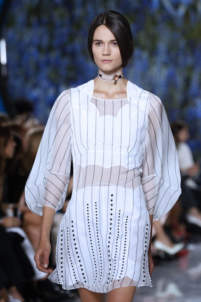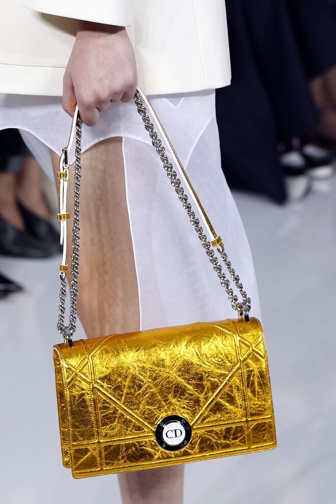 O branco e o preto andam lado a lado com as riscas e os tecidos recortados na nova coleção Dior. Destacam-se os acessórios em dourado e branco.
