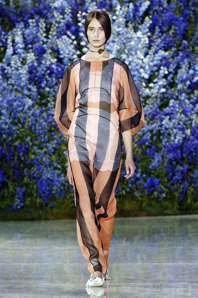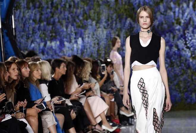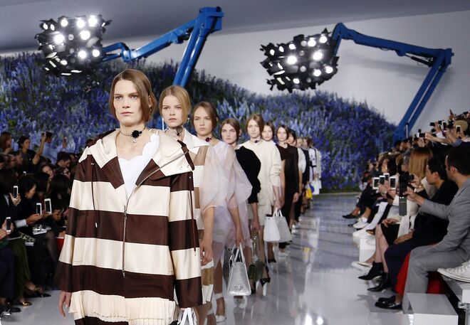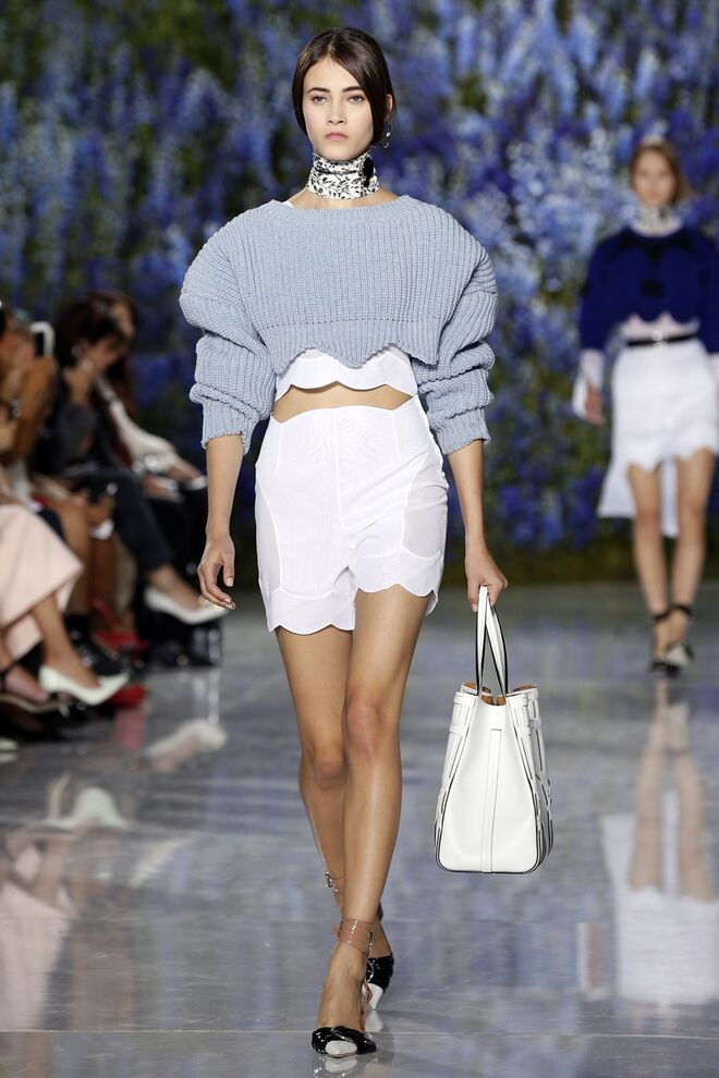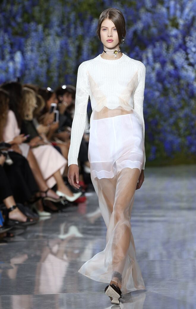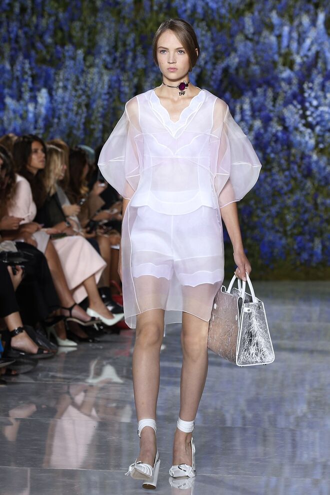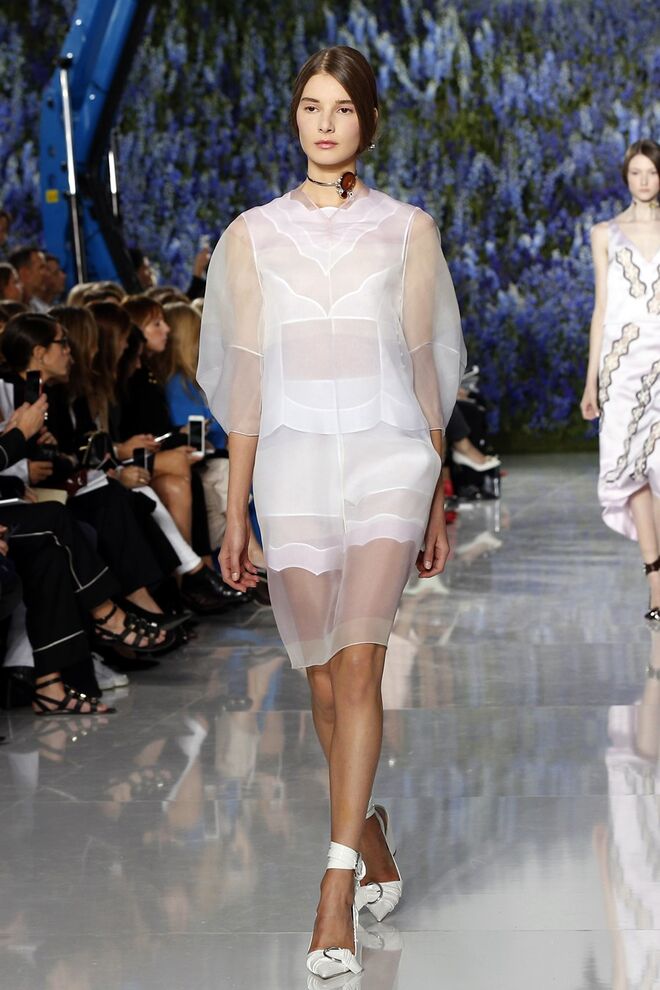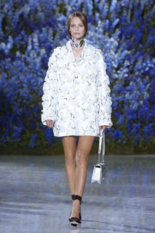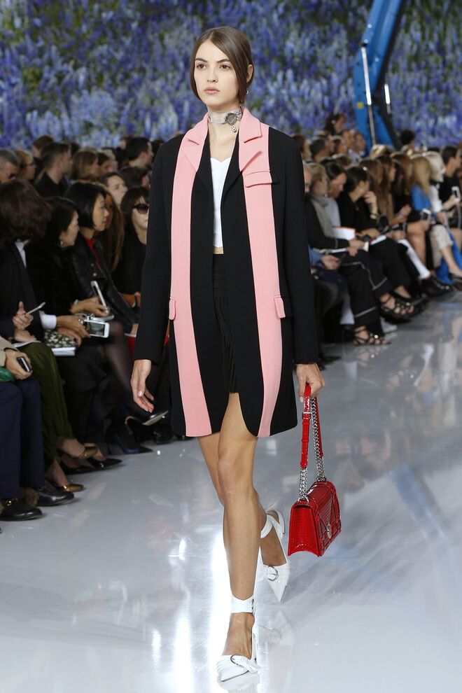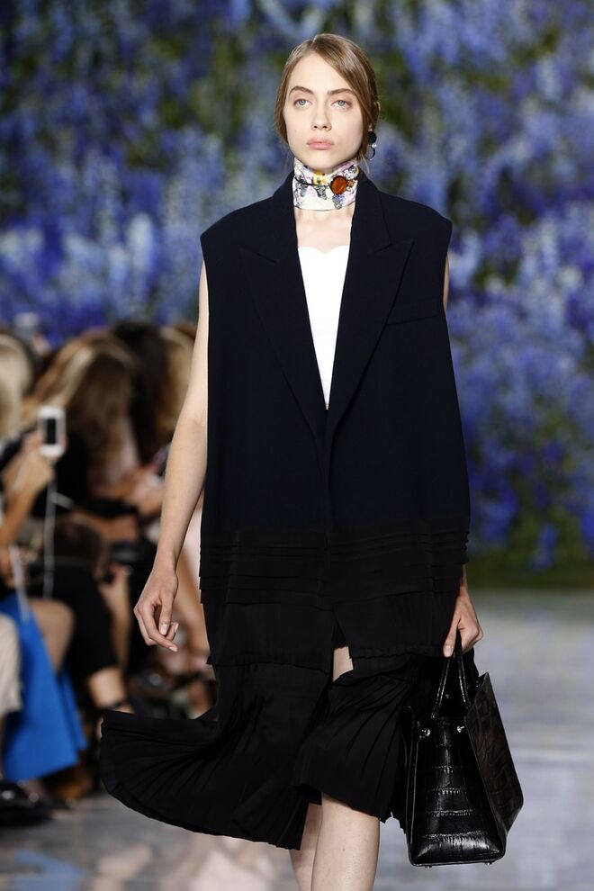 O branco e o preto andam lado a lado com as riscas e os tecidos recortados na nova coleção Dior. Destacam-se os acessórios em dourado e branco.
