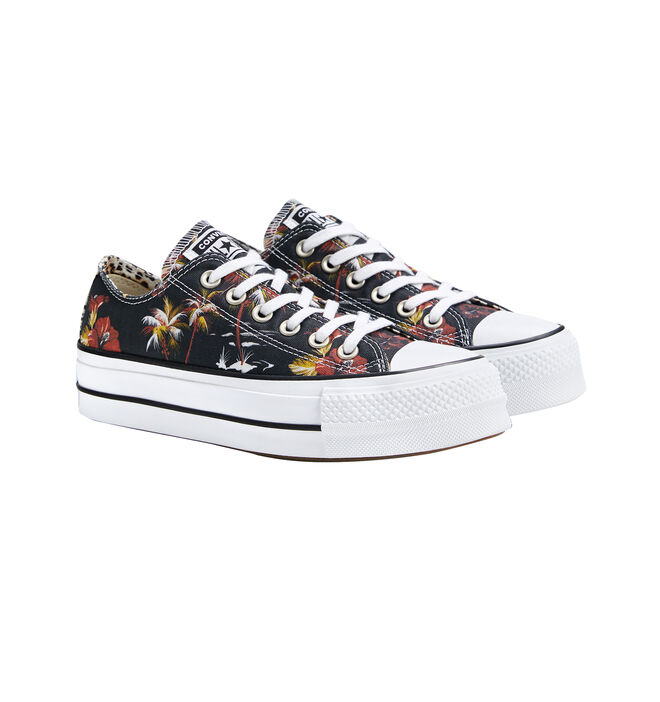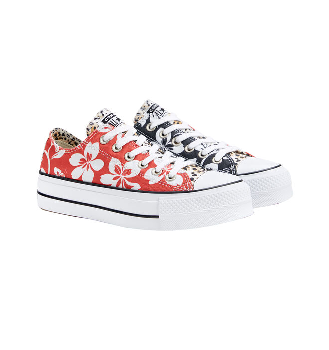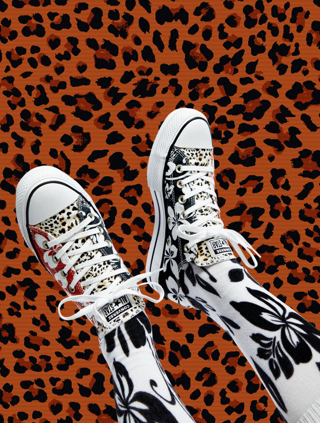 É uma parceria perfeita para vestir a descontração do verão. A Converse exclusive for Bershka reinventa o clássico modelo Chuck Taylor em versão botim ou ténis, e em sola XXL, mas com padrões tigre, leopardo e serpente, misturados com cores extravagantes ou com o estampado havaiano.