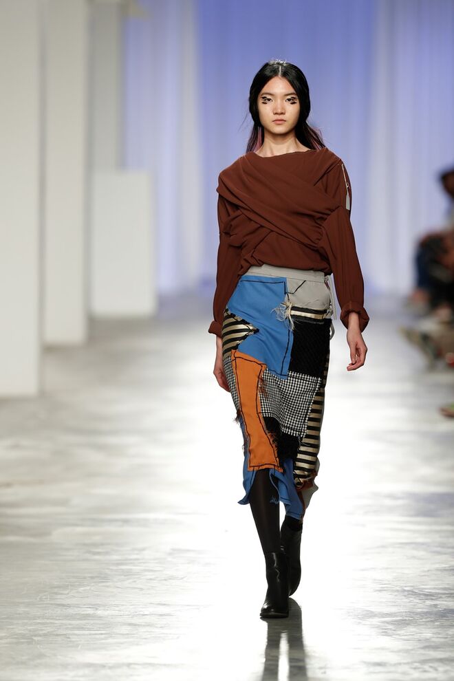Em destaque estão as peças feitas com painéis de tecidos atados uns aos outros, peças com o mínimo de acabamentos.