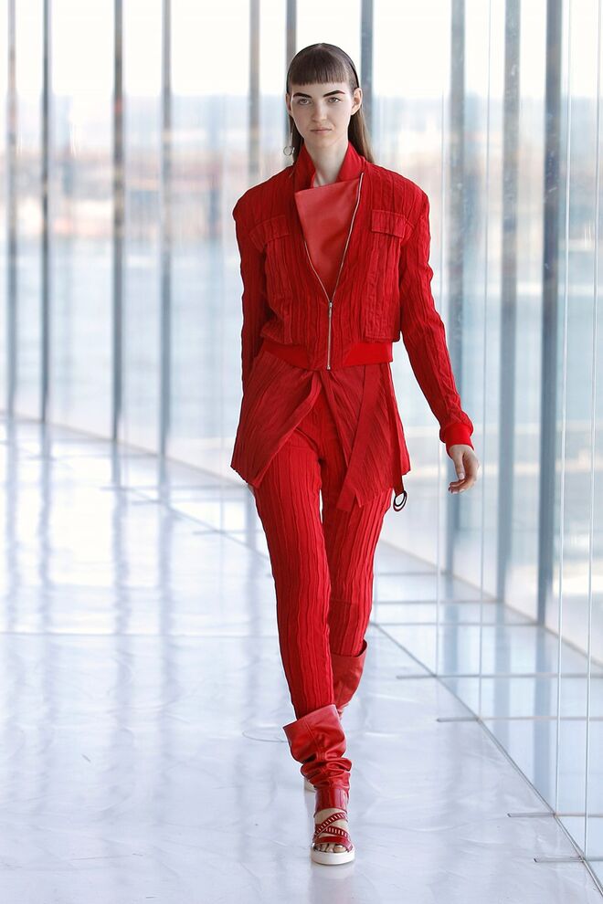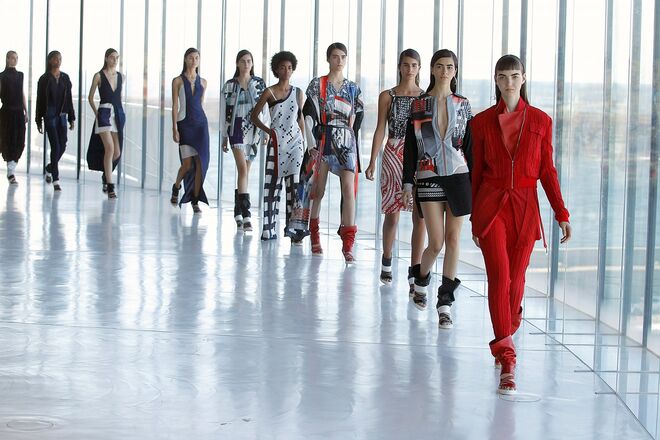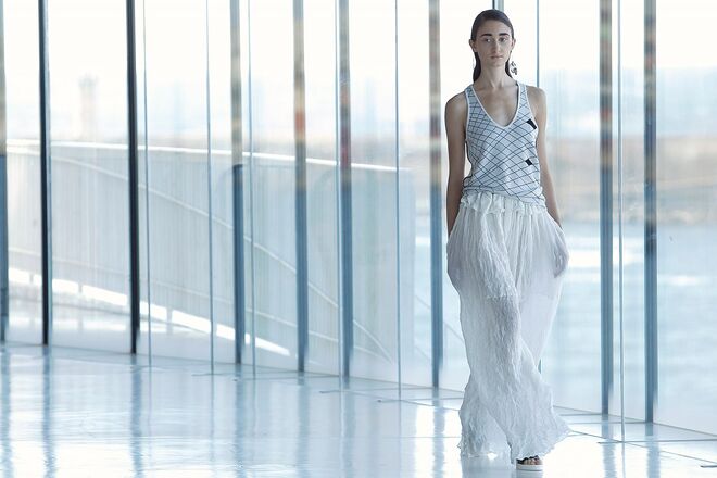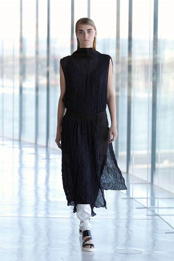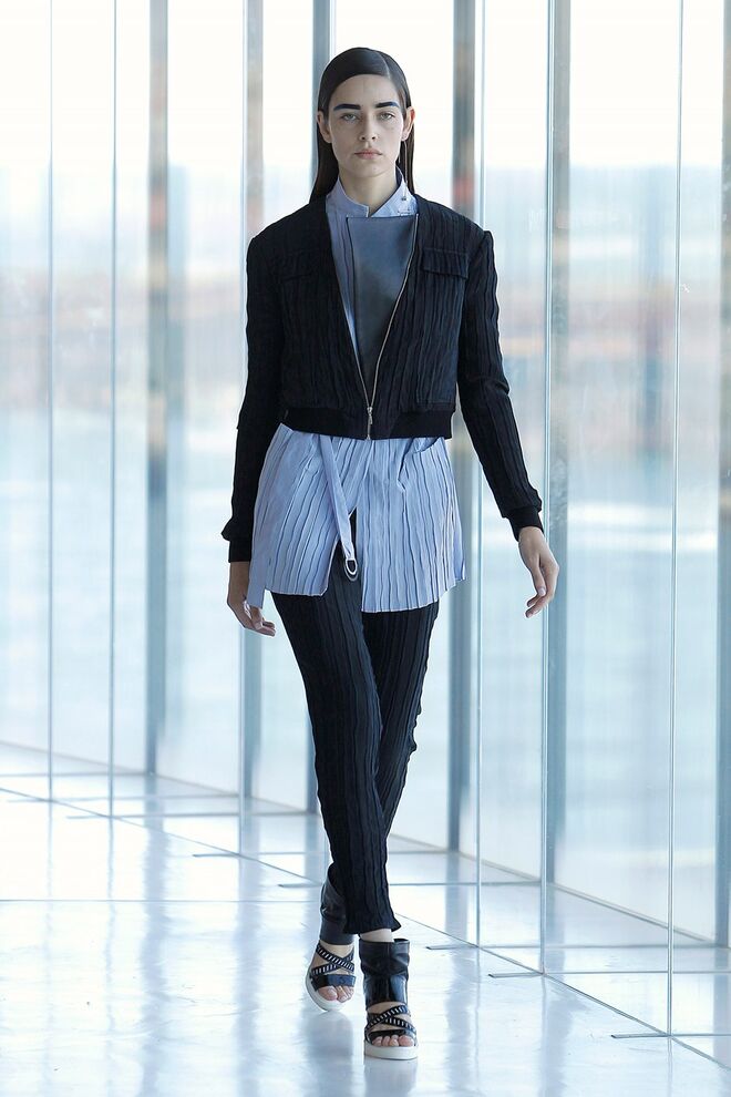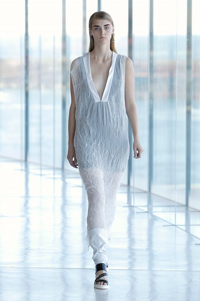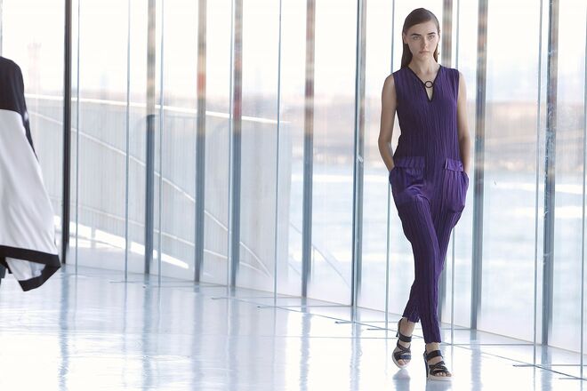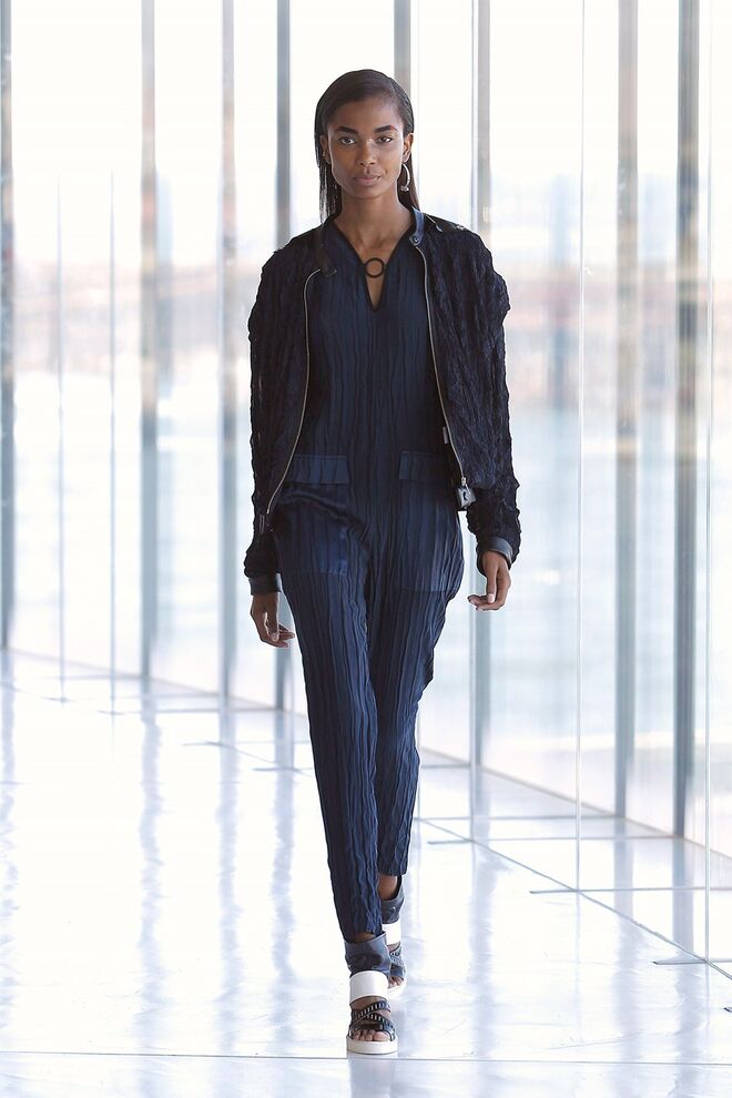 Os tecidos são técnicos plissados e amarrotados, estampados com foil, peles metalizadas, linho stretch e malhas duplas de algodão. Os materiais são então easy-to-wear, indo ao encontro daquilo que as mulheres procuram. "Viaja-se cada vez mais e tem-se cada vez menos tempo (...) esta coleção é prática, é simples, a pensar nestas mulheres" [que viajam muito].