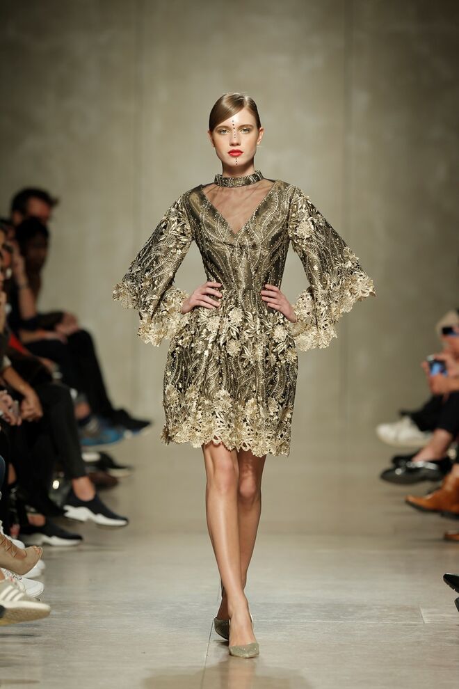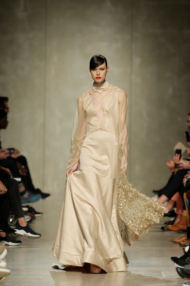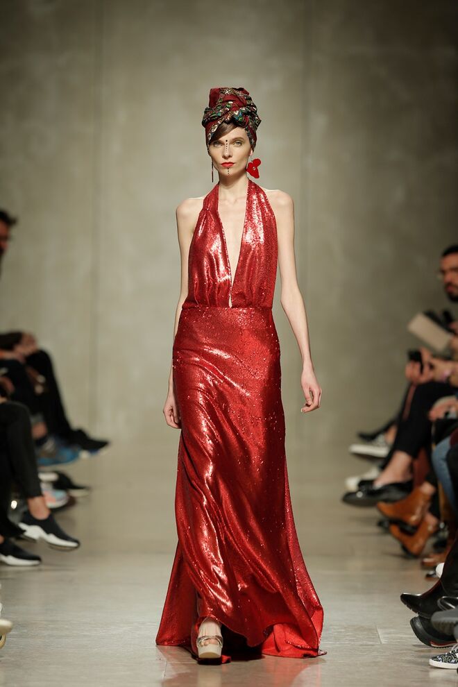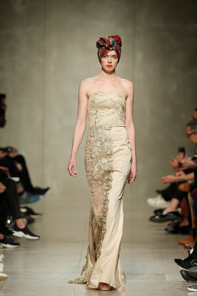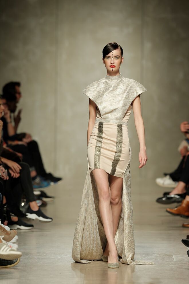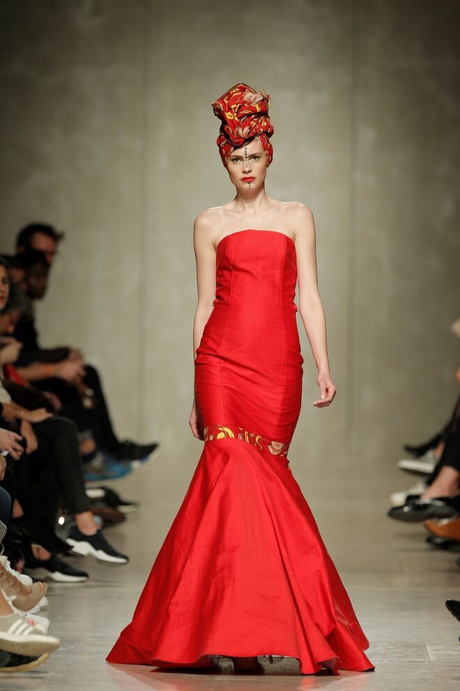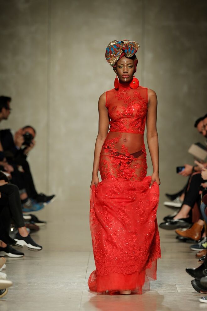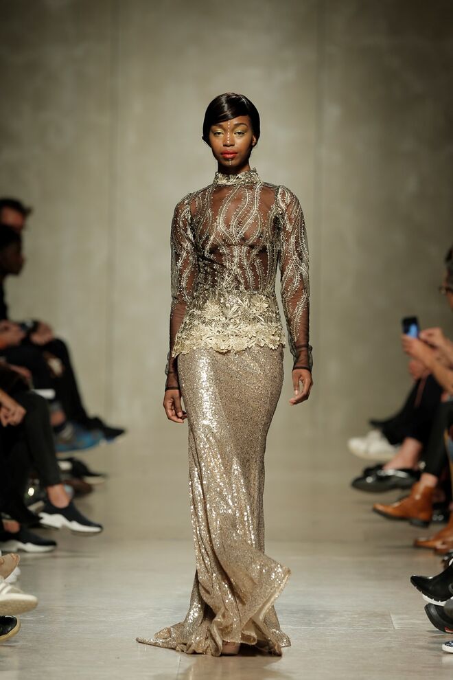 Delicada e refinada, esta coleção foi inspirada na situação atual da mulher Angolana no mundo. Uma coleção sublime de vestidos de noite dourados e vermelhos trabalhados ao detalhe.
