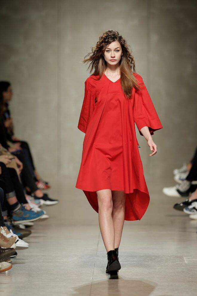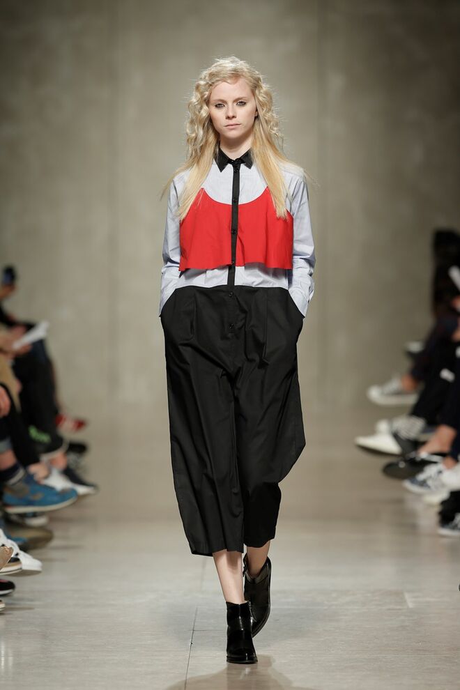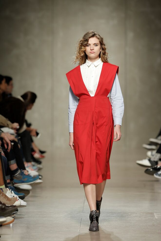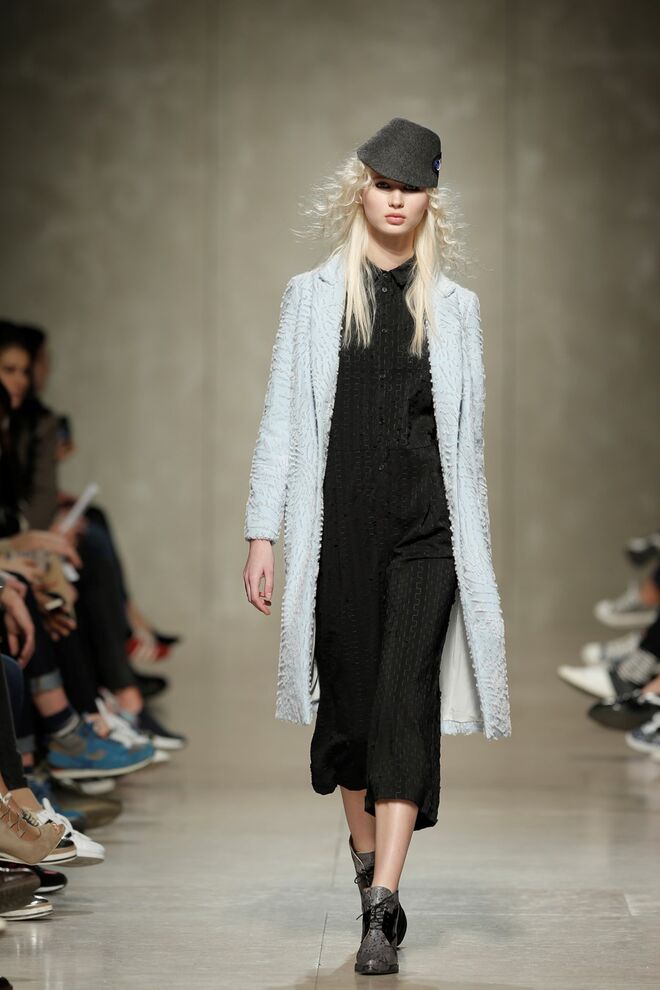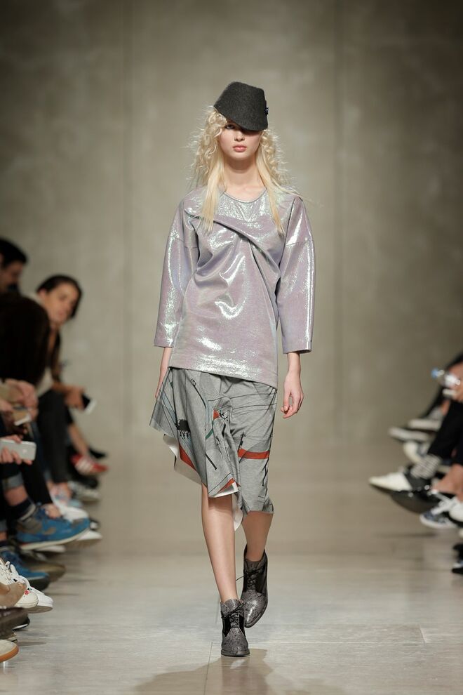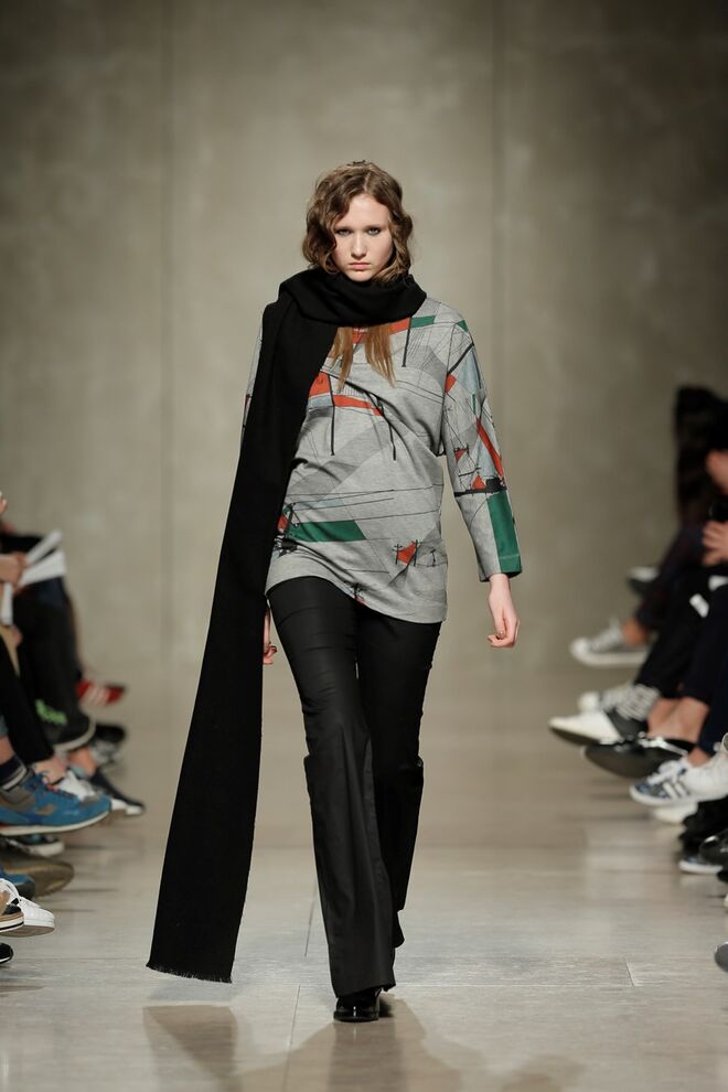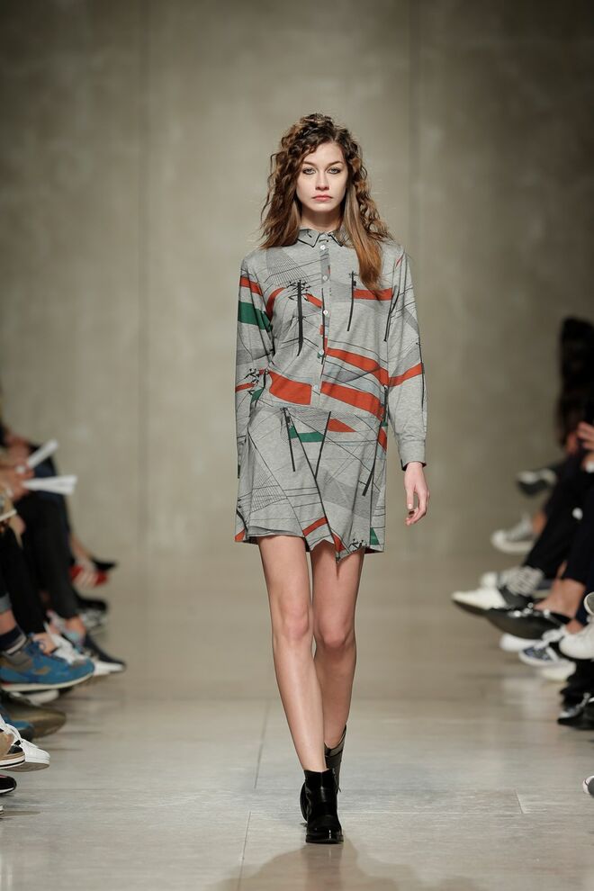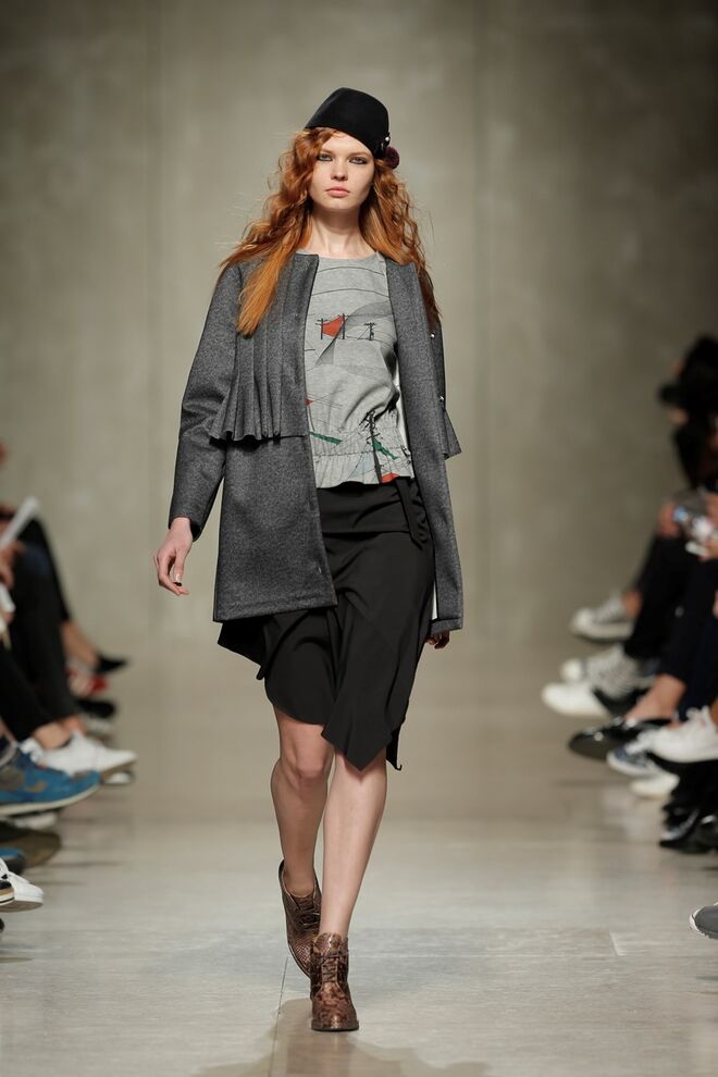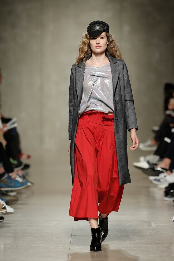 Algumas ideias da coleção de verão 2016 são revisitadas e aplicadas nesta coleção, como os godés que saem de pregas, criando volumes simétricos desta vez usados também nos casacos e sweats.