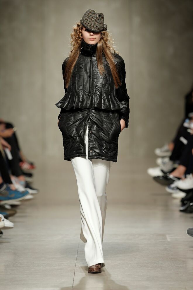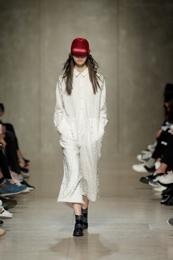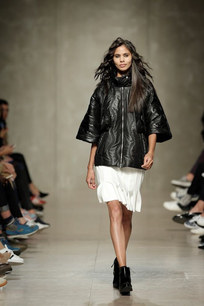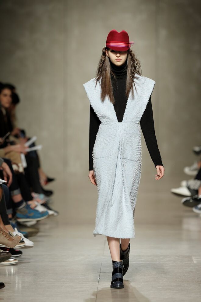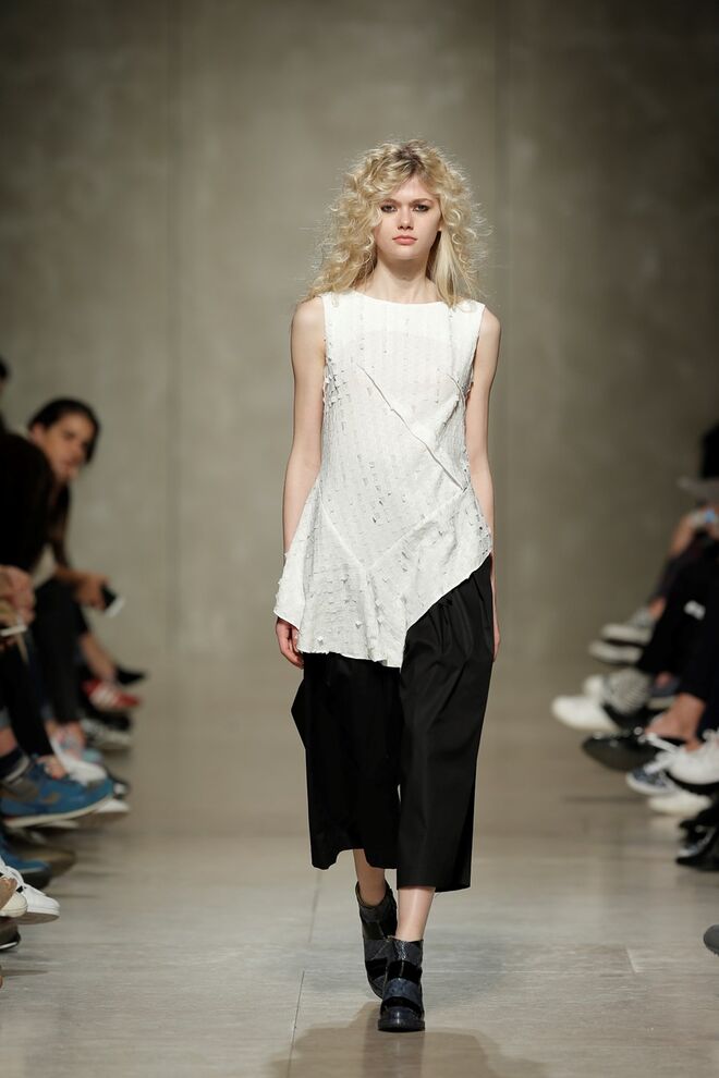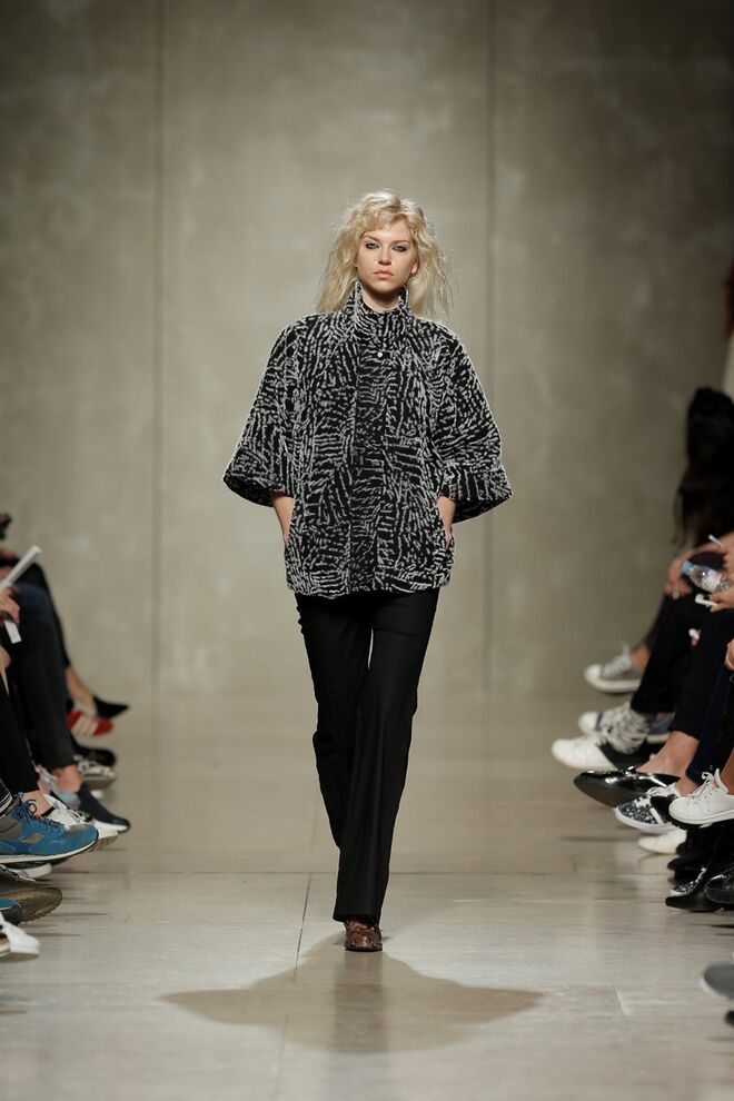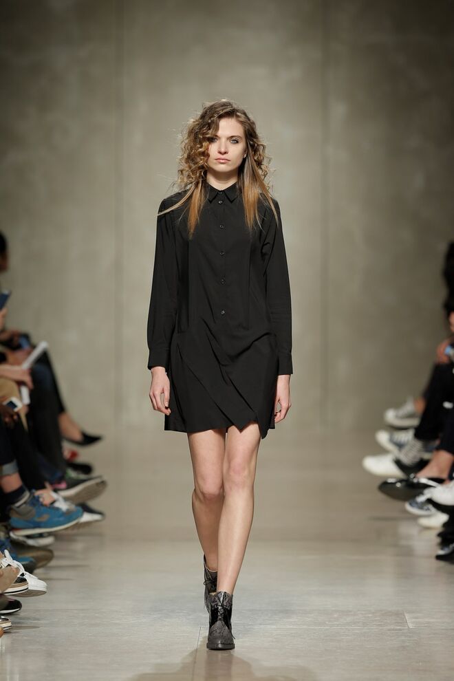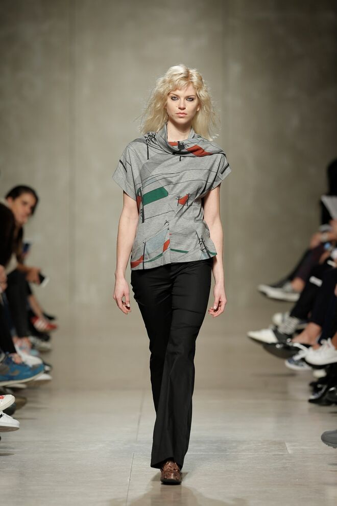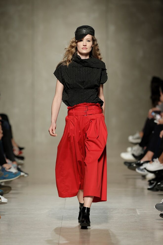 Algumas ideias da coleção de verão 2016 são revisitadas e aplicadas nesta coleção, como os godés que saem de pregas, criando volumes simétricos desta vez usados também nos casacos e sweats.