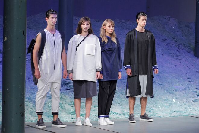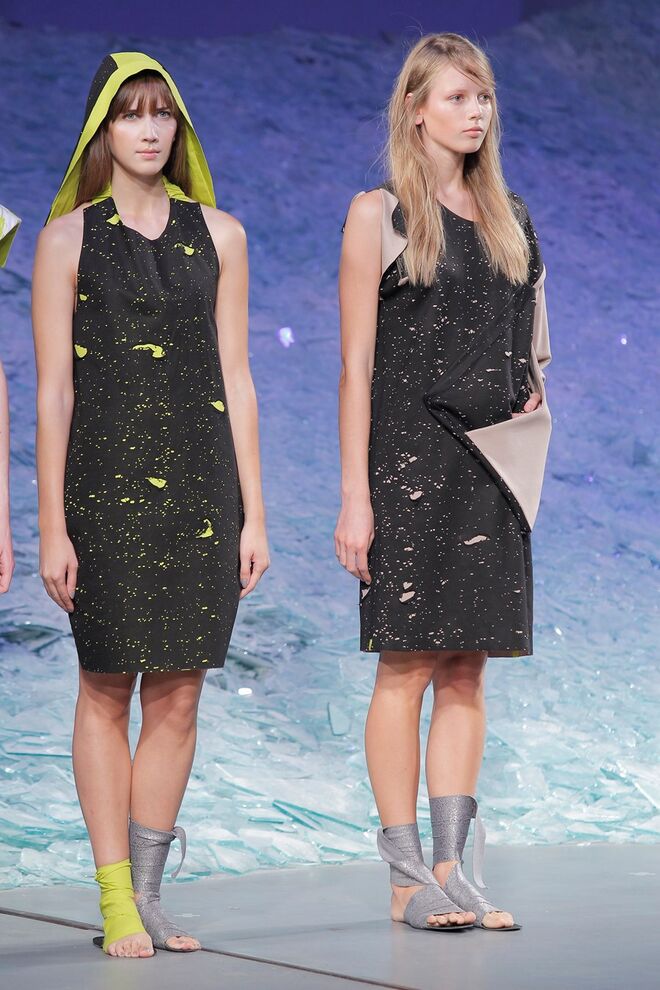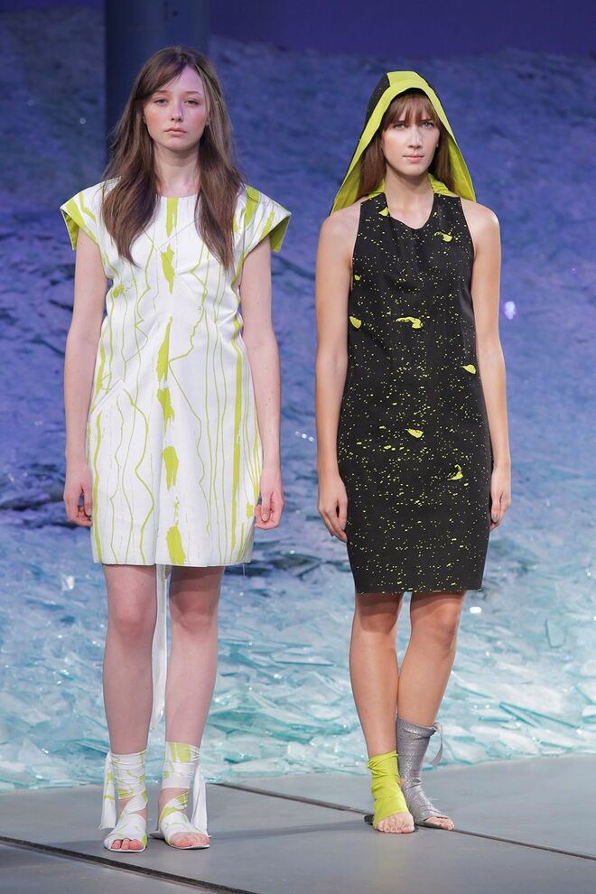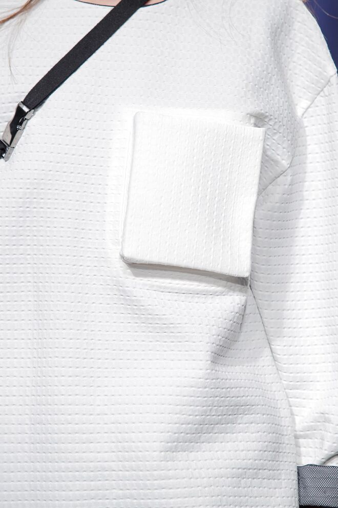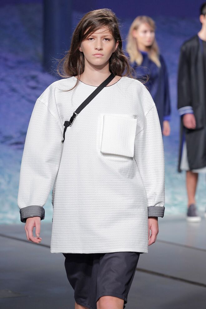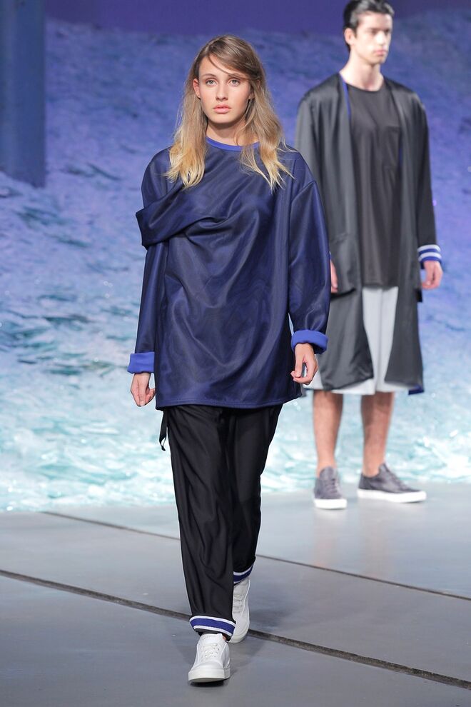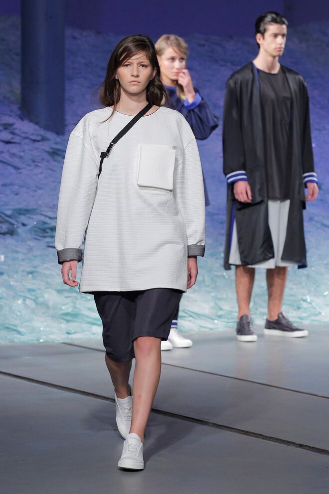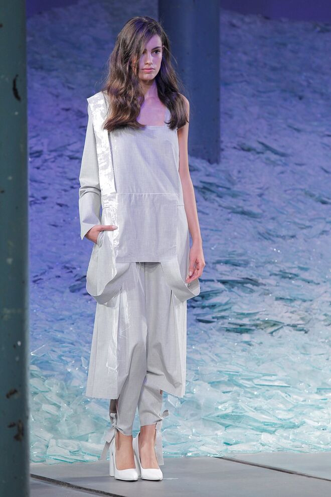 ÁGATA GONÇALVES "SURVIVAL UNDER ATOMIC ATTACK" O ponto de partida desta coleção foi o conceito pré e pós-apocalítico, cuja temática envolve vários pontos: a subcultura prepper, as fardas médica e militares da Segunda Guerra Mundial, assim como um certo paradoxo entre a proteção extrema e a fragilidade. O sportswear foi o universo de referência, permitindo desenvolver uma coleção rica em elementos gráficos traduzidos nos estampados, em pormenores e nos acabamentos. Os materiais foram intervencionados, sendo as bases alteradas através de termocolagens, produzindo algumas combinações com aparência claramente destroy. A paleta revela-se através de tons neutros como o branco, o cinza, o nude e o preto que são contrastados com um verde ácido, que reia no seu meio como um permanente intruso.