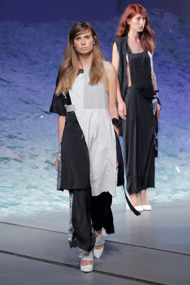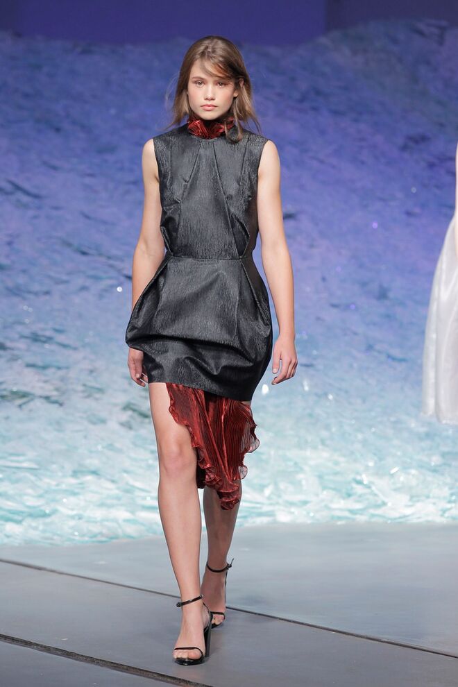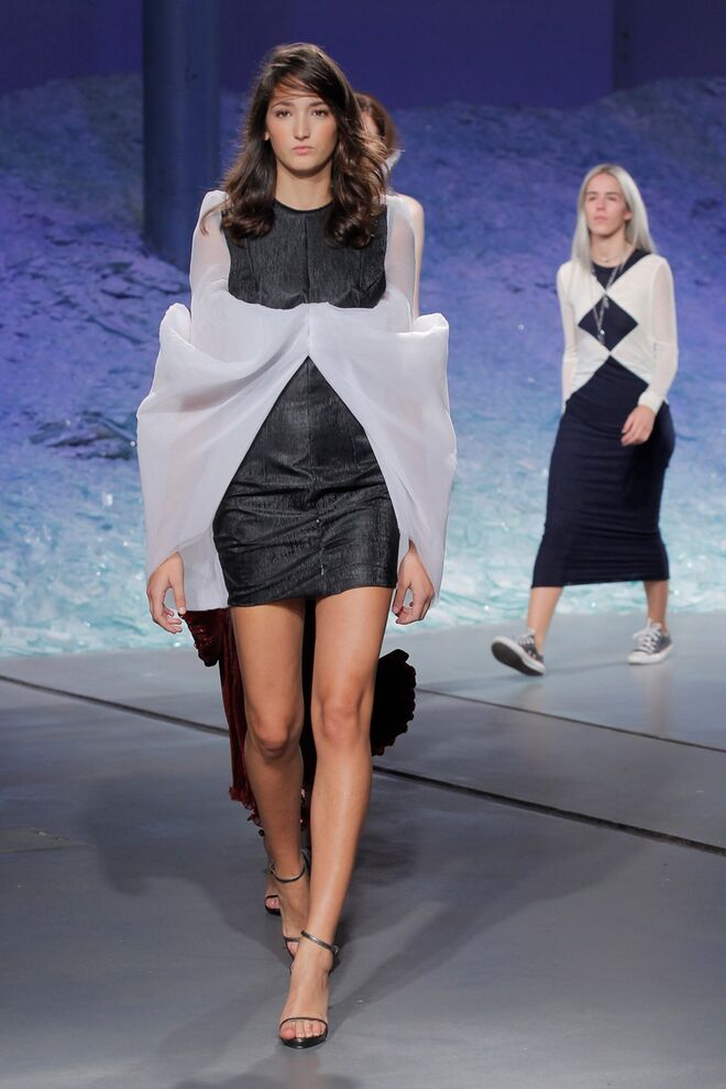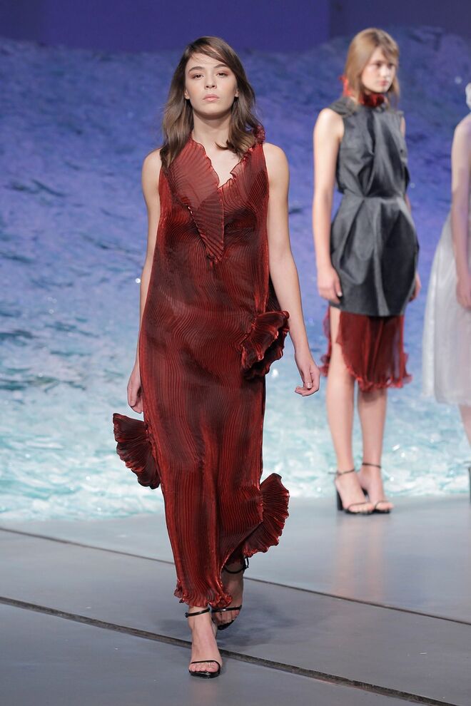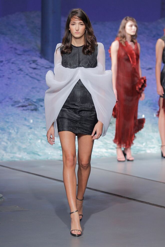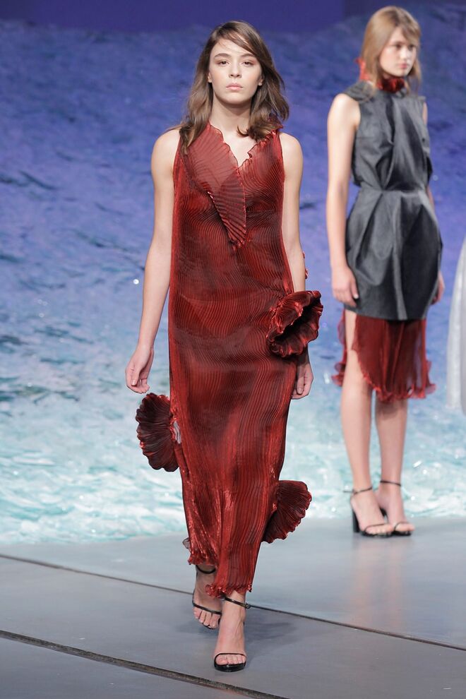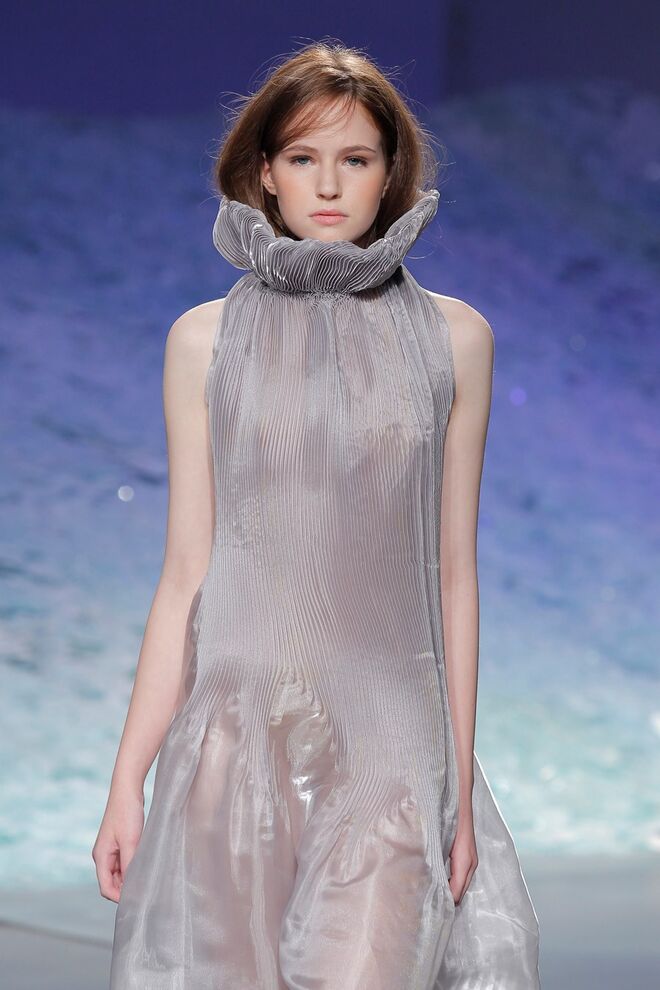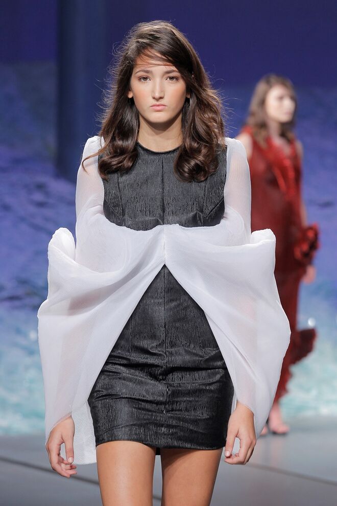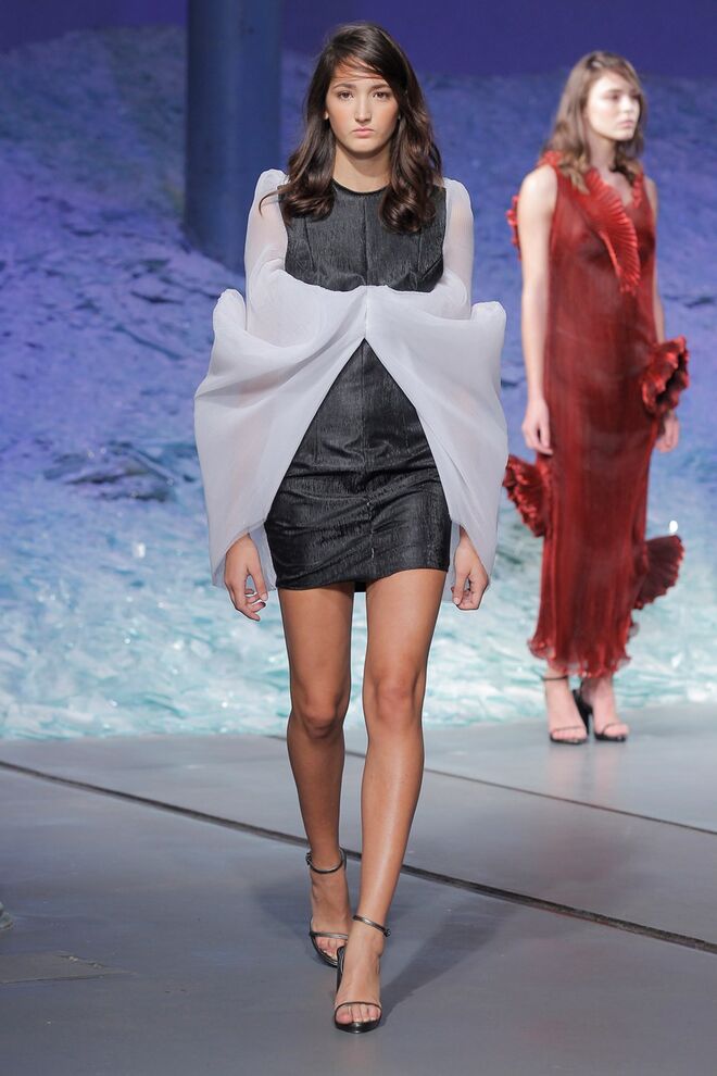 PATRÍCIA AUGUSTA "KUSNTFORMEN DER NATUR" A coleção remete para os tesouros retirados do fundo do mar e apresentados no livro de ilustrações científicas "kUNSTFORMEN DER NATUR", da autoria do biólogo alemão Ernst Haeckel. As formas e volumes são de inspiração fóssil e orgânica, e os materiais espelham as construções complexas e rígidas contrabalançadas pela estrutura delicada dos plissados. A paleta reflete a atmosfera existente no livro, apoiando-se em preto, branco e cinzentos, pontuados por um bordeaux.