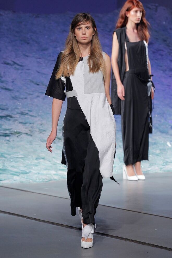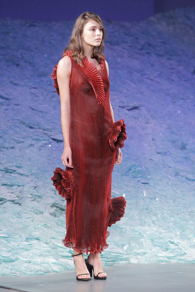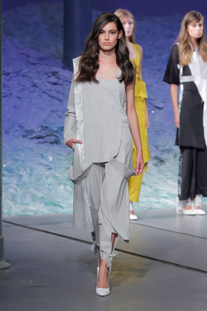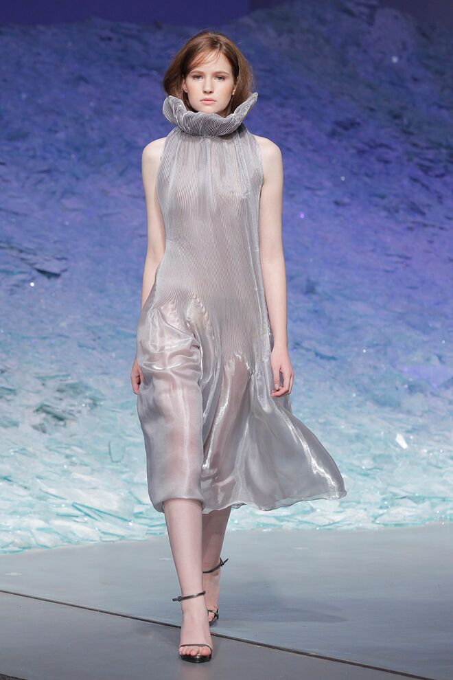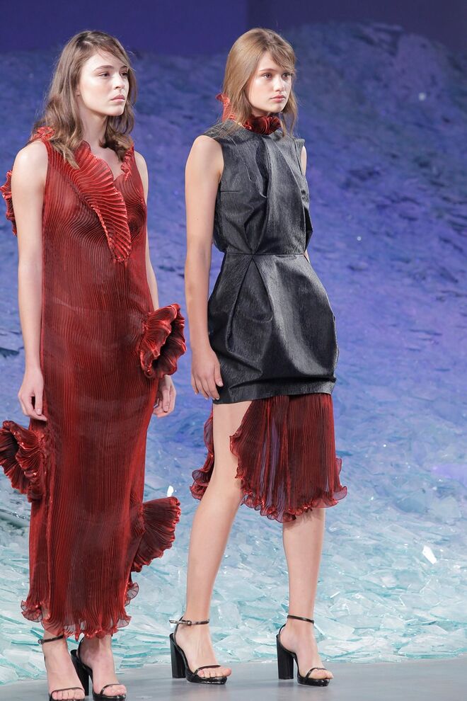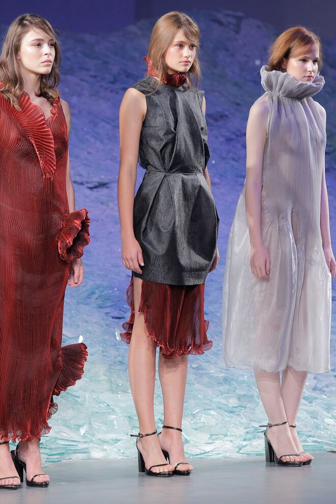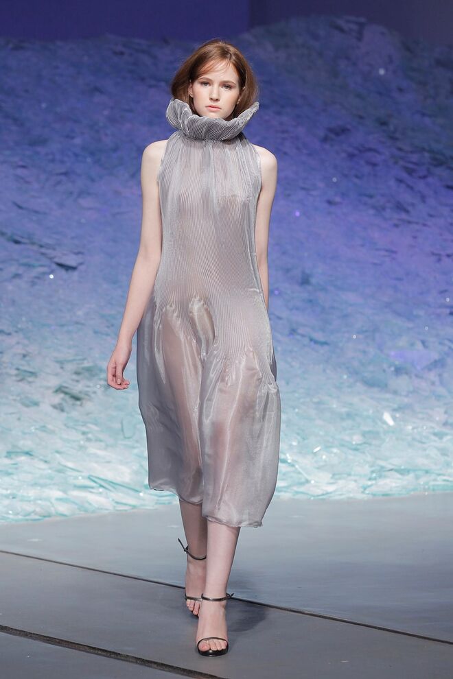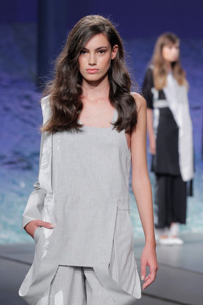 PATRÍCIA AUGUSTA "KUSNTFORMEN DER NATUR" A coleção remete para os tesouros retirados do fundo do mar e apresentados no livro de ilustrações científicas "kUNSTFORMEN DER NATUR", da autoria do biólogo alemão Ernst Haeckel. As formas e volumes são de inspiração fóssil e orgânica, e os materiais espelham as construções complexas e rígidas contrabalançadas pela estrutura delicada dos plissados. A paleta reflete a atmosfera existente no livro, apoiando-se em preto, branco e cinzentos, pontuados por um bordeaux.
