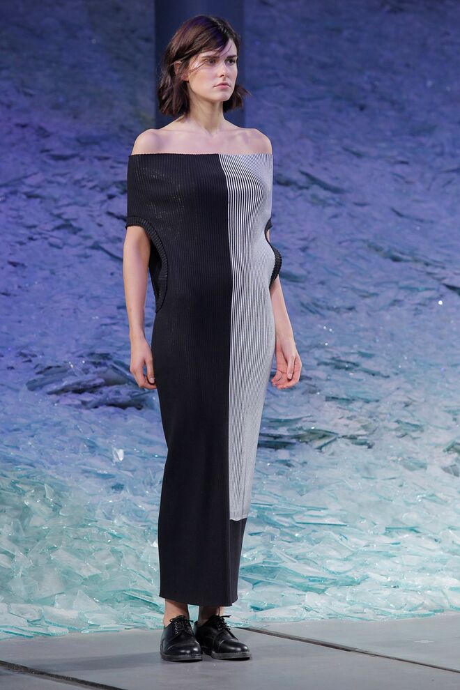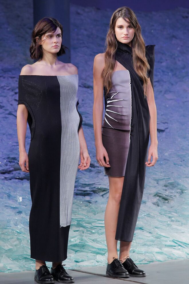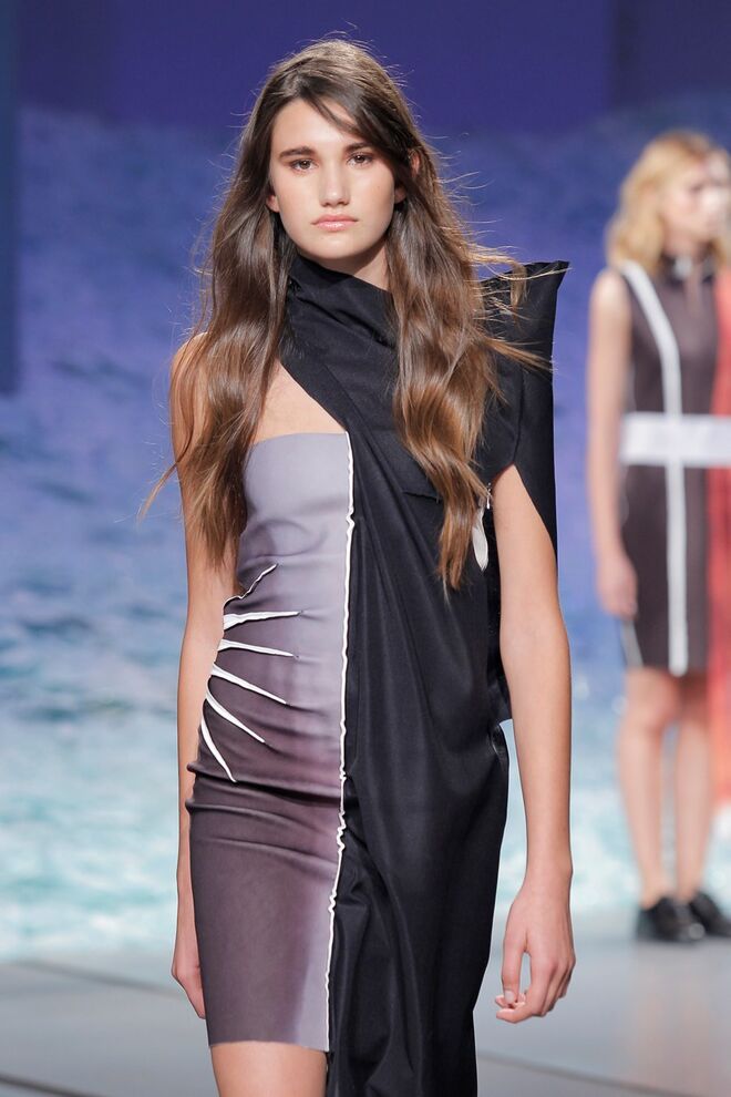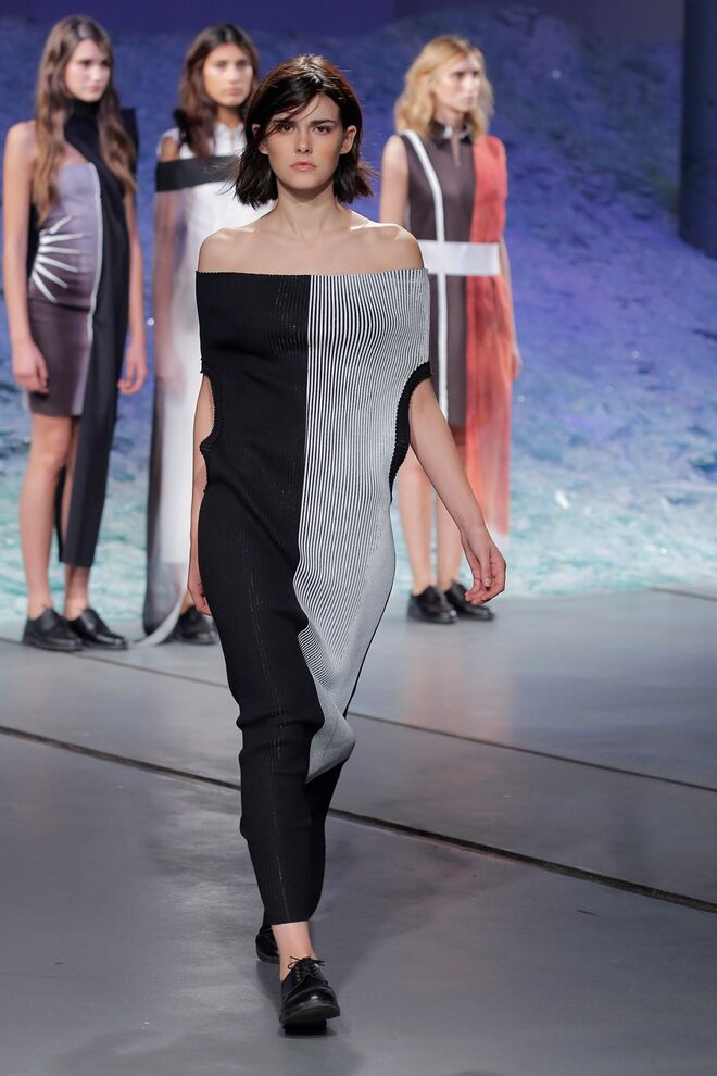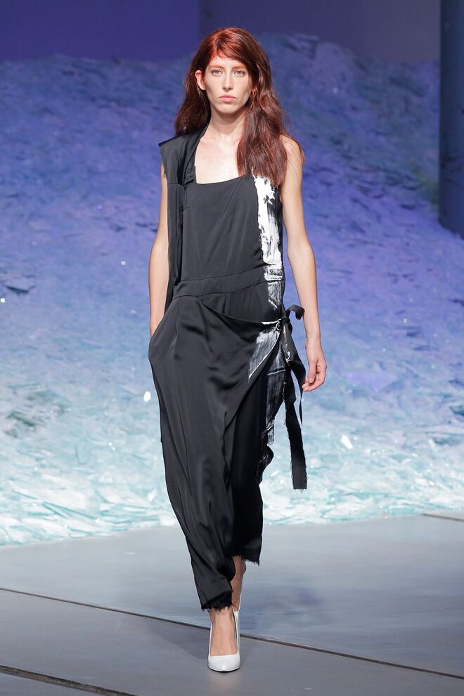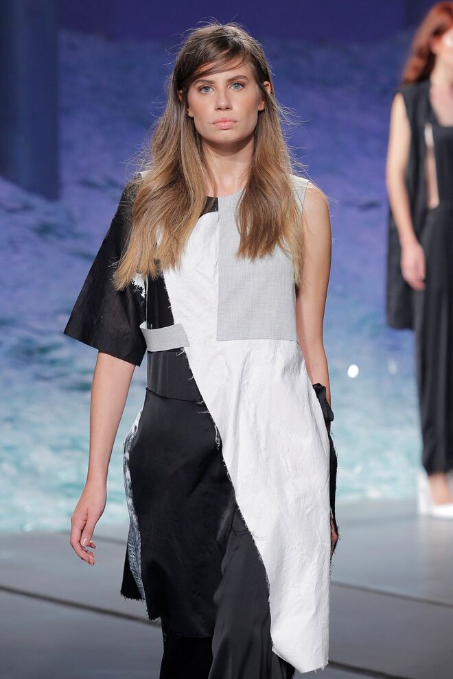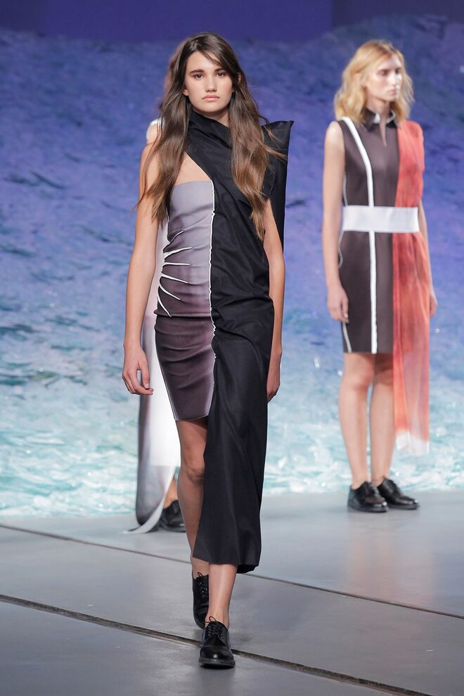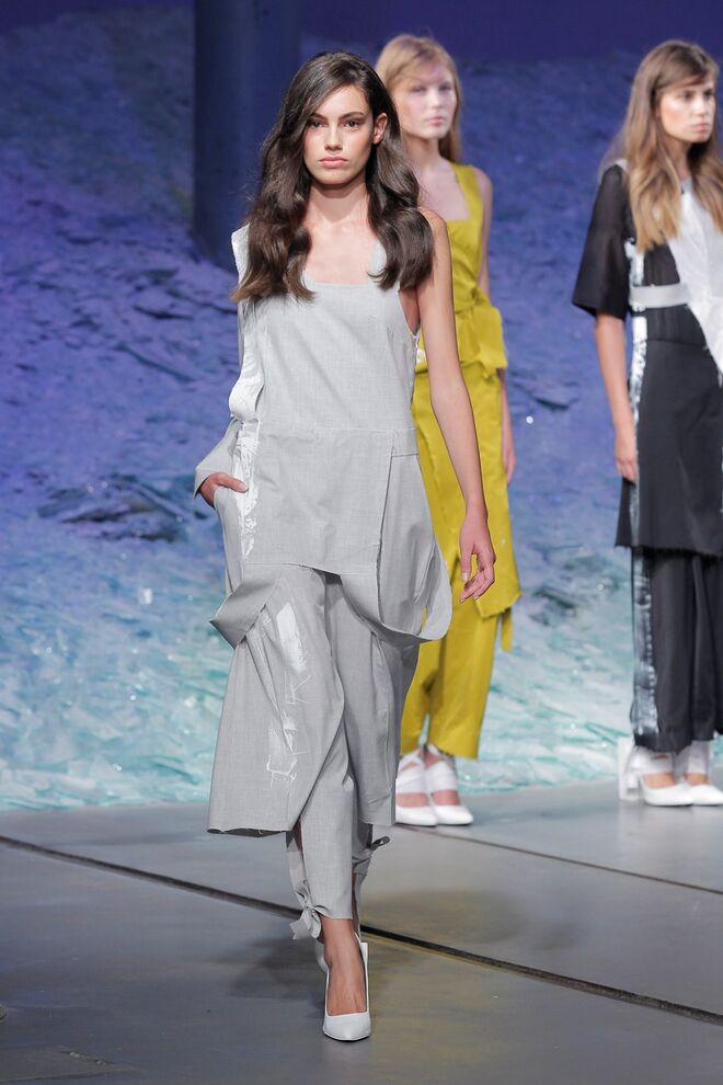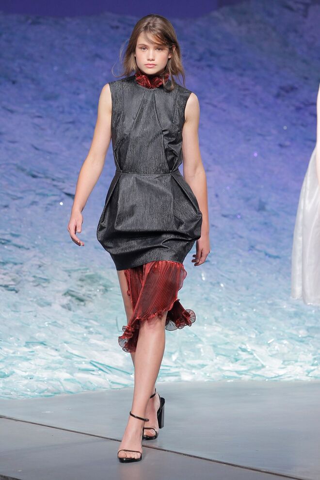 PATRÍCIA AUGUSTA "KUSNTFORMEN DER NATUR" A coleção remete para os tesouros retirados do fundo do mar e apresentados no livro de ilustrações científicas "kUNSTFORMEN DER NATUR", da autoria do biólogo alemão Ernst Haeckel. As formas e volumes são de inspiração fóssil e orgânica, e os materiais espelham as construções complexas e rígidas contrabalançadas pela estrutura delicada dos plissados. A paleta reflete a atmosfera existente no livro, apoiando-se em preto, branco e cinzentos, pontuados por um bordeaux.