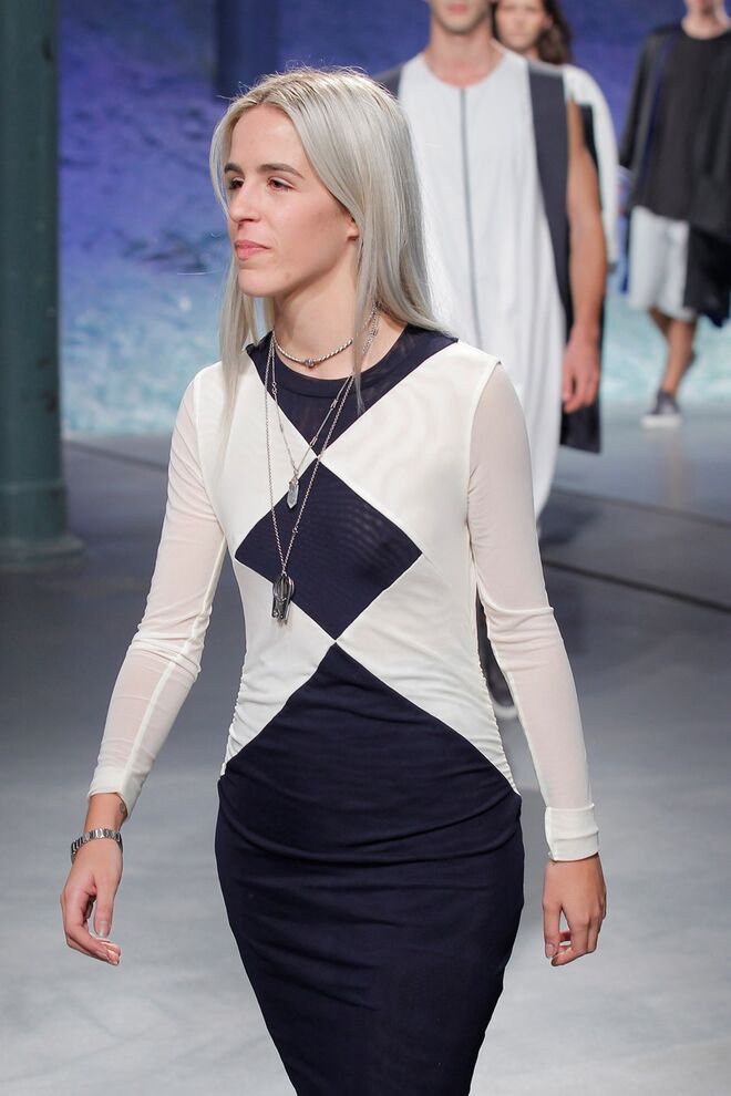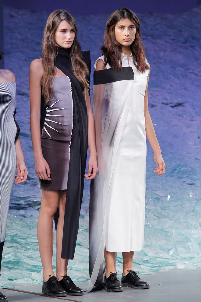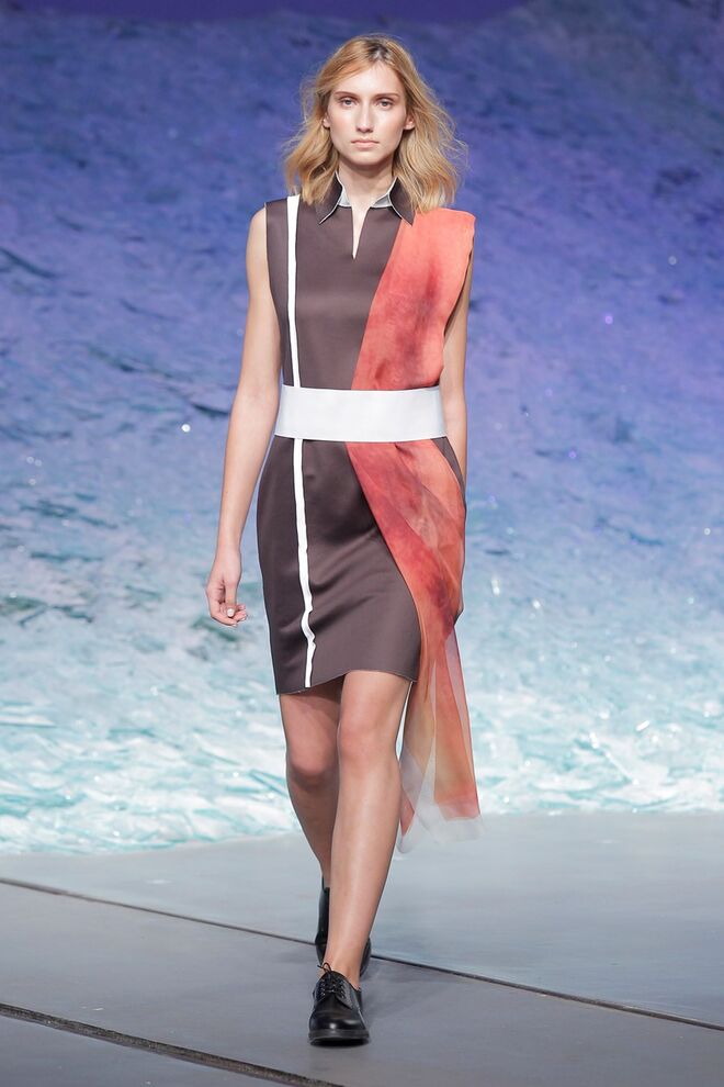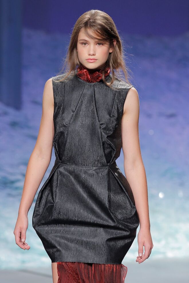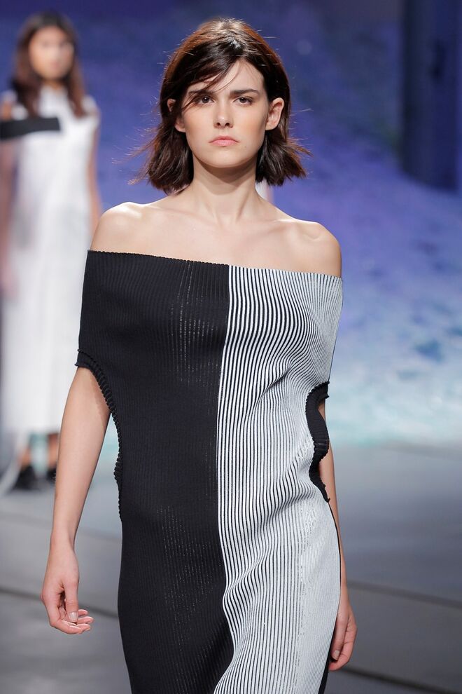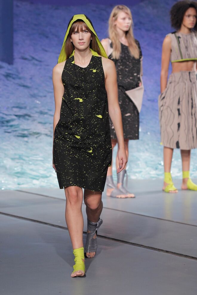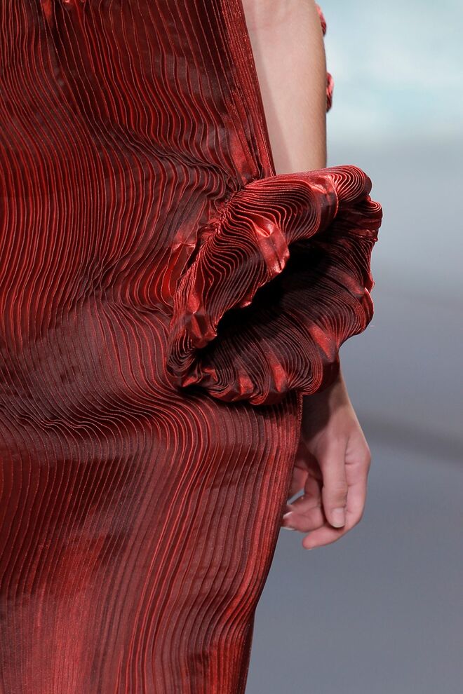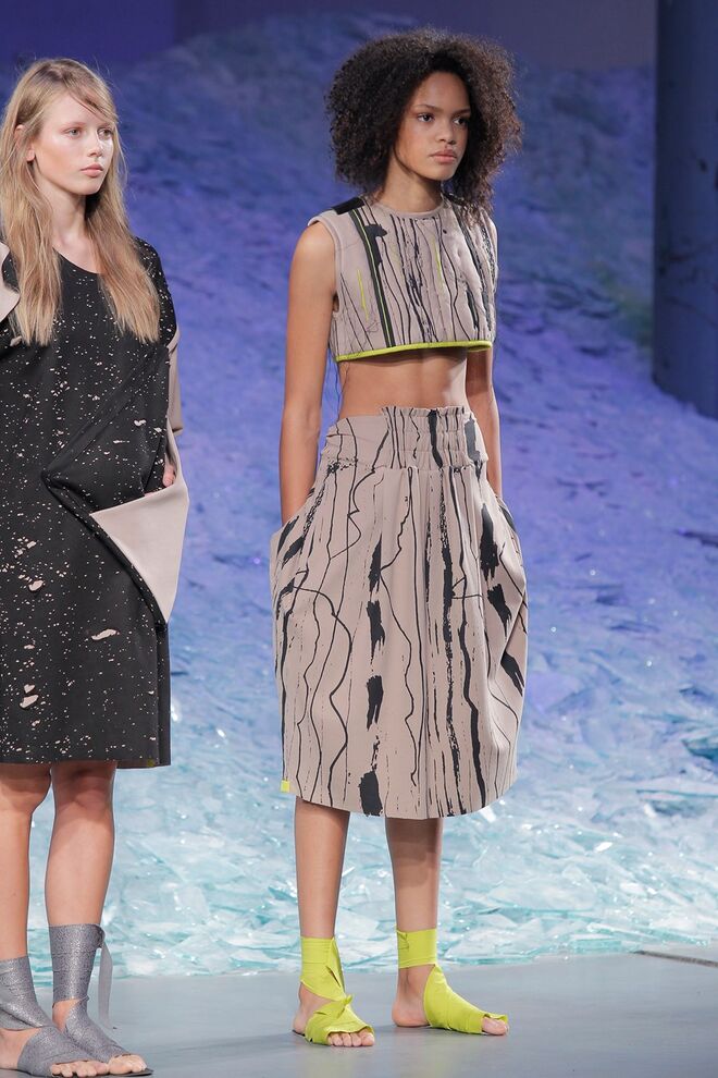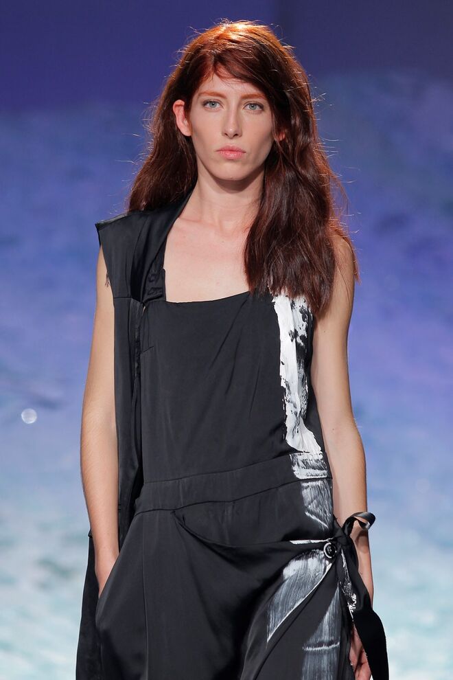 PATRÍCIA AUGUSTA "KUSNTFORMEN DER NATUR" A coleção remete para os tesouros retirados do fundo do mar e apresentados no livro de ilustrações científicas "kUNSTFORMEN DER NATUR", da autoria do biólogo alemão Ernst Haeckel. As formas e volumes são de inspiração fóssil e orgânica, e os materiais espelham as construções complexas e rígidas contrabalançadas pela estrutura delicada dos plissados. A paleta reflete a atmosfera existente no livro, apoiando-se em preto, branco e cinzentos, pontuados por um bordeaux.