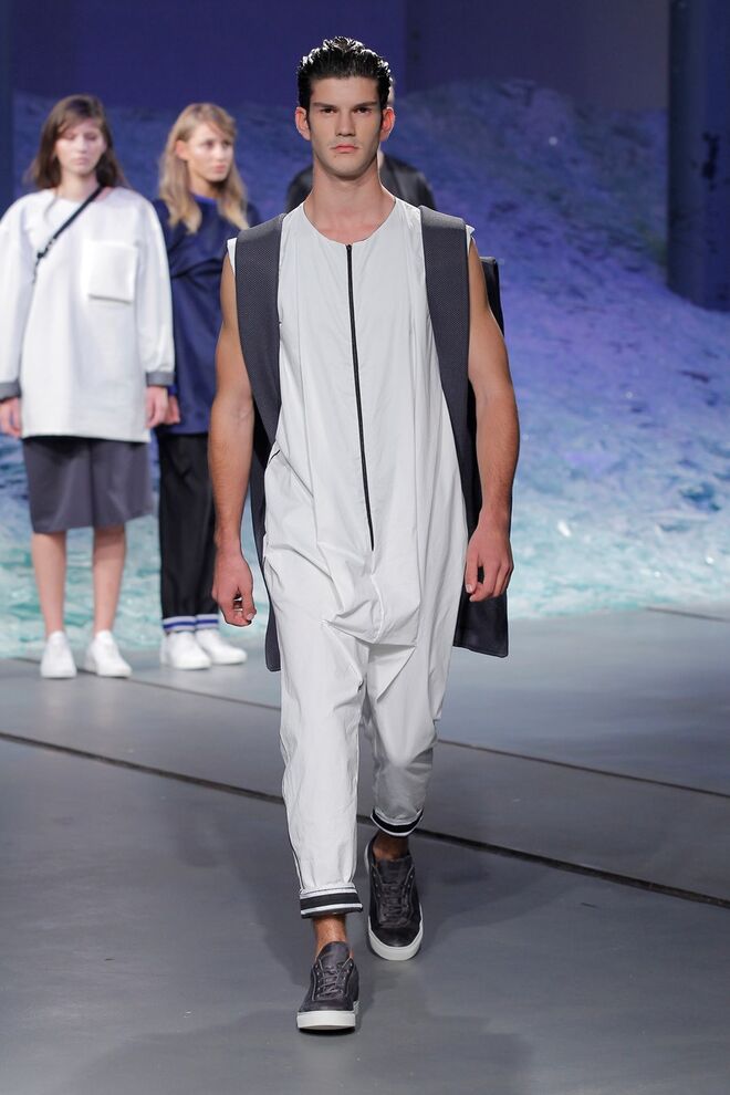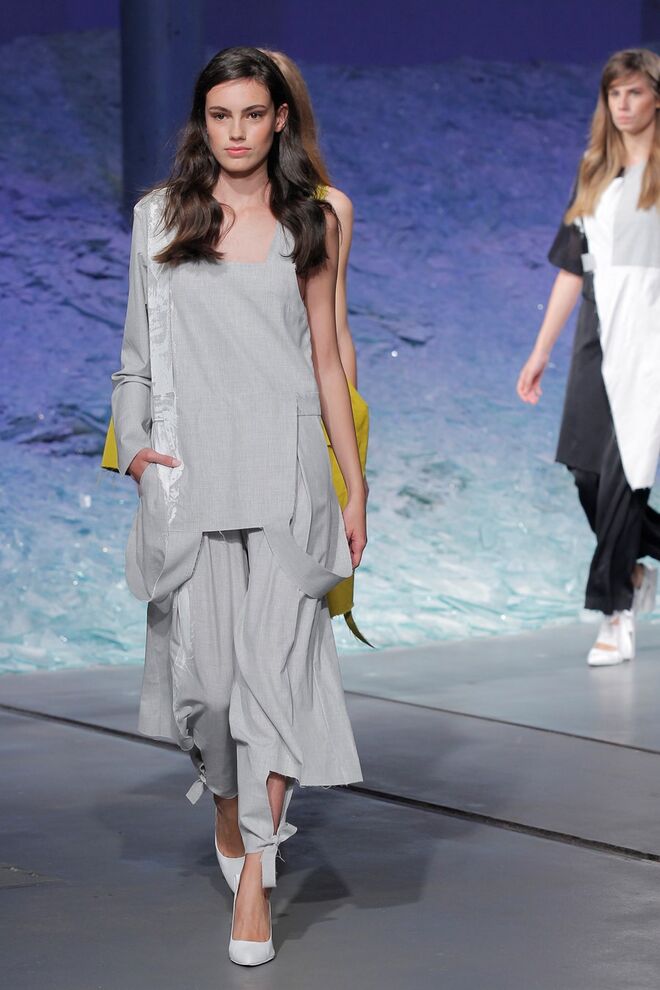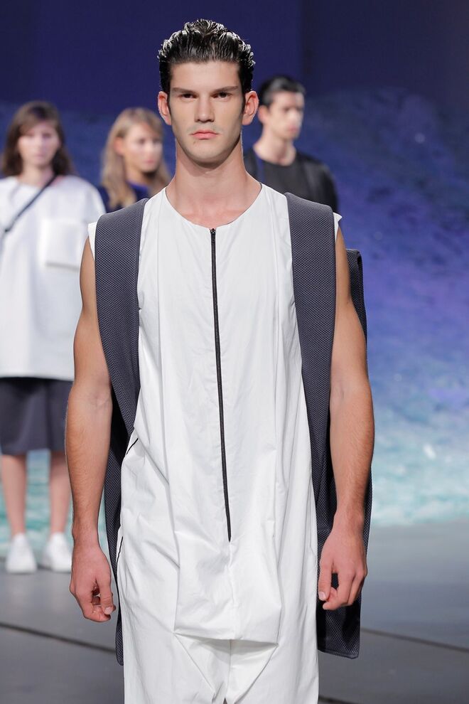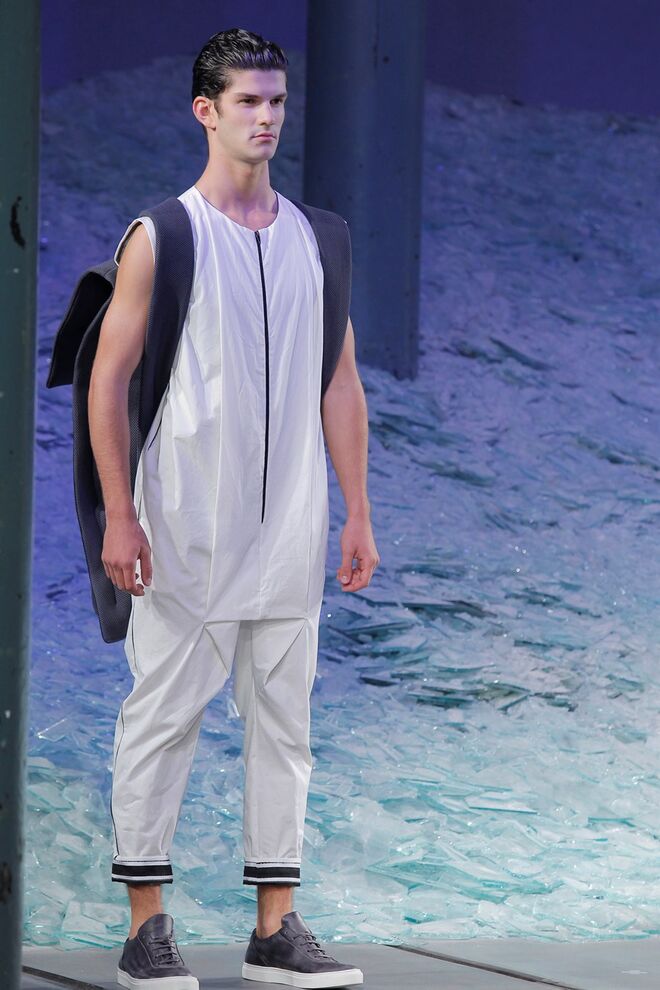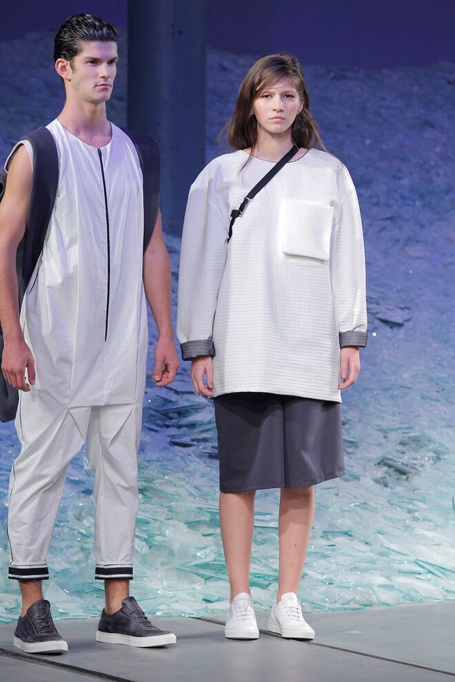 ÁREA 8 – SÉRGIO SOUSA "DODECAPHONISM" A música minimal instrumental nasce do experimentalismo, do processo onde as repetições não são percetíveis e do serialismo dodecafónico, ou seja um método de composição baseado numa escala de doze tons cromáticos criada por Schoenberg. Daqui surge Dodecaphonism, uma coleção unisexo que adapta o conceito de Schoenberg através da sobreposição de layers em tons neutros, e de uma construção retangular, que por vezes se torna impercetível com a fluidez de alguns materiais nas peças e nos pormenores.